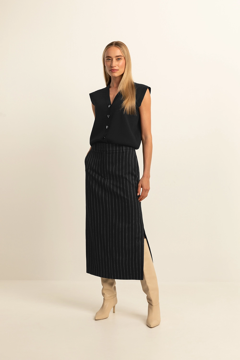 Zwarte krijtstreep rok – stretchkwaliteit met viscose. Slim-fit, rechte rok met hoge zijsplit links, kuitlengte. Zachte gebrushte twill, smalle dubbele krijtstreep. Een vrouwelijke timeless classic voor on duty & off duty looks. Tip: met de bijpassende blazer en pantalon haal je een veelzijdige co-ord set in huis.