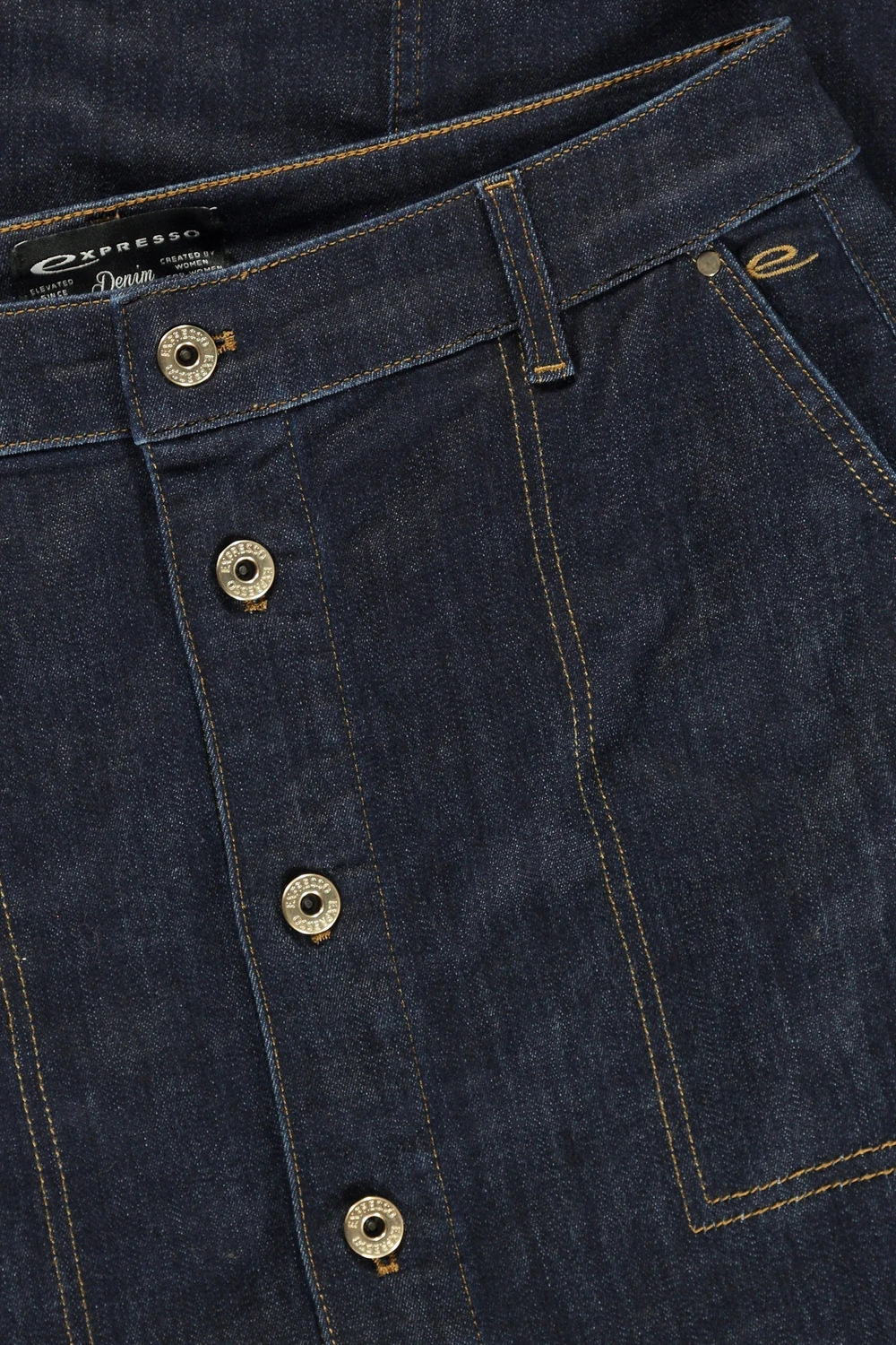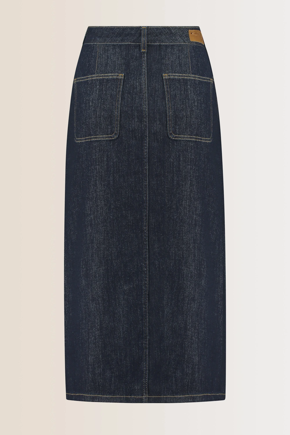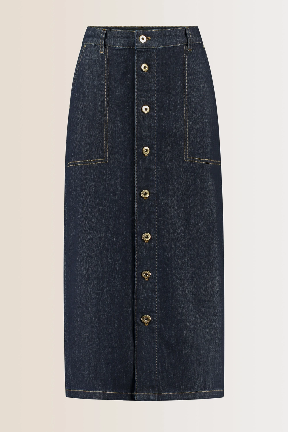 Donkerblauwe jeansrok – stretch katoenmix. Rechte rok, doorknoopsluiting, kuitlengte. Stevige stretch-denim, donkere wassing, goudkleurige jeansknopen. Edgy, casual en een tikkeltje chic: deze jeansrok is het allemaal. Tip: ga voor een dark-denim capsule met de bijpassende blouse en chino.