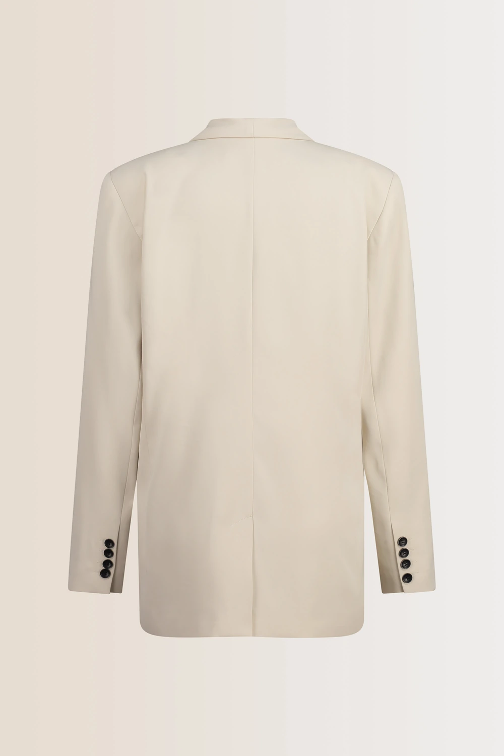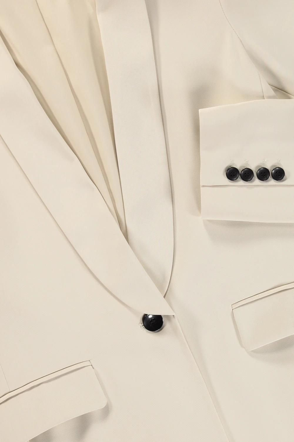Zandkleurige blazer – gladde stofmix. Licht getailleerde fit, met opvallende shawlkraag en klepzakken. Luxe afwerking met een enkele zwarte knoop en manchetten met knopen. Perfect voor zowel zakelijke als feestelijke gelegenheden: draag met een bijpassende pantalon voor een chique co-ord look.