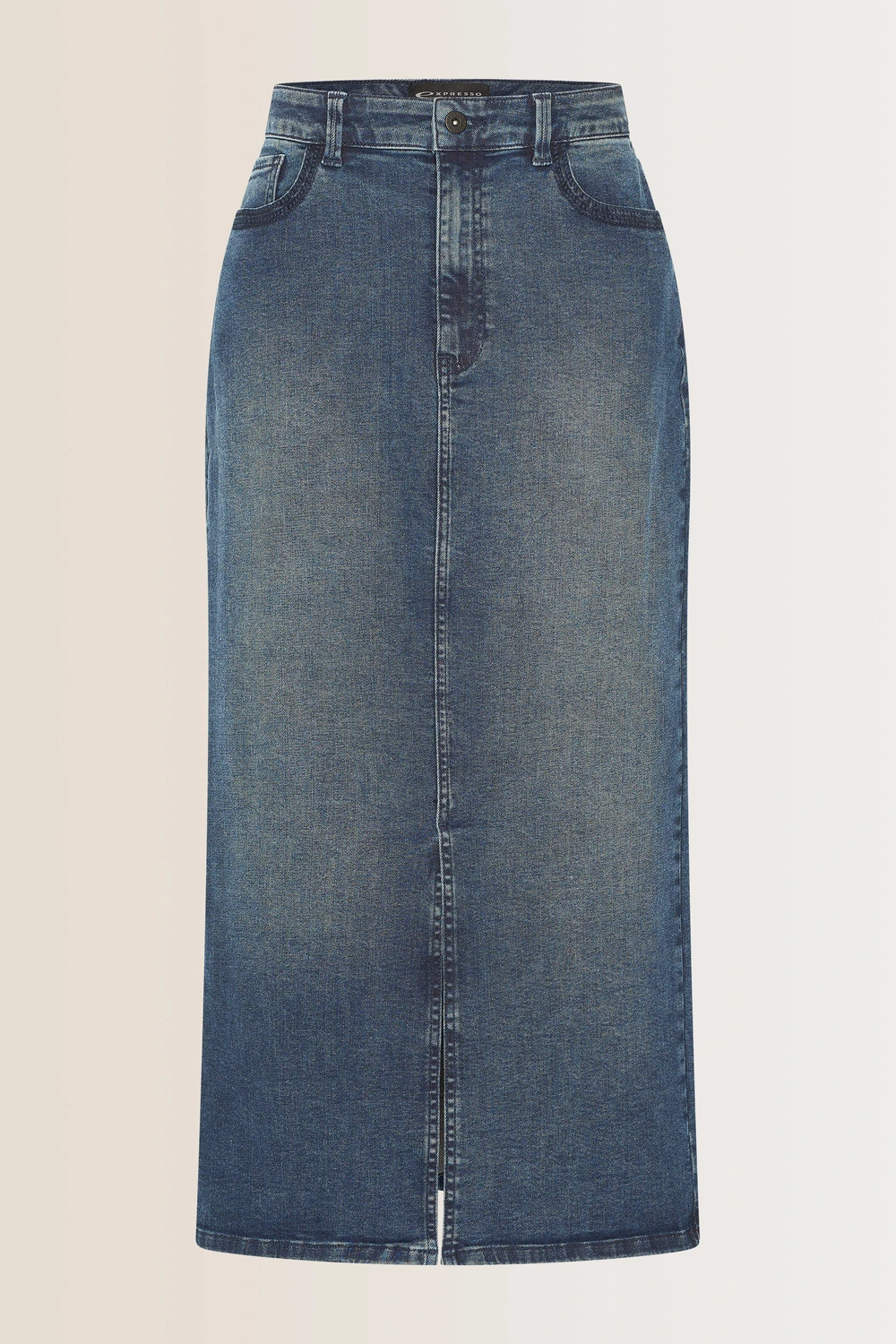 Blauwe denim kokerrok – stretch katoenmix. Middelhoge taille, aansluitende pasvorm, lengte tot onder de knie. Deze kokerrok van stretch-denim biedt een flatterende, vrouwelijke vorm met een casual uitstraling. De subtiele stonewash wassing geeft de rok een vintage touch. De ideale keuze voor een veelzijdige look, perfect te combineren met een blouse of een casual T-shirt.
