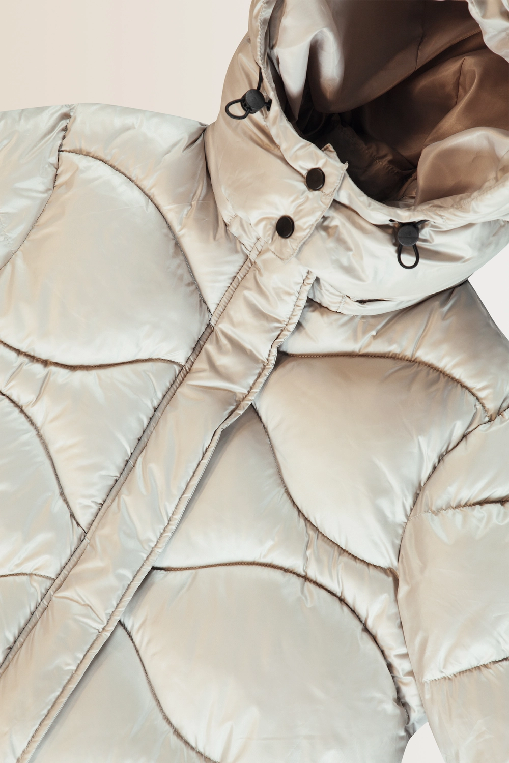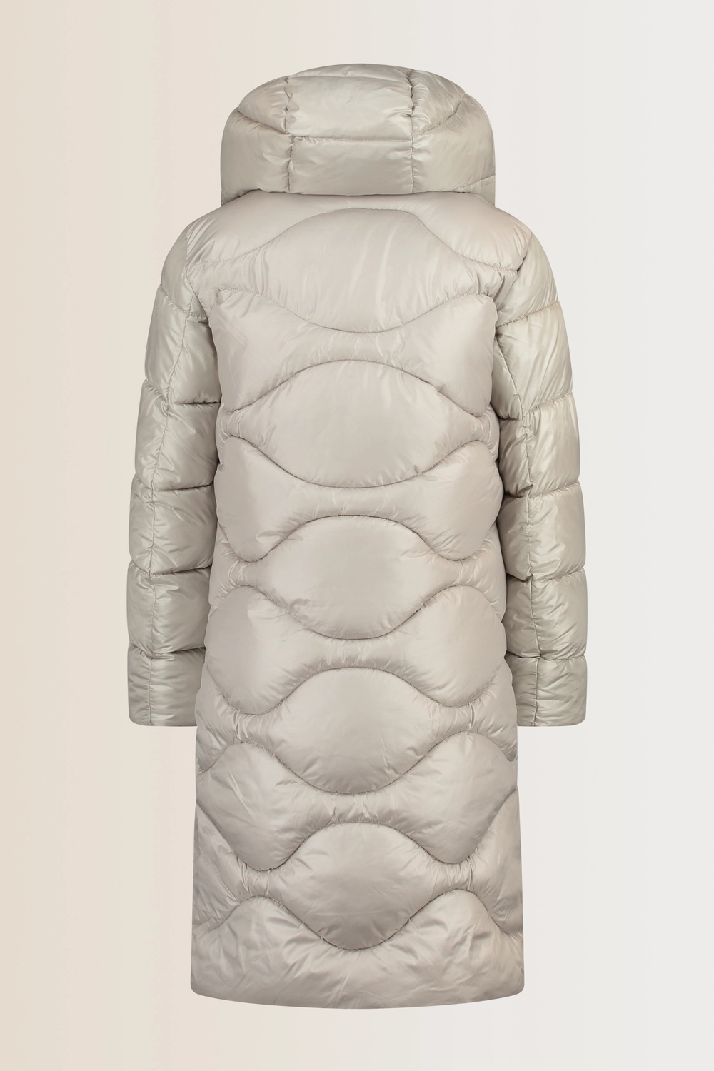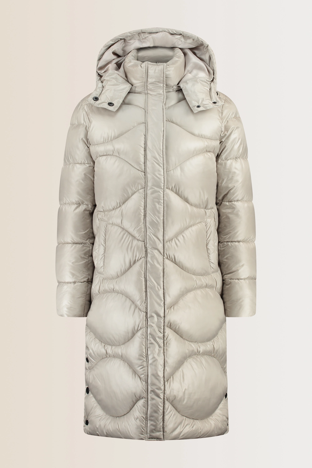 Gewatteerde jas – vervaardigd uit een glanzende waterafstotende stof met royale ruitstiksel. Het rechte, lange model biedt comfort en warmte, terwijl de afneembare capuchon met verstelbare trekkoorden zorgt voor extra bescherming. De verborgen ritssluiting en steekzakken geven een strakke, moderne look. Een praktische winterjas die stijl en functionaliteit combineert.