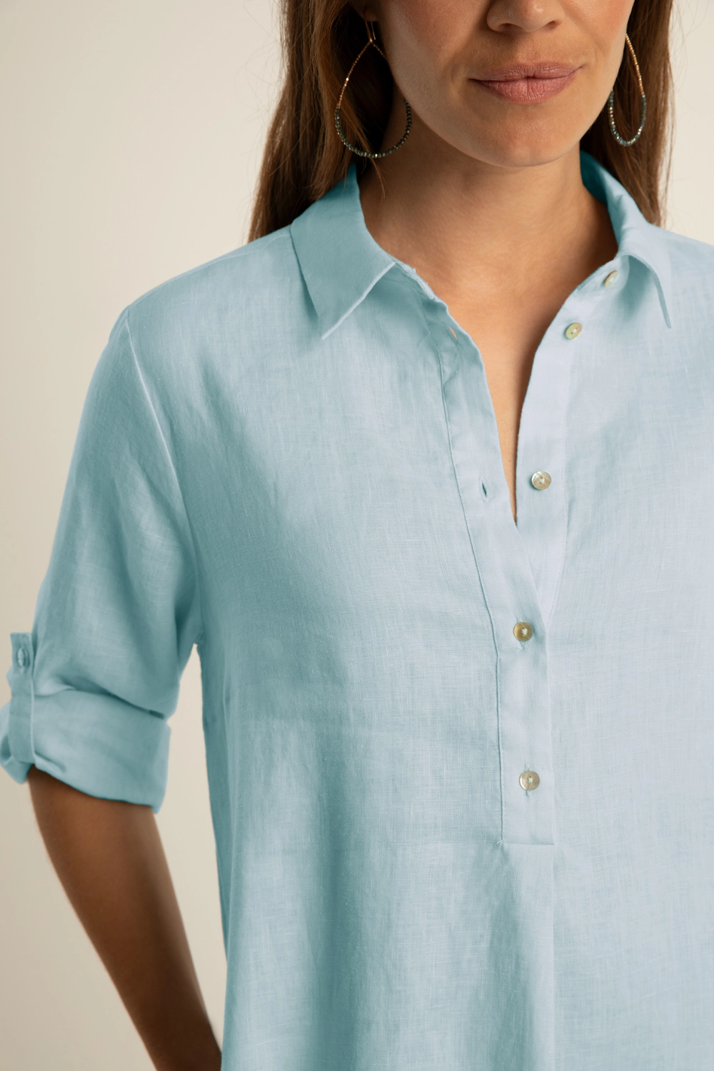 • Oprolbare mouwen met knoopdetail
