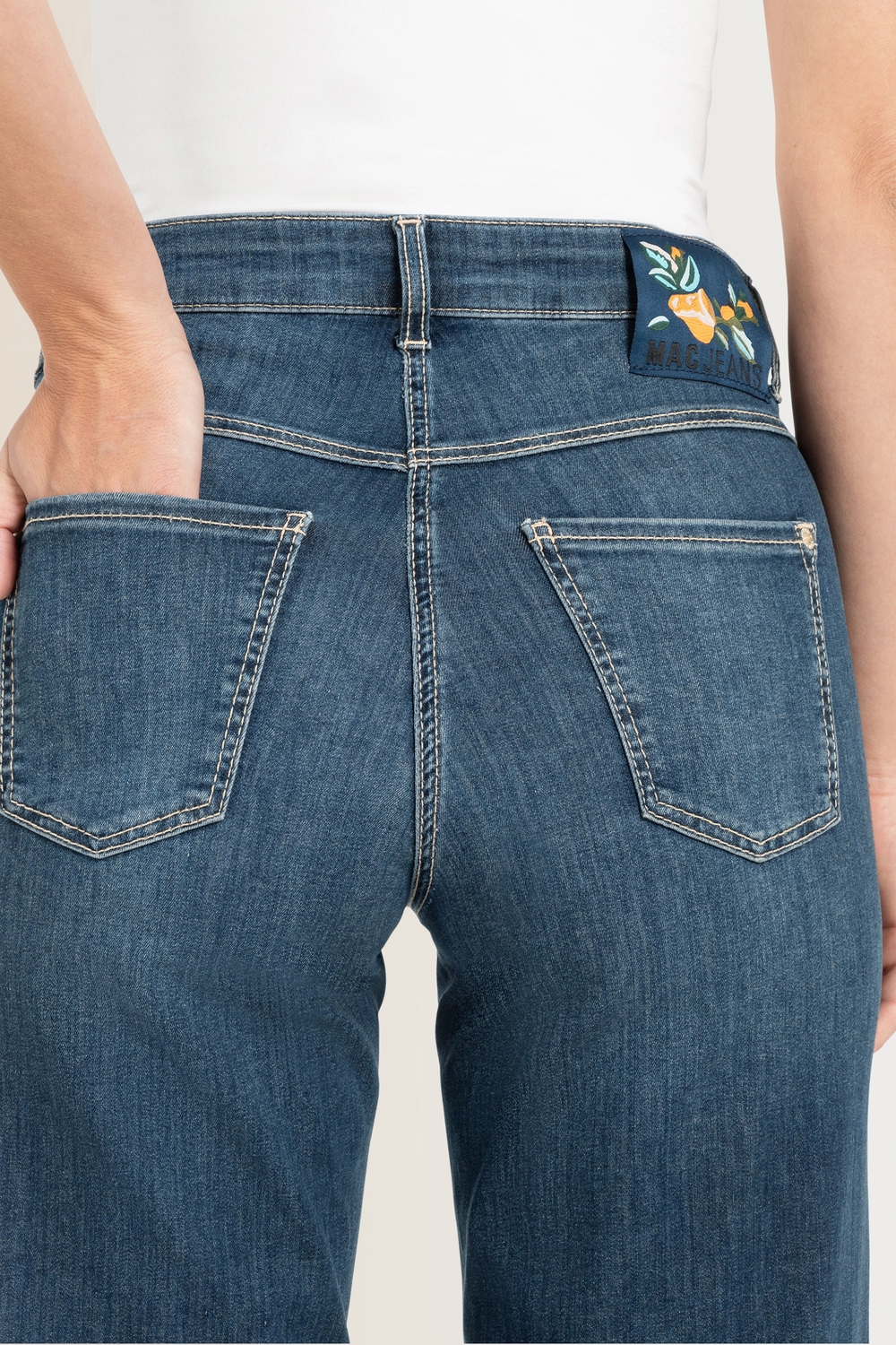 Blauwe jeans in model DREAM WIDE van MAC – Lichtgewicht soft touch denim met een zachte stretch. Slank op het bovenbeen en elegant uitlopend vanaf de knie voor dat lengende, vrouwelijke silhouet. De frisse wassing geeft een moderne, optimistische look, terwijl de comfortabele fit moeiteloos met je meebeweegt. Mid-waist taille Shaping-effect 5-pocket model Comfort stretch denim Riemlussen