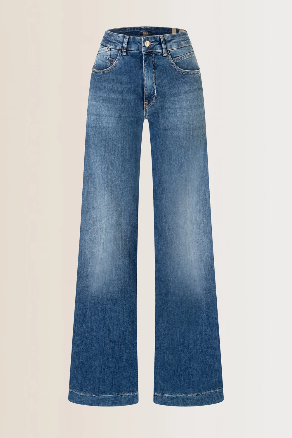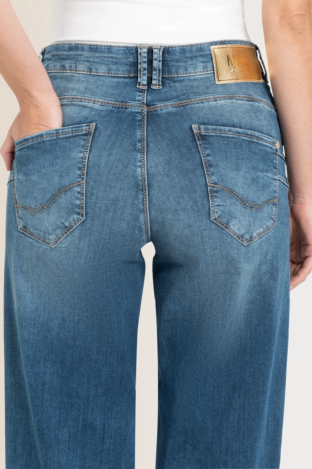 Middenblauwe wide leg jeans in model RICH PALAZZO – soft touch denim met een zachte wassing en een moderne, elegante look. De jeans zit mooi op de taille en valt losjes langs het been voor een lengte-effect. De subtiele fading geeft een stoere touch, terwijl de wijde pijpen juist zorgen voor een verfijnde balans. Wide leg fit Mid waist 5-pocket model Riemlussen