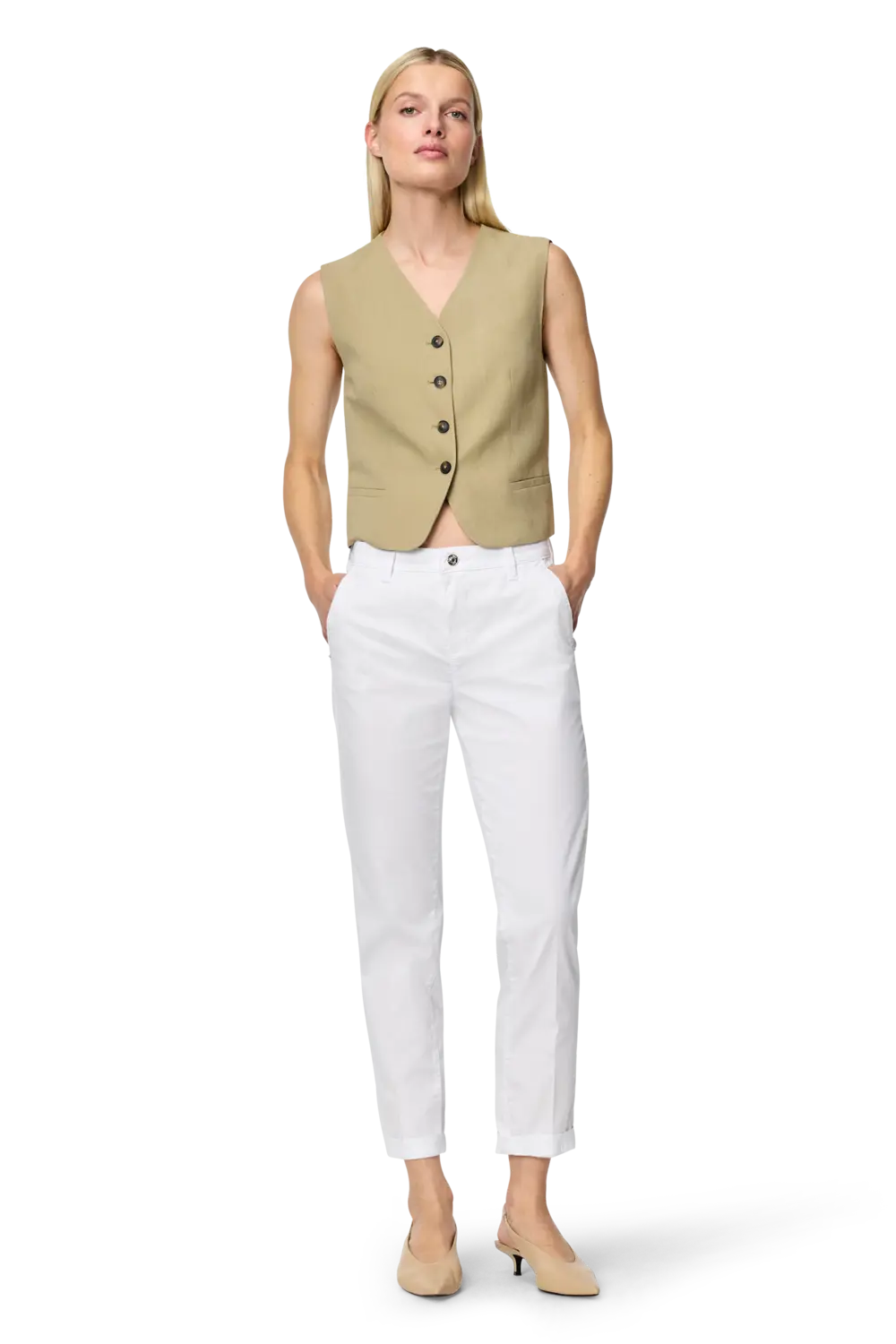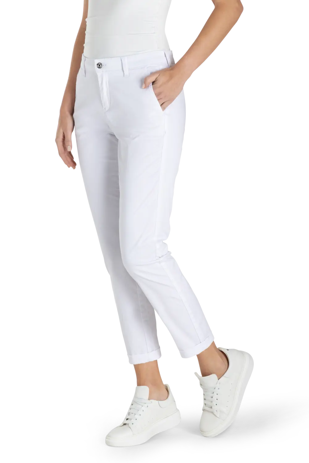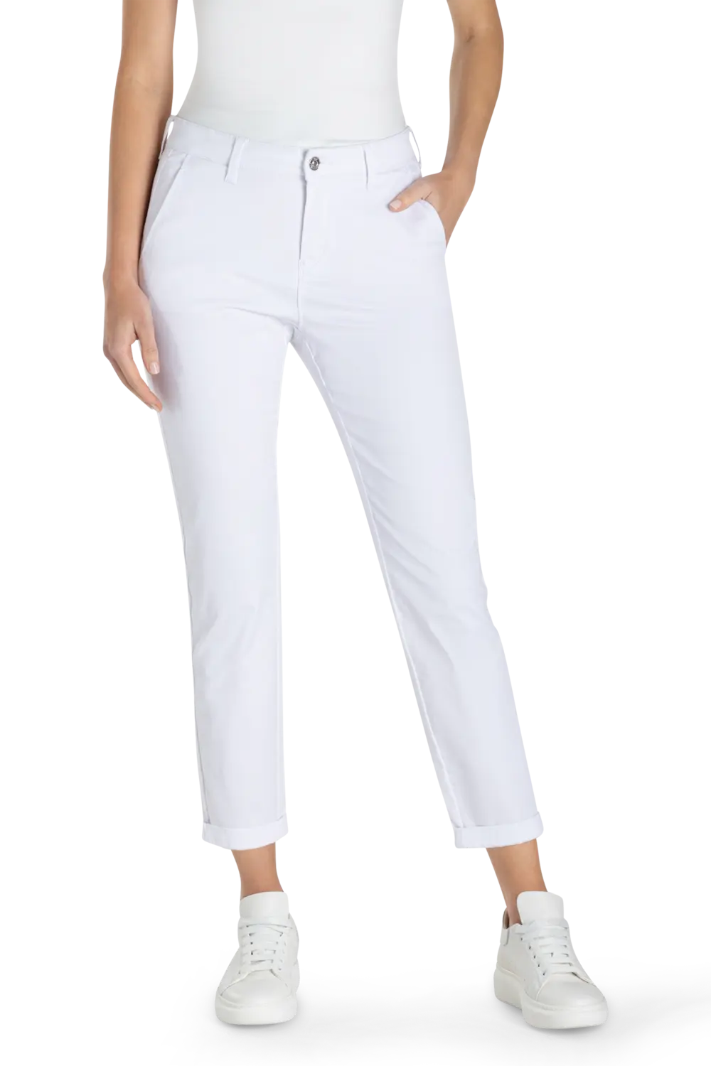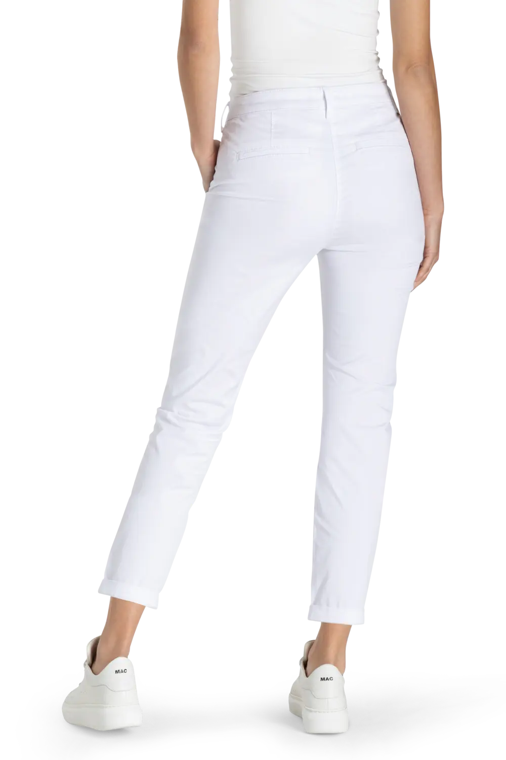 Witte Turn Up Chino van MAC– authentic stretch gabardine met een subtiele glans. Slim fit met een slim leg, smal toelopende pijp en gemiddelde taillehoogte. De prettige taille en hoogwaardige katoenkwaliteit met elastaan zorgen voor een comfortabele pasvorm met uitstekende vormvaste rek. De fijne, flatterende strijkvouwen en subtiel omgeslagen zoom geven deze chino een verzorgde, vrouwelijke uitstraling.