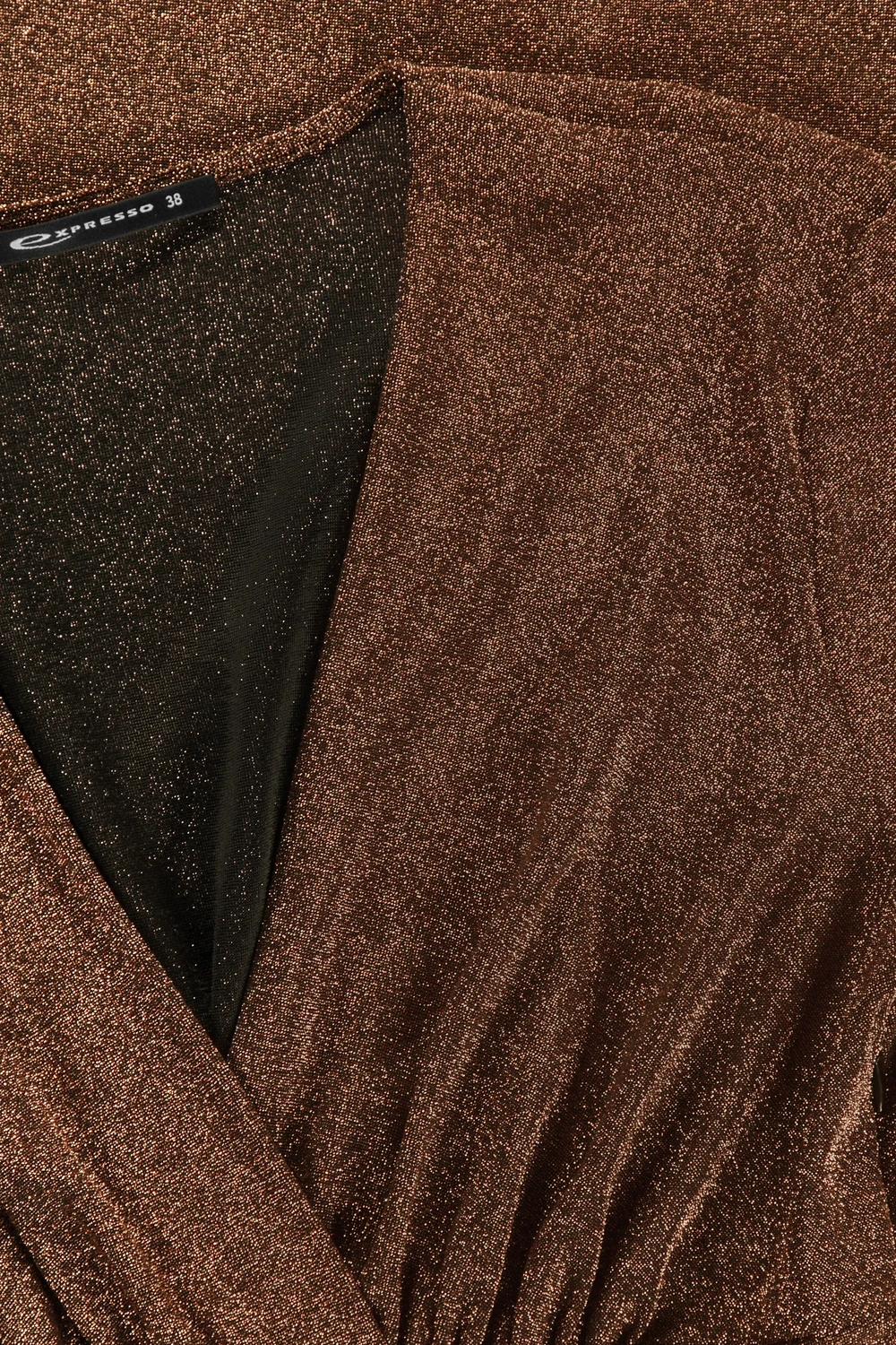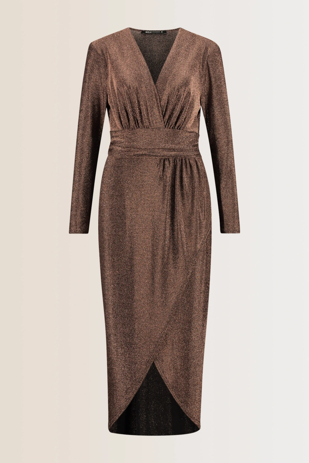 Bronzen midi-jurk – lurex jersey. Elegante tailleband, geplooide details, met V-hals en overslagrok. Dit schitterende ontwerp accentueert je vrouwelijke silhouet door de flatterende taille en subtiele glans. Perfect voor een avondje uit: comfort en glamour in één.