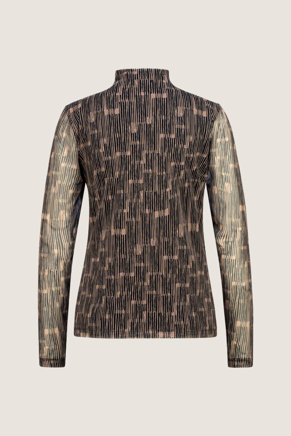 Top met print – stretch mesh. Nauwsluitend, aangesneden kraag, lange mouwen. Een chique top met een gevoerde body en semi-transparante mouwen. Combi-tip: de nauwsluitende kokerrok met hoge taille.