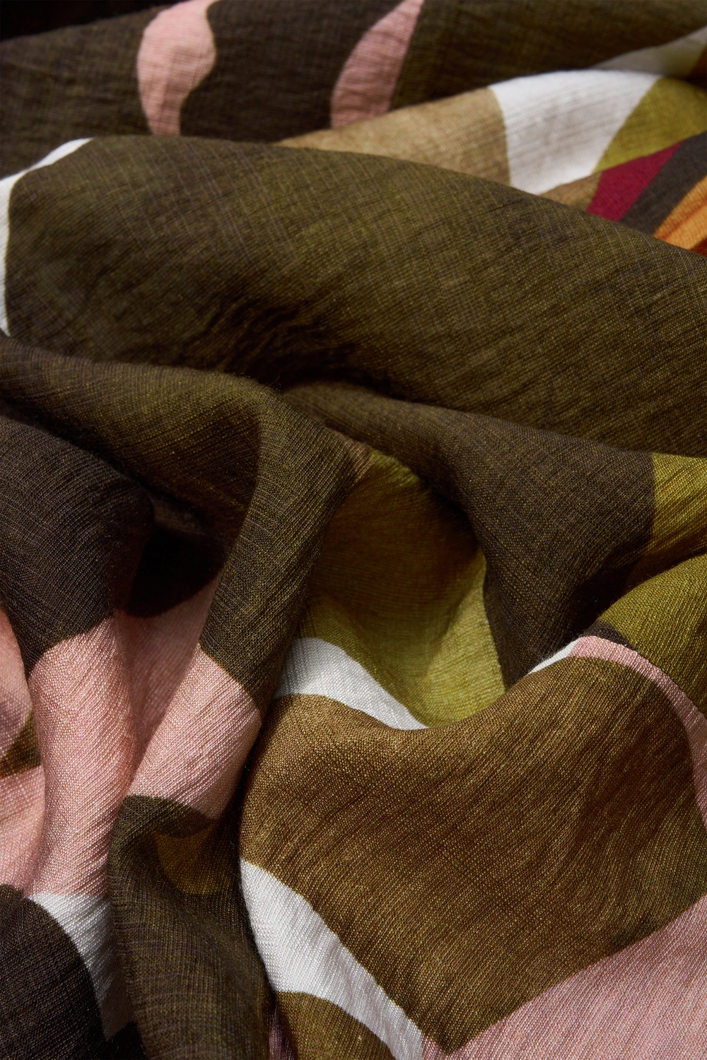 Jurk met multicolor print – luchtige, soepelvallende kwaliteit met een levendige uitstraling. Lang en vrouwelijk vallend, met een V-hals, korte mouwen met strikdetail en een elastische taille die het silhouet mooi accentueert. De grote print in roze, olijfgroen, bruin en warme oranjetinten geeft deze jurk een opvallend karakter, terwijl de lichte stof sierlijk meebeweegt. Een stijlvolle eyecatcher die moeiteloos elegantie en comfort samenbrengt.