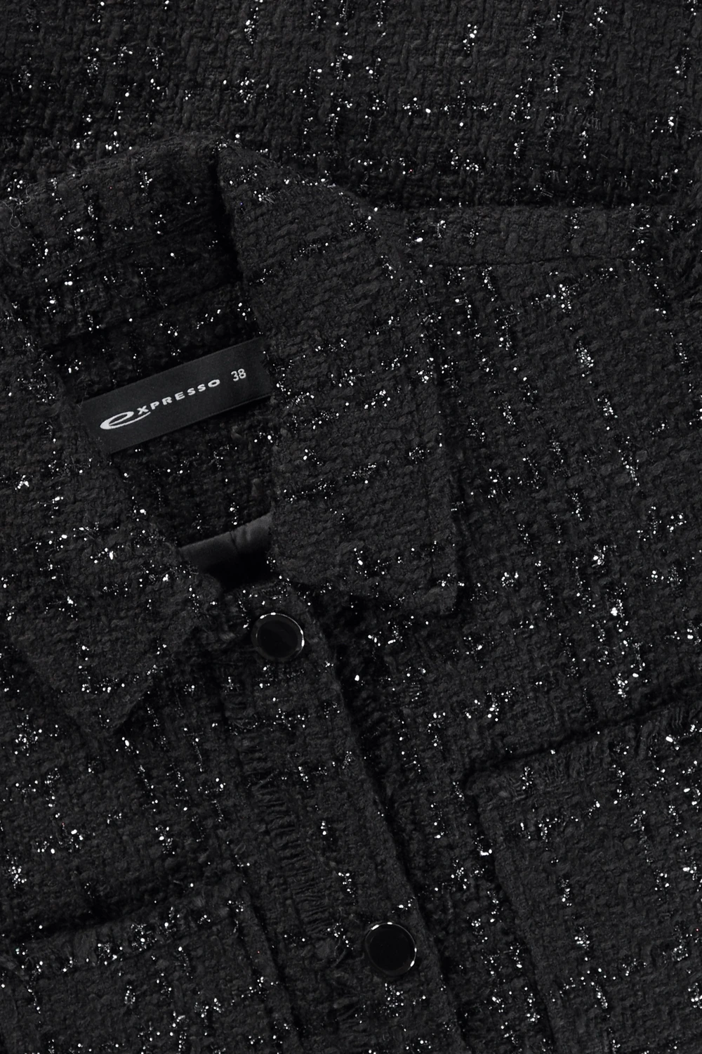 Zwarte mouwloze blazer – bouclé met lurex. Recht & relaxed, doorknoopsluiting, opgestikte zakken. Structuurgeweven bouclé, rafelrandjes. Klassiek met een moderne edge. Combineer trendy met jeans of office-chic met de bijpassende minirok.