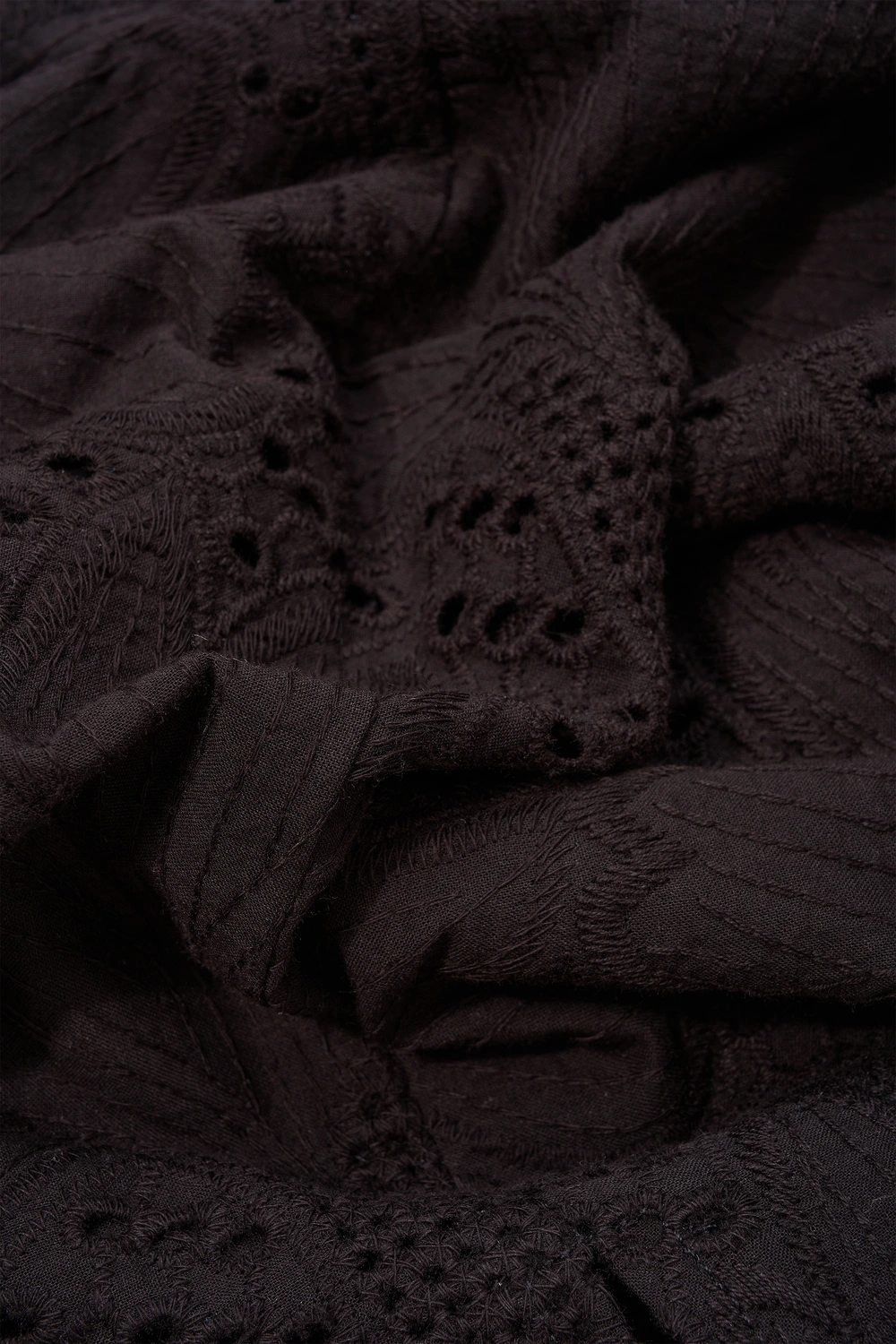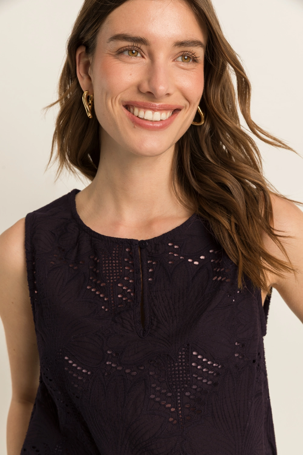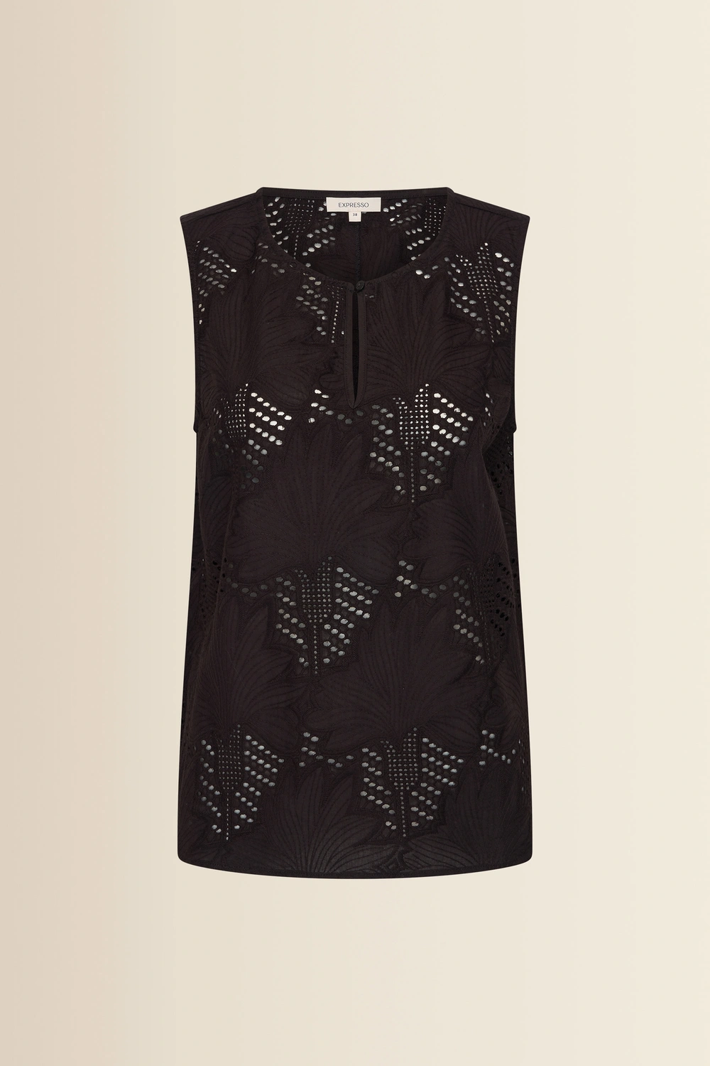 Zwarte top met broderie – luchtige katoenkwaliteit met een rijk geborduurd dessin en opengewerkte details. Losvallend en vrouwelijk, met een ronde hals en een subtiele split met knoopsluiting. De verfijnde broderie geeft deze top een frisse, zomerse uitstraling, terwijl de luchtige stof heerlijk draagt op warme dagen. Een elegant item dat je moeiteloos combineert.