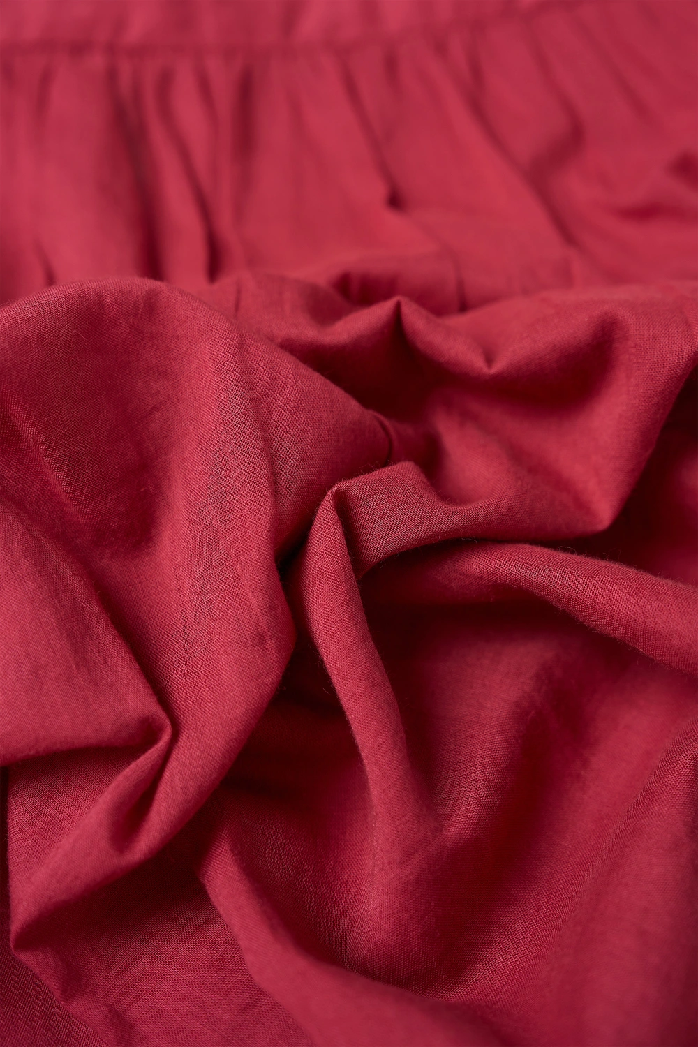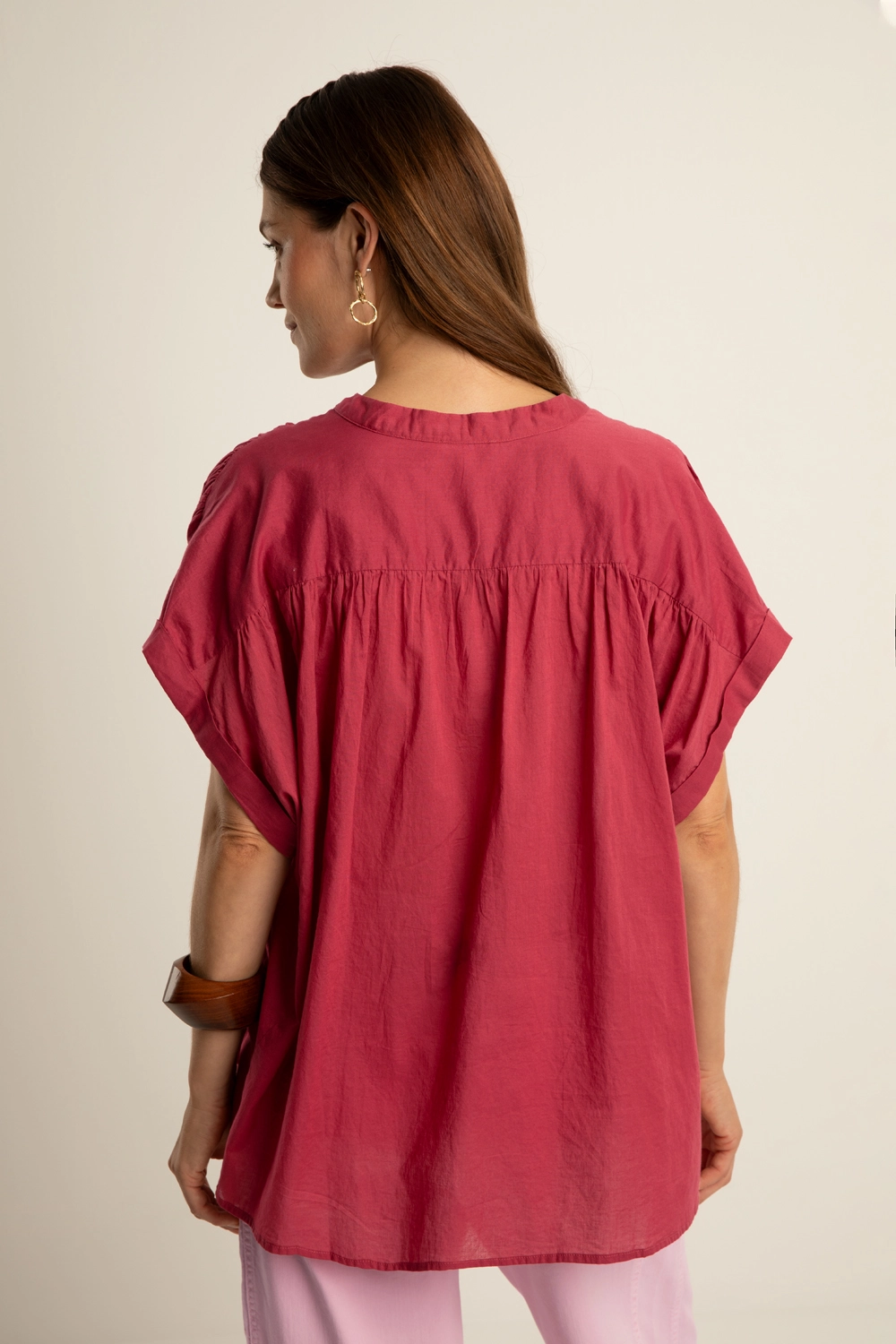 Rode katoenen blouse – luchtige, soepelvallende kwaliteit met een zachte glans. Relaxed en ruimvallend, met een opstaande hals met V-split, korte aangeknipte mouwen en fijne plooidetails op de schouders en rug. De losse fit en vloeiende stof geven deze blouse een vrouwelijke uitstraling met een nonchalant-chique gevoel.