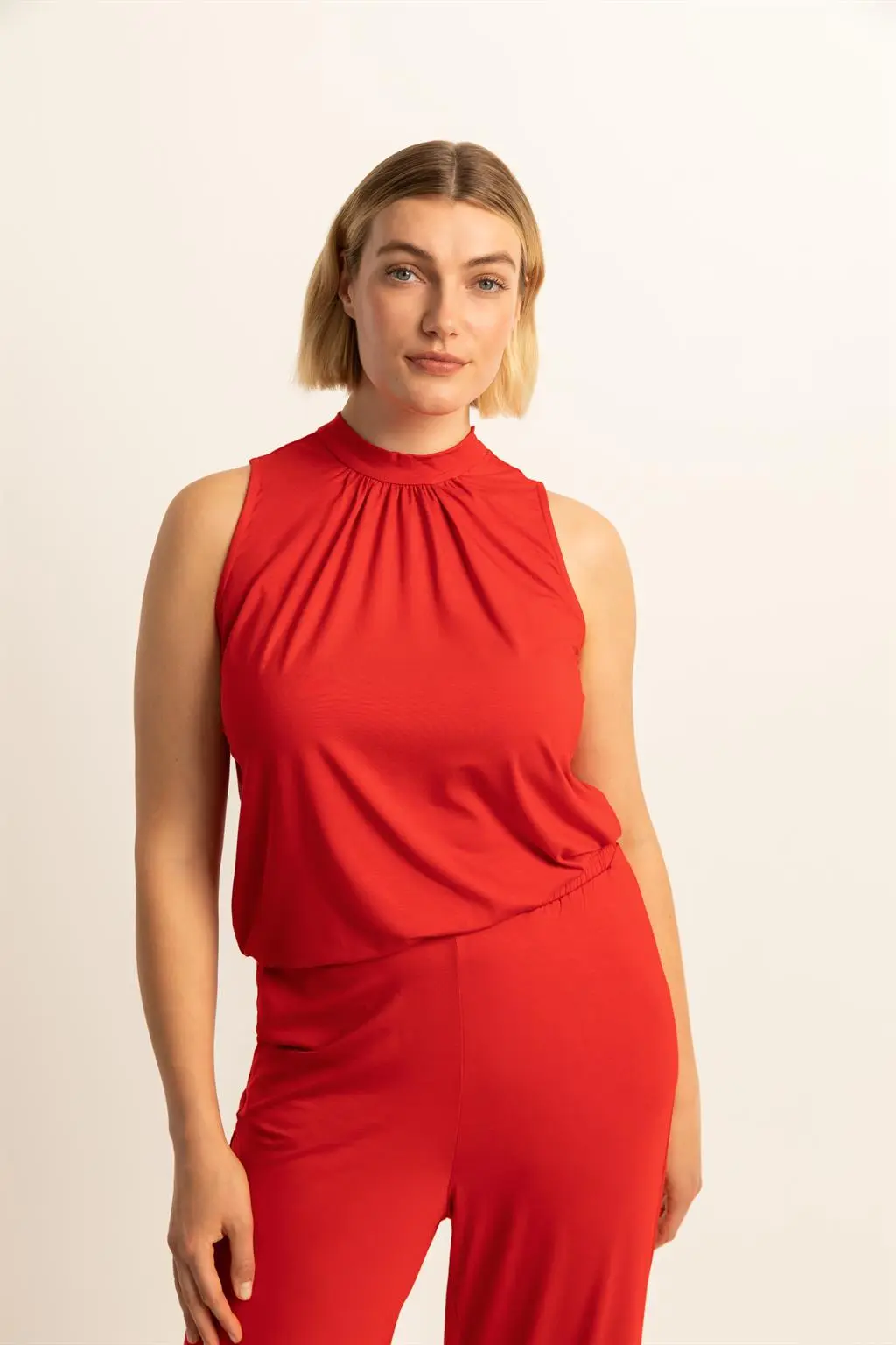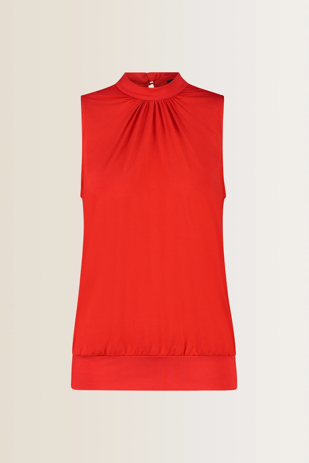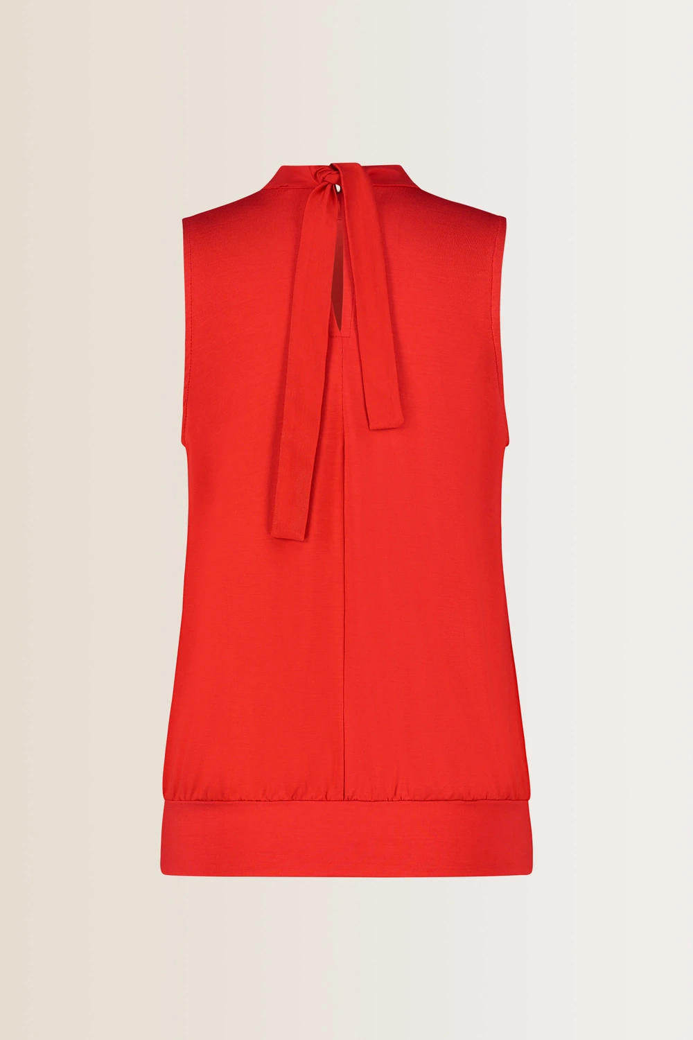Rode mouwloze top – stretchviscose. Relaxte bloezende pasvorm, halsboord met striksluiting achter, heuplengte. Soepele stretch-jersey. Met aangesloten zoomboord voor een flatterend silhouet. Combitip: de bijpassende culotte.