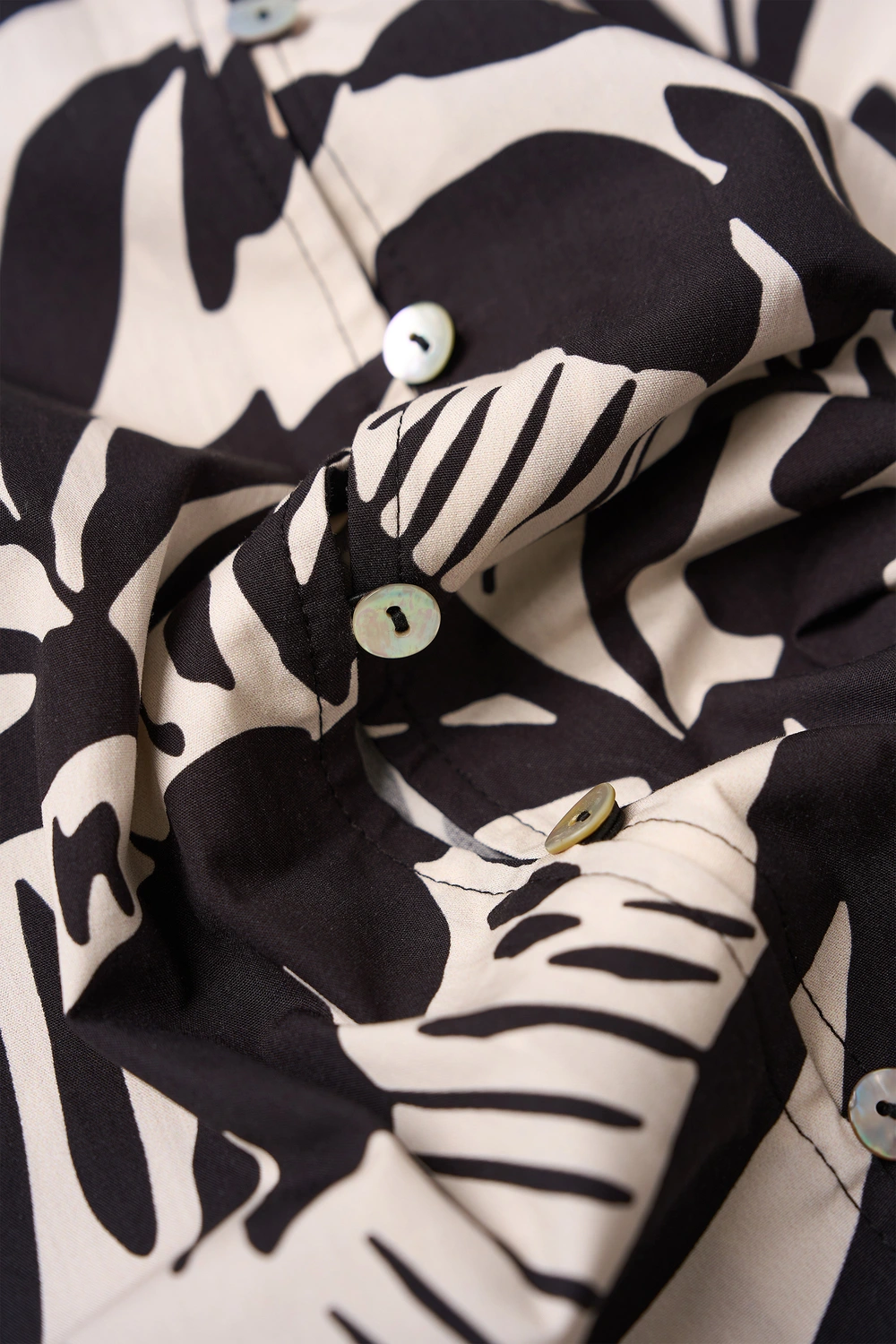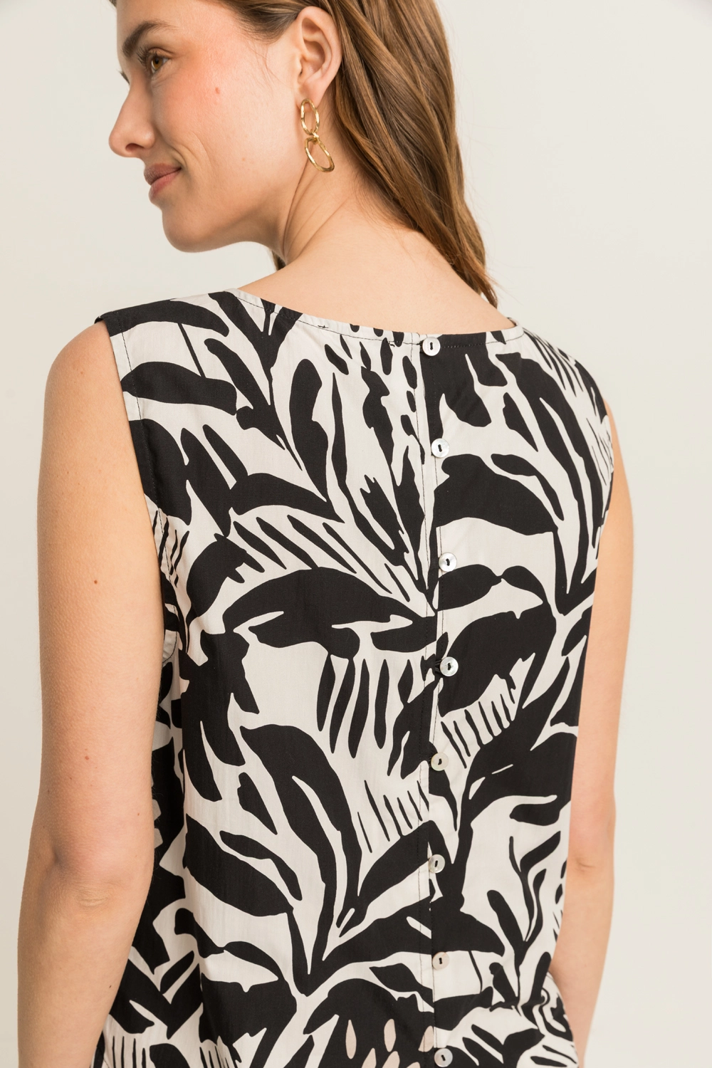 Zwart-witte top met print – luchtige, soepelvallende stof met een grafisch bladmotief. Mouwloos en losvallend, met een ronde hals en een knoopsluiting op de rug. De krachtige zwart-witcombinatie geeft deze top een moderne, expressieve uitstraling, terwijl de luchtige kwaliteit prettig draagt op warme dagen.