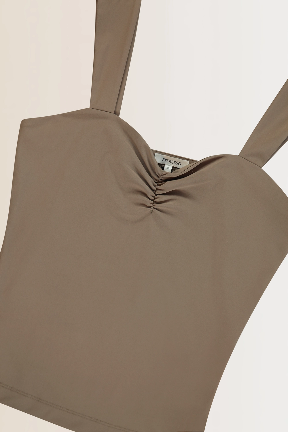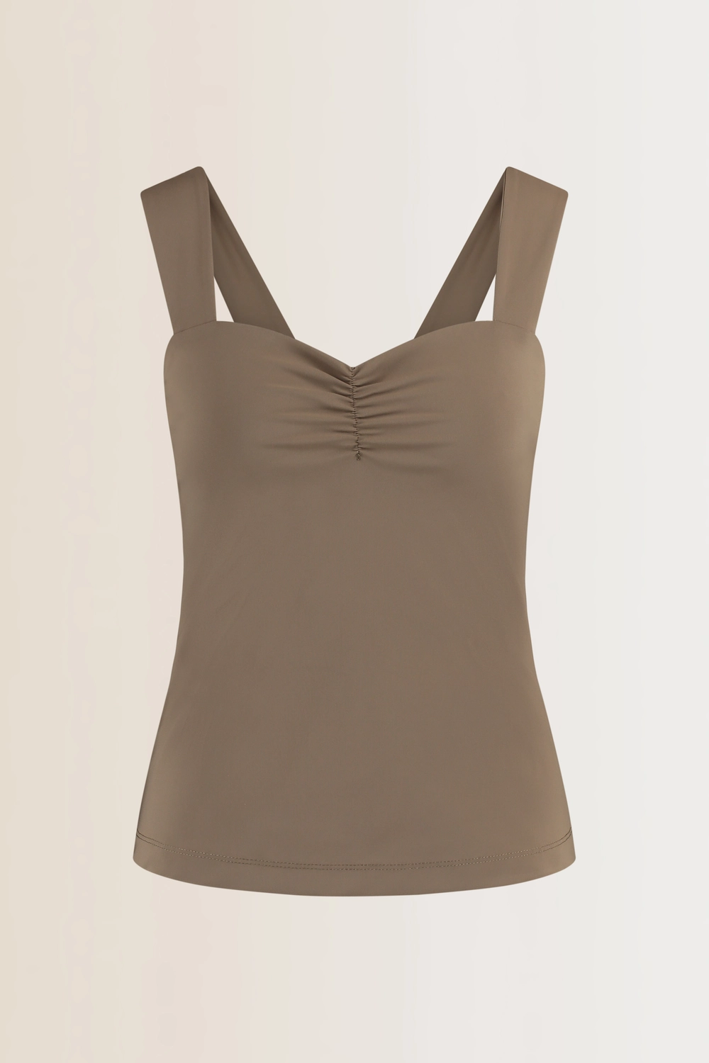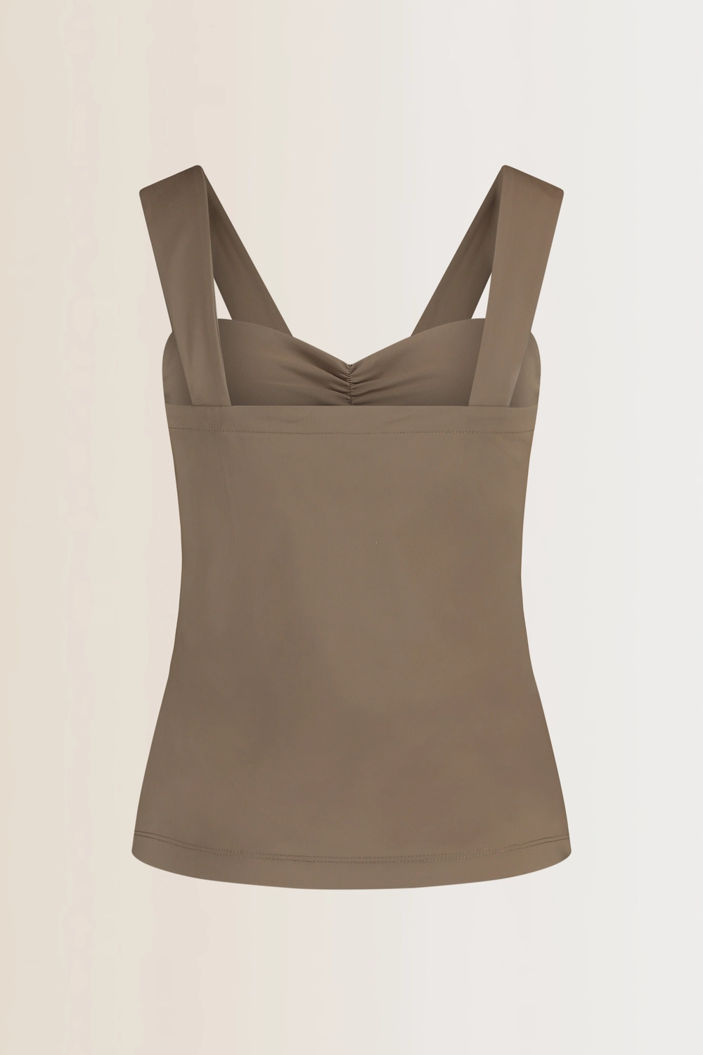 Bruine top – comfortabele travelkwaliteit met een subtiele V-hals en brede schouderbanden. Het aangesloten ontwerp zorgt voor een verfijnde pasvorm die voor elke gelegenheid de perfecte keuze is.
