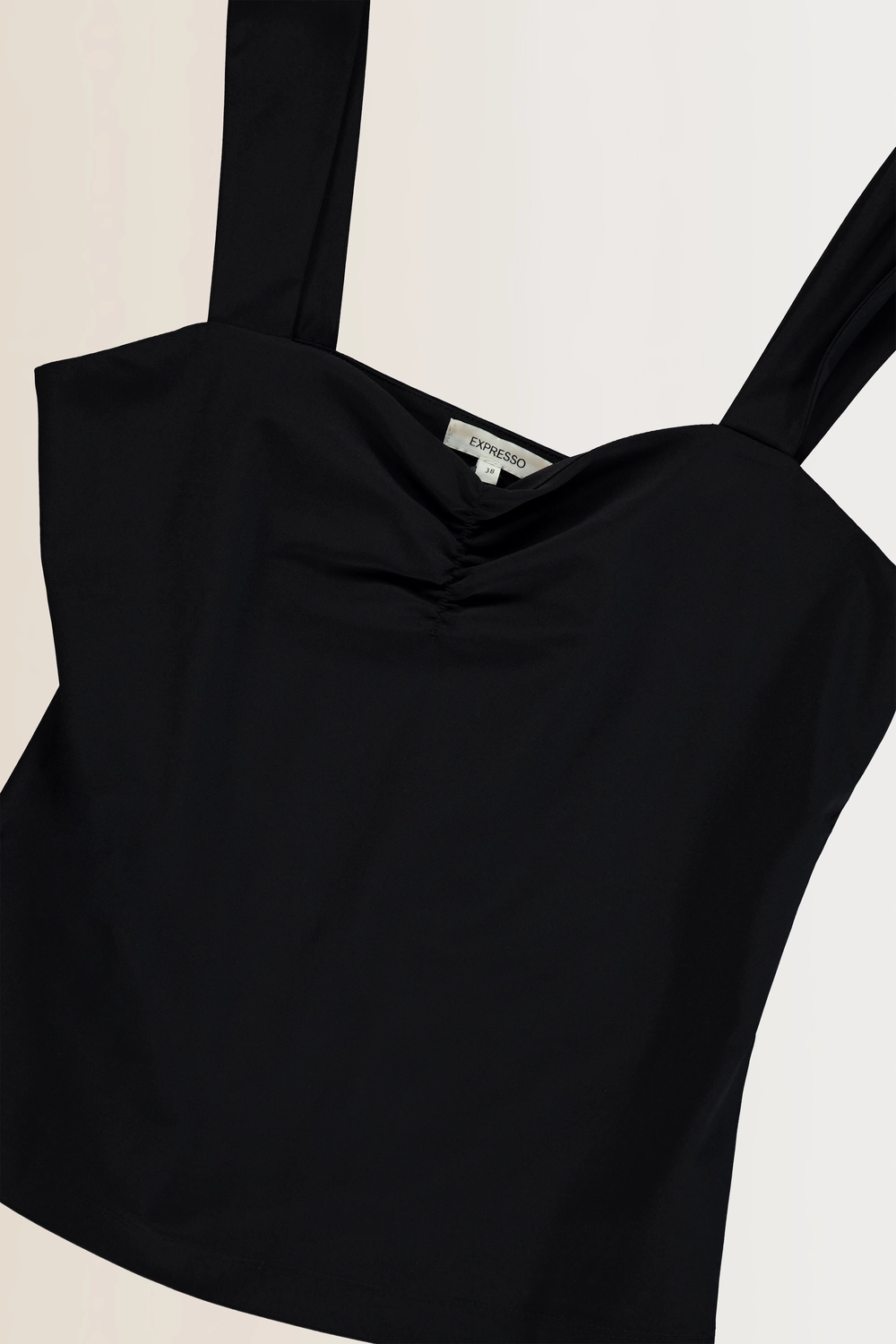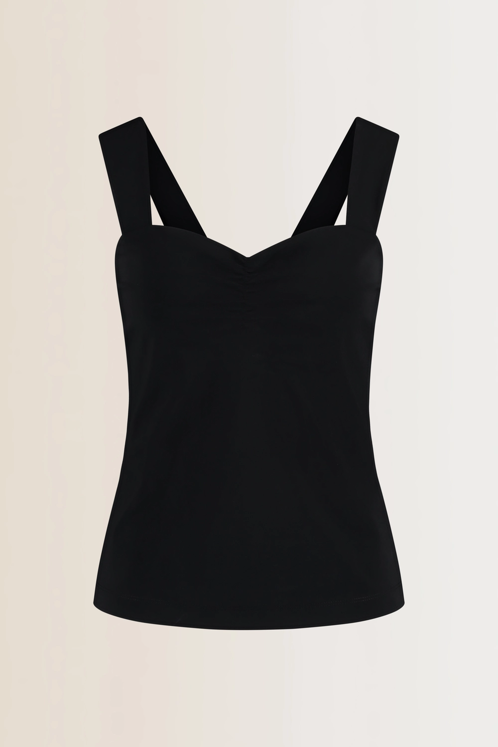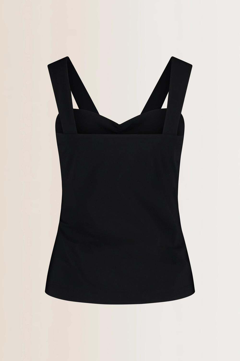 Zwarte top – comfortabele travelkwaliteit met een subtiele V-hals en brede schouderbanden. Het aangesloten ontwerp zorgt voor een verfijnde pasvorm die voor elke gelegenheid de perfecte keuze is.