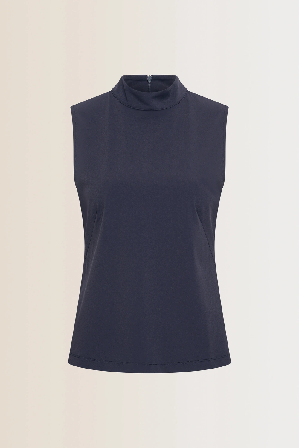 Donkerblauwe mouwloze top – soepelvallende travelkwaliteit met lichte stretch. Aansluitend bij de hals met een subtiele col, strak en elegant van snit. Perfect te combineren voor zowel kantoor als een avondje uit. De verfijnde afwerking en tijdloze kleur maken deze top een must-have basisstuk voor elke garderobe.