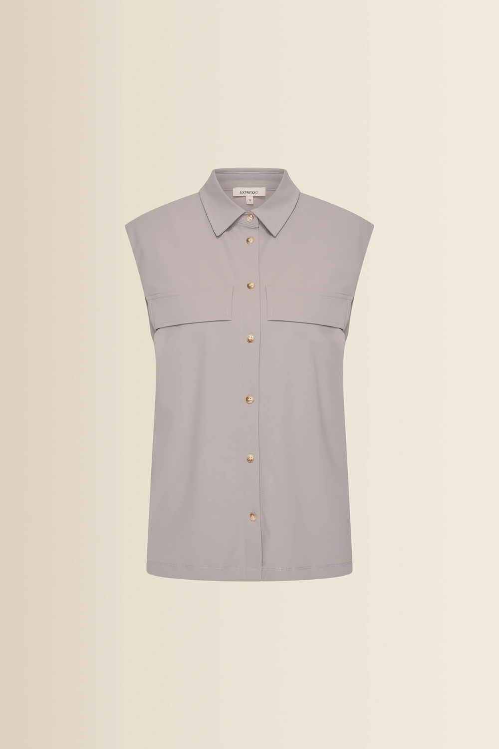 Grijze blouse – soepele travelkwaliteit met een gladde, verzorgde uitstraling. Relaxed fit, mouwloos en voorzien van een klassieke kraag met knoopsluiting. De borstzakken met klep geven de blouse een moderne utility touch, terwijl de zachte valling zorgt voor een vrouwelijke, comfortabele fit. Een fris item dat moeiteloos combineert en direct een stijlvolle basis vormt voor zomerse looks.