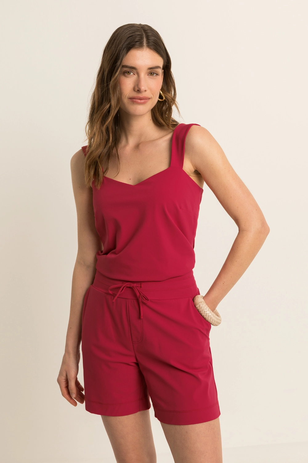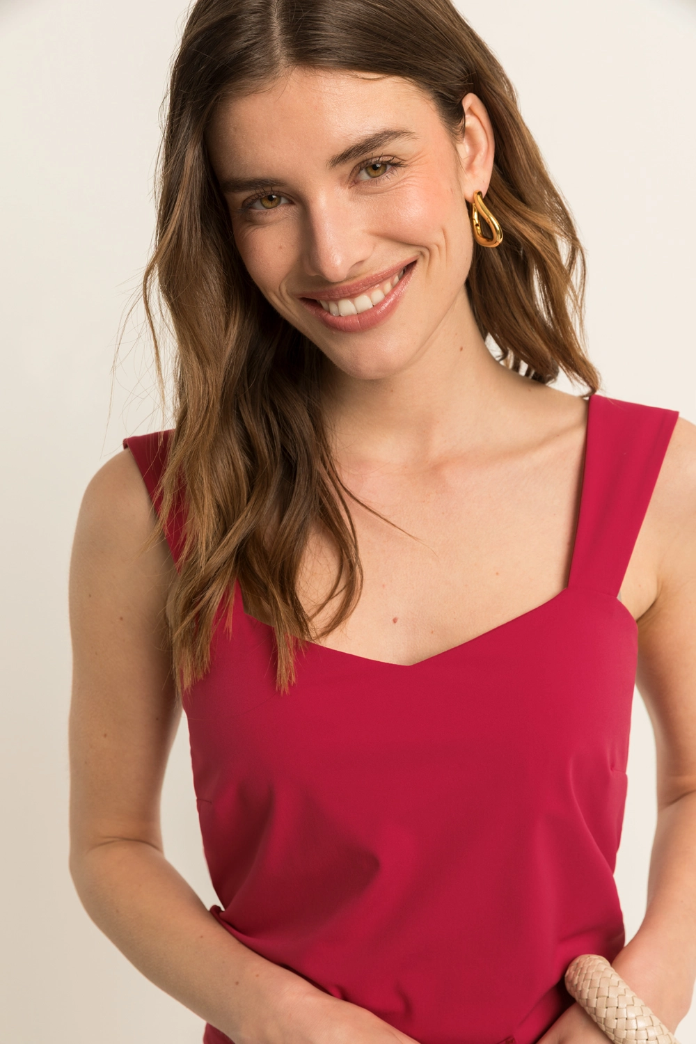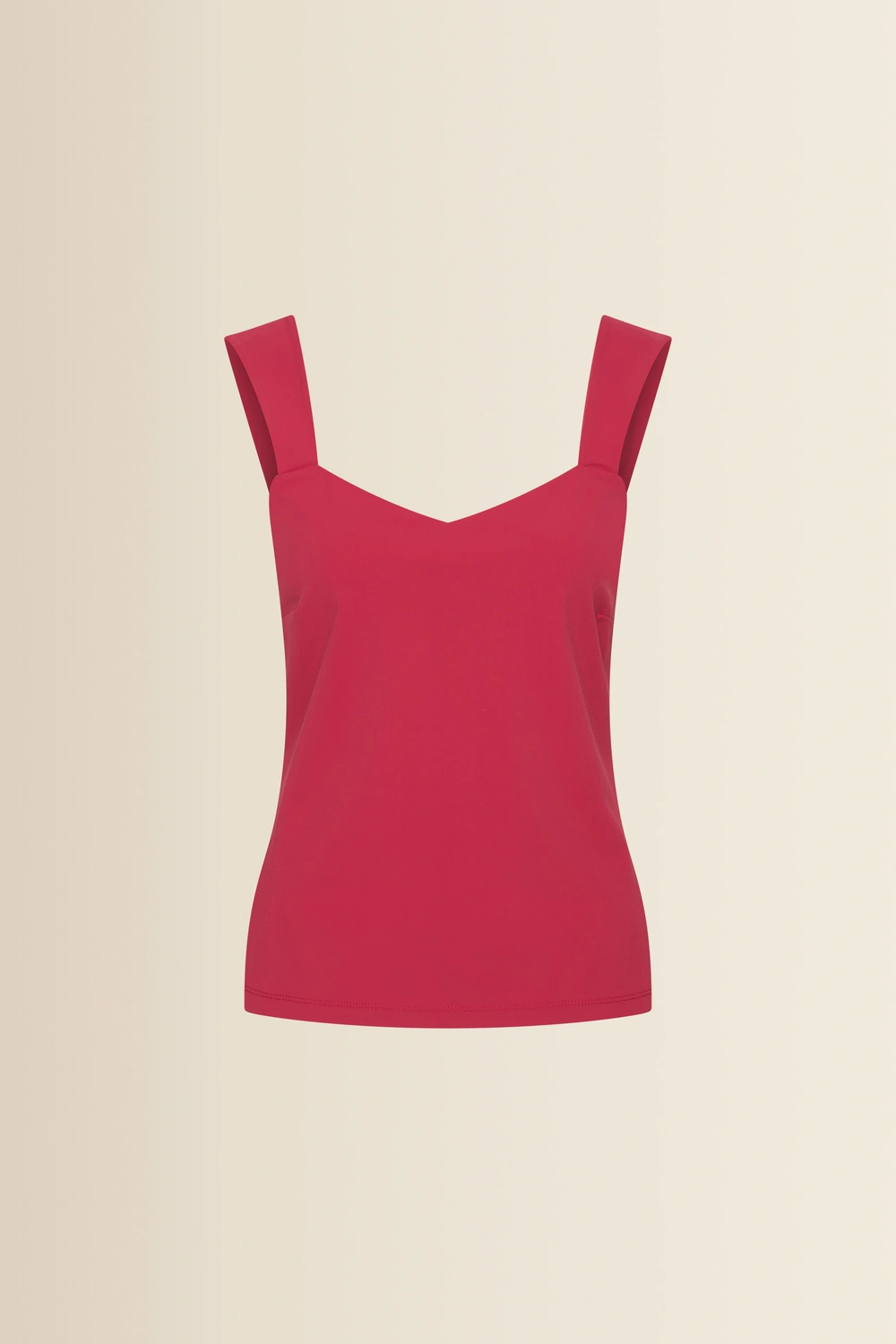 Rode top – comfortabele travelkwaliteit met een subtiele V-hals en brede schouderbanden. Het aangesloten ontwerp zorgt voor een verfijnde pasvorm die voor elke gelegenheid de perfecte keuze is.