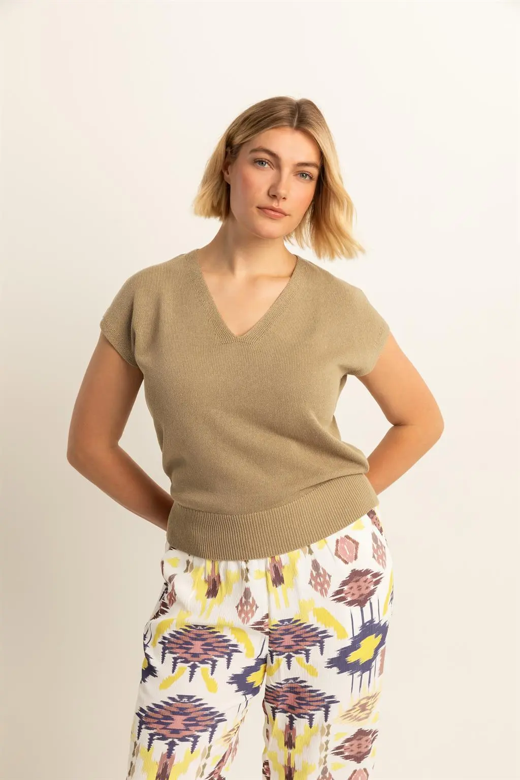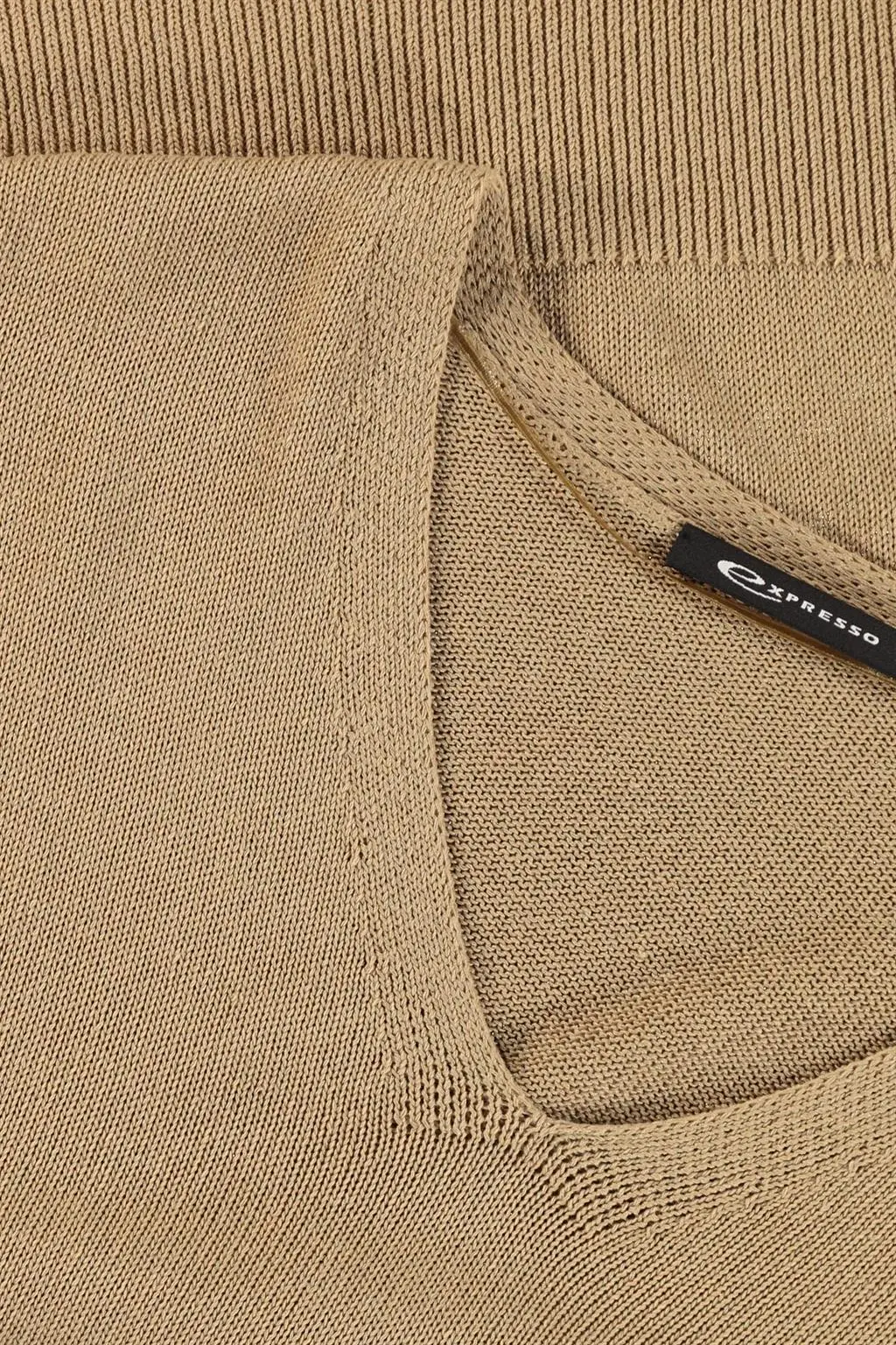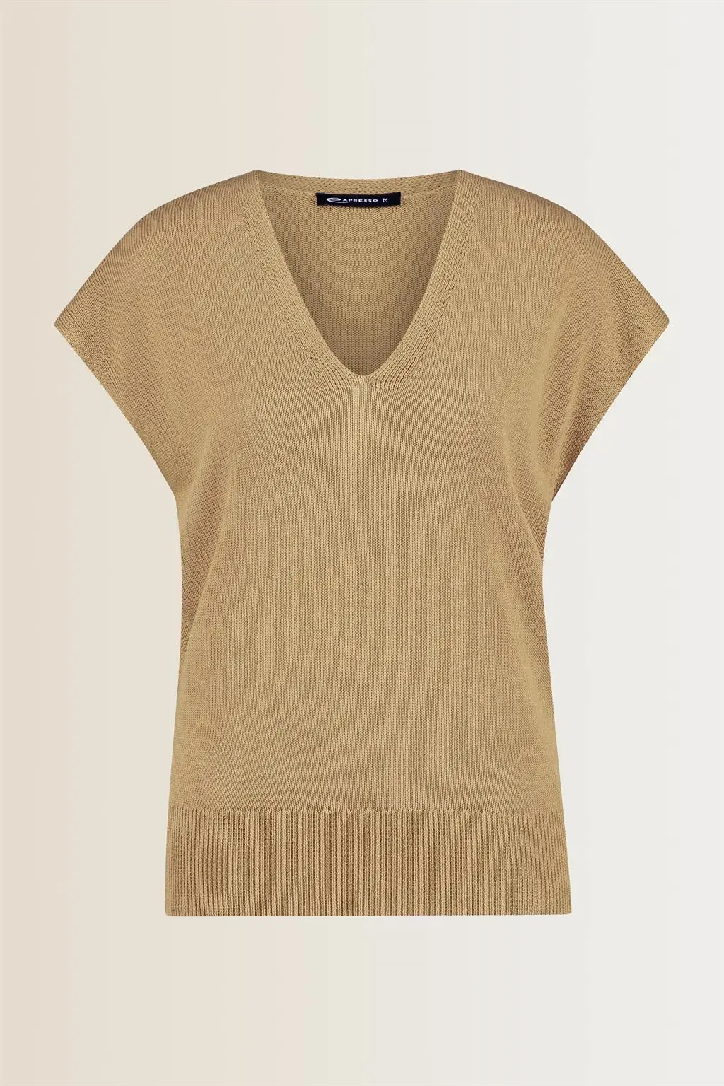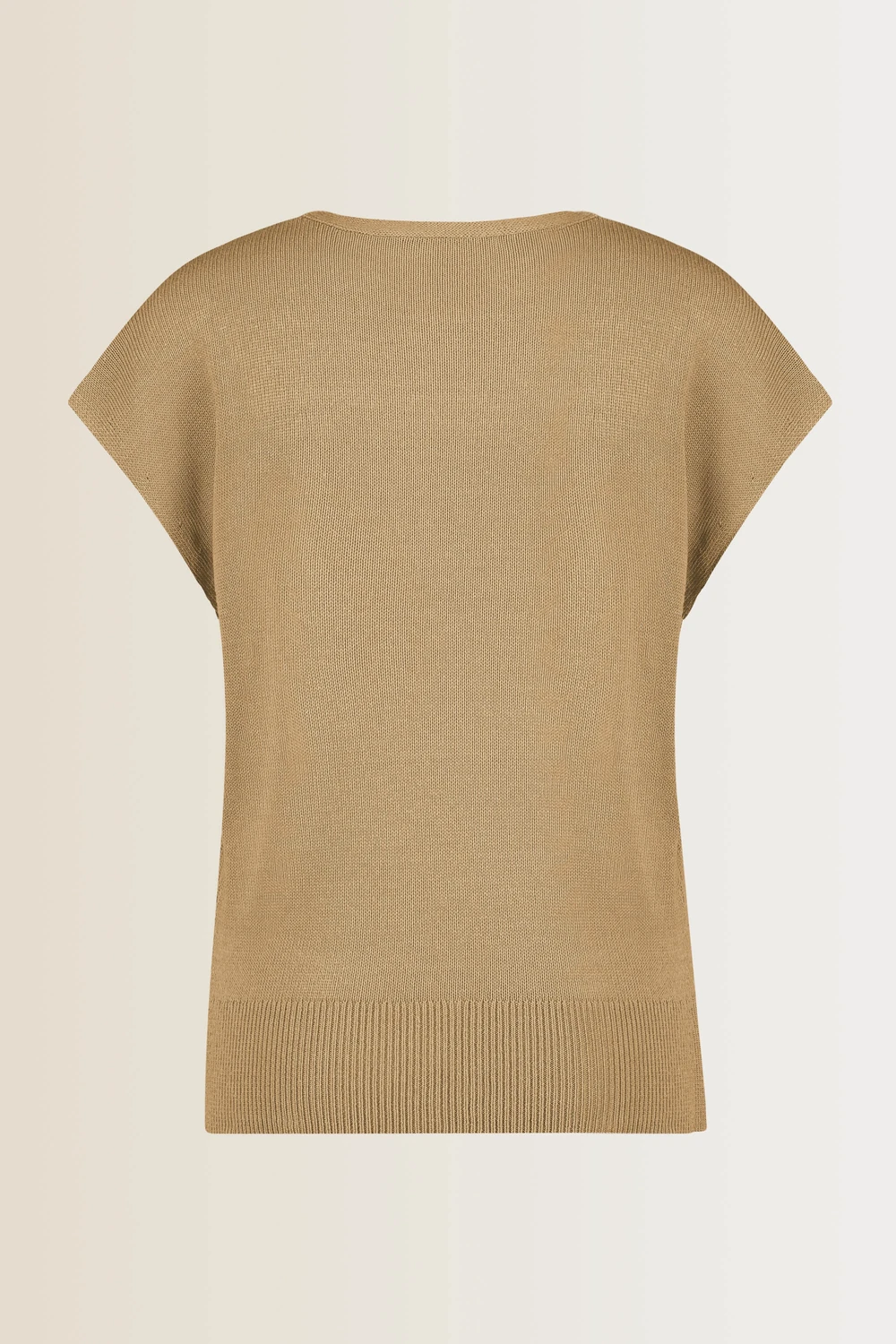Zandkleurige mouwloze trui – blend met lyocell & linnen. Licht bloezend, mouwloos, overhangende schouders. Fijngebreid en soepel vallend, lichte zomerkwaliteit met verkoelend linnen. Comfortabel loose-fit met glad aangesloten zoomboord: trendy knitwear voor warme dagen.