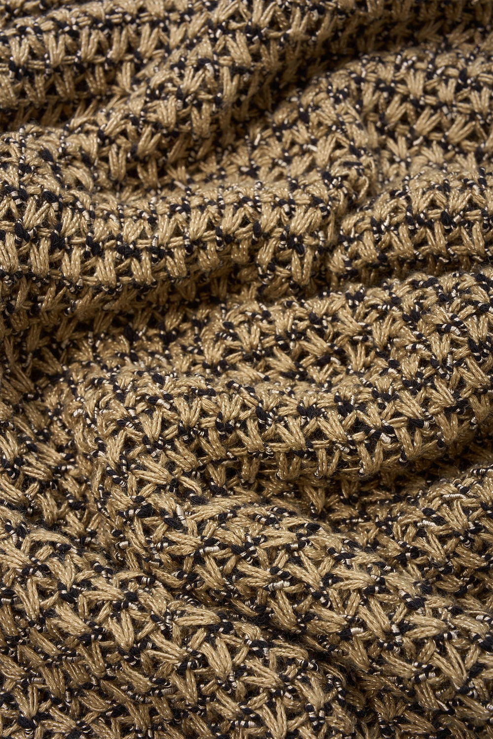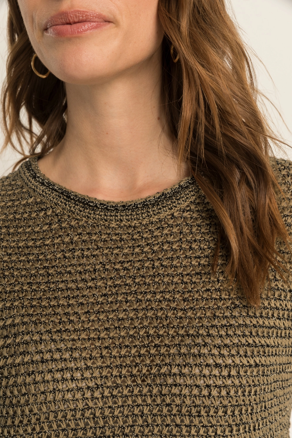 Opengebreide top – luchtig breisel met een verfijnde structuur en subtiel contrast in zwart. Relaxed en rechtvallend, met een ronde hals en korte aangeknipte mouwen. Het opengewerkte patroon geeft deze top een speelse, rijke uitstraling, terwijl het lichte breisel comfortabel draagt en moeiteloos met je meebeweegt.
