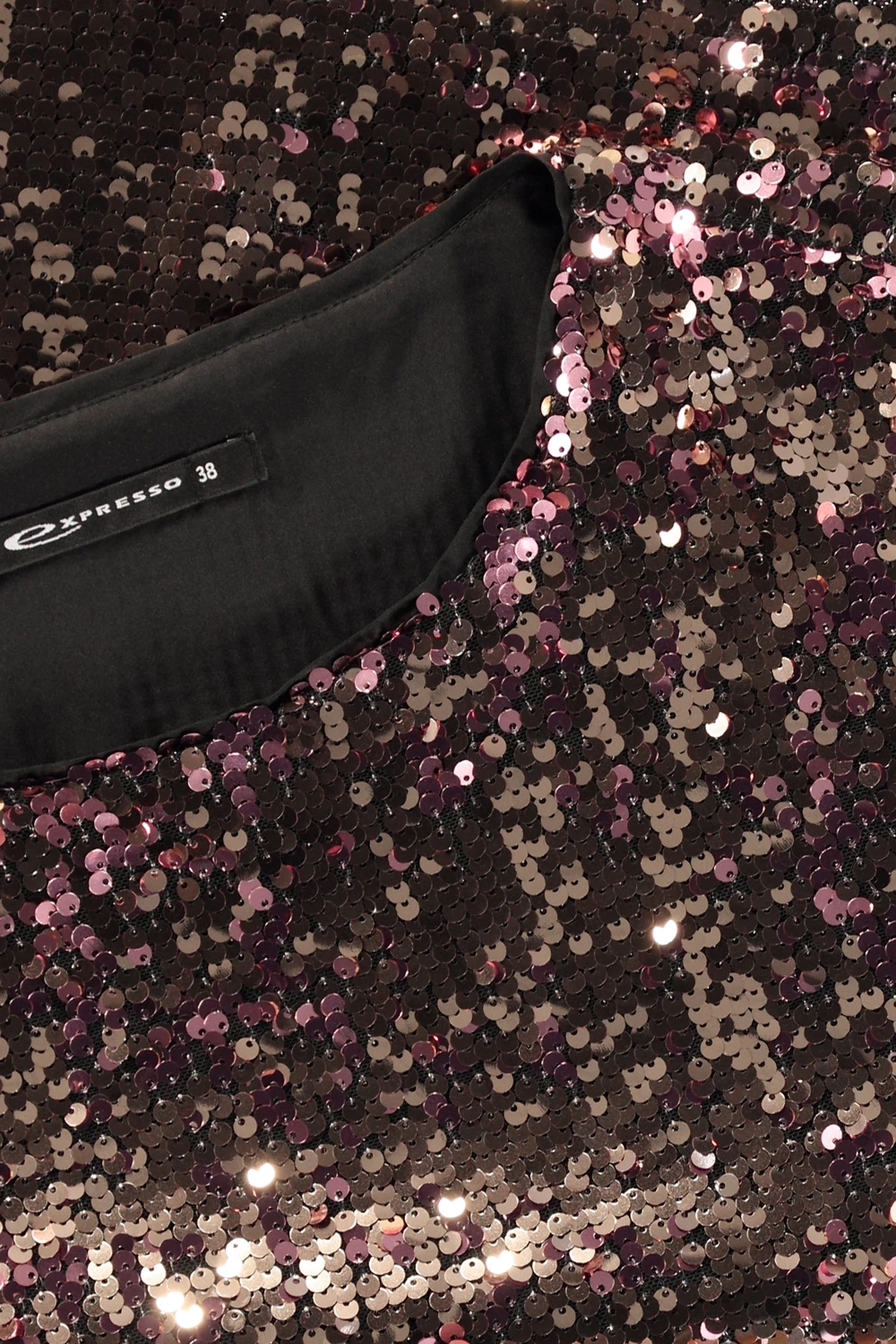 Bronzen pailletten top – stretch polyester. Losvallend model, ronde hals, korte mouwen. Glamoureus en glinsterend: deze top is een echte blikvanger voor een avondje uit. Perfect om te combineren met een zwarte pantalon of rok voor een feestelijke look met flair. De ideale keuze voor een sprankelende entree.