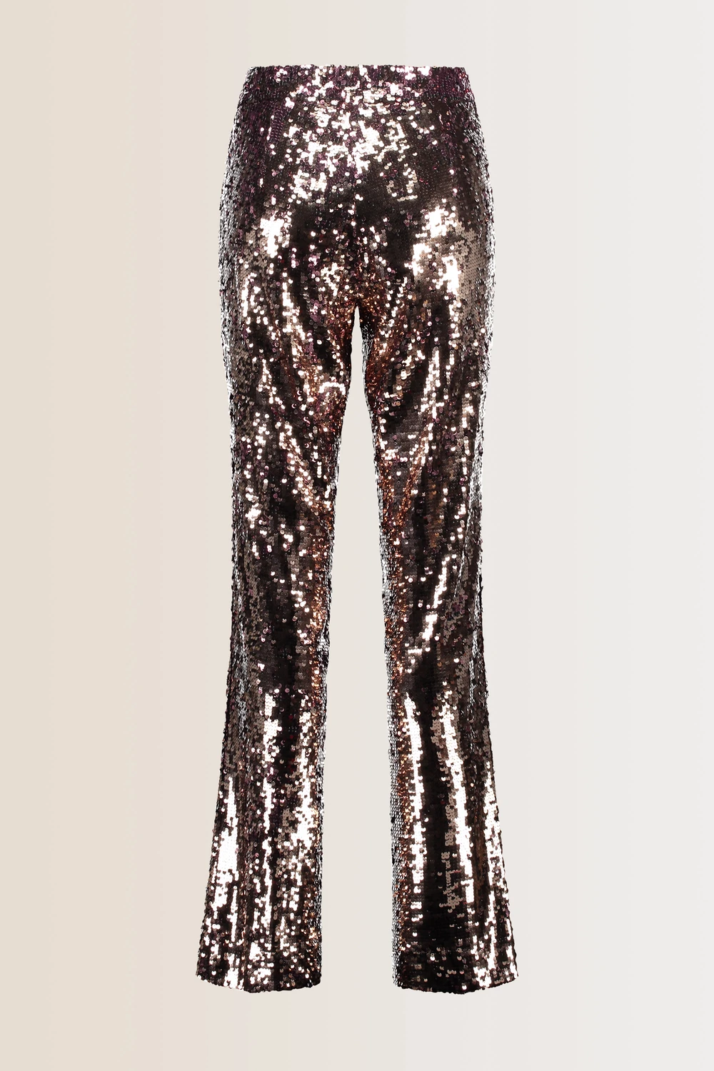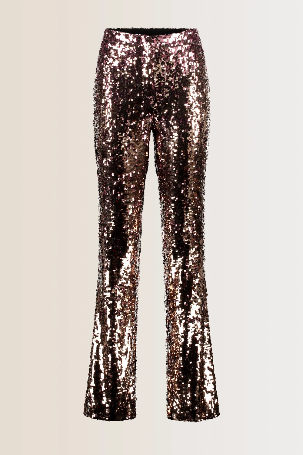 Bronzen paillettenbroek – volledig gevoerd. Mid-rise taille, licht uitlopende pijpen, flatterende pasvorm. Glanzende pailletten zorgen voor een instant glam-uitstraling, perfect voor feestelijke gelegenheden. Maak een statement met deze broek en steel de show op elk event!