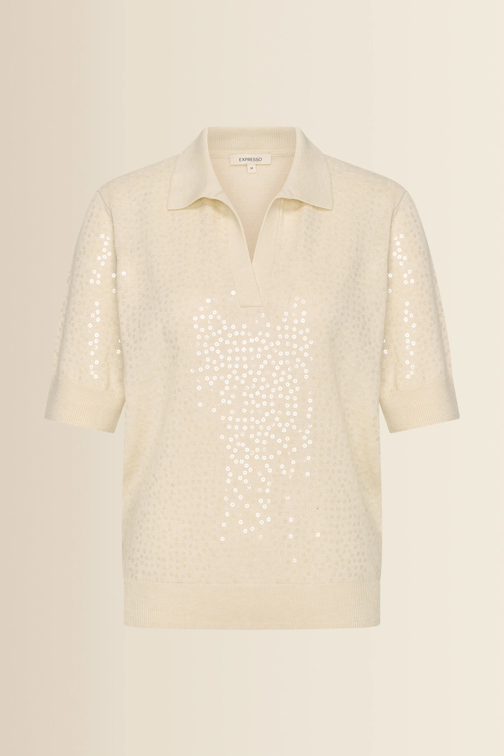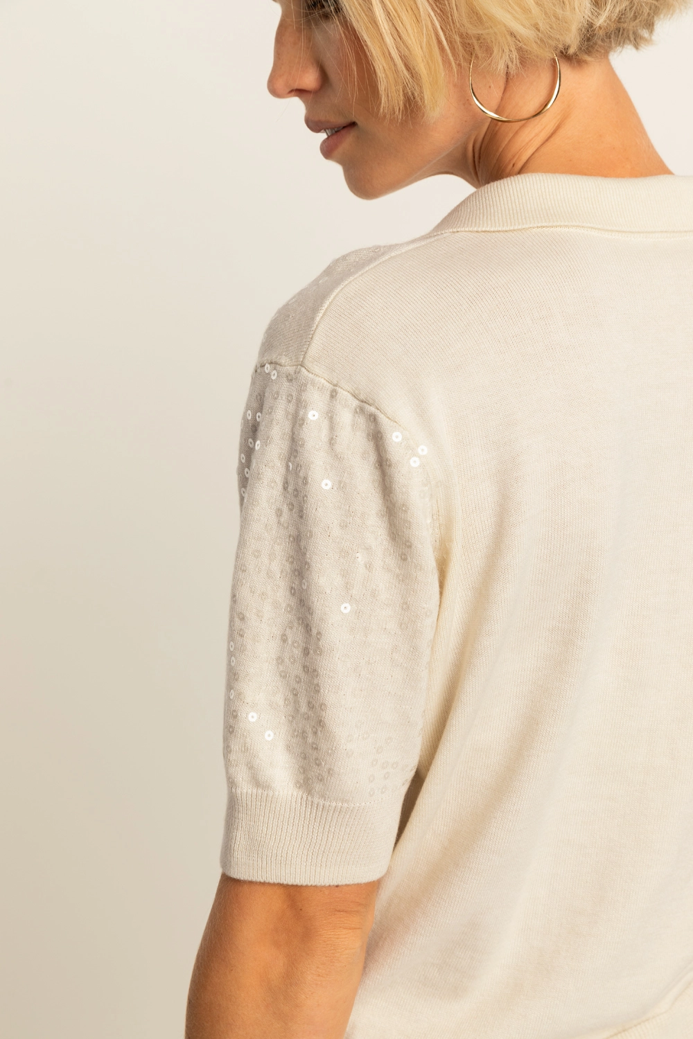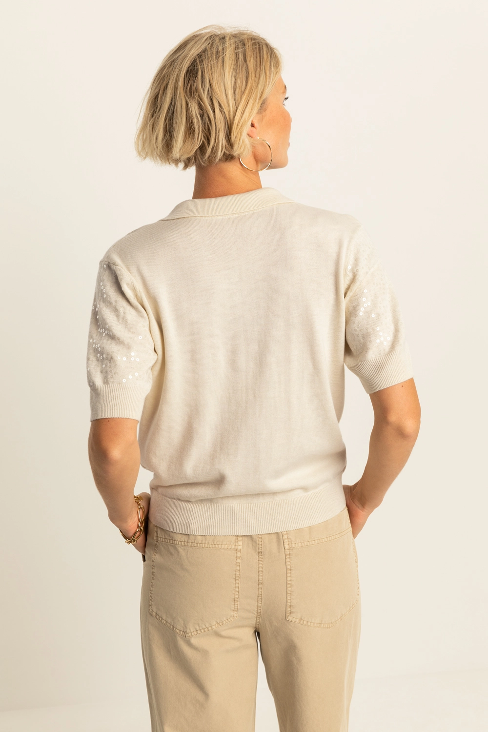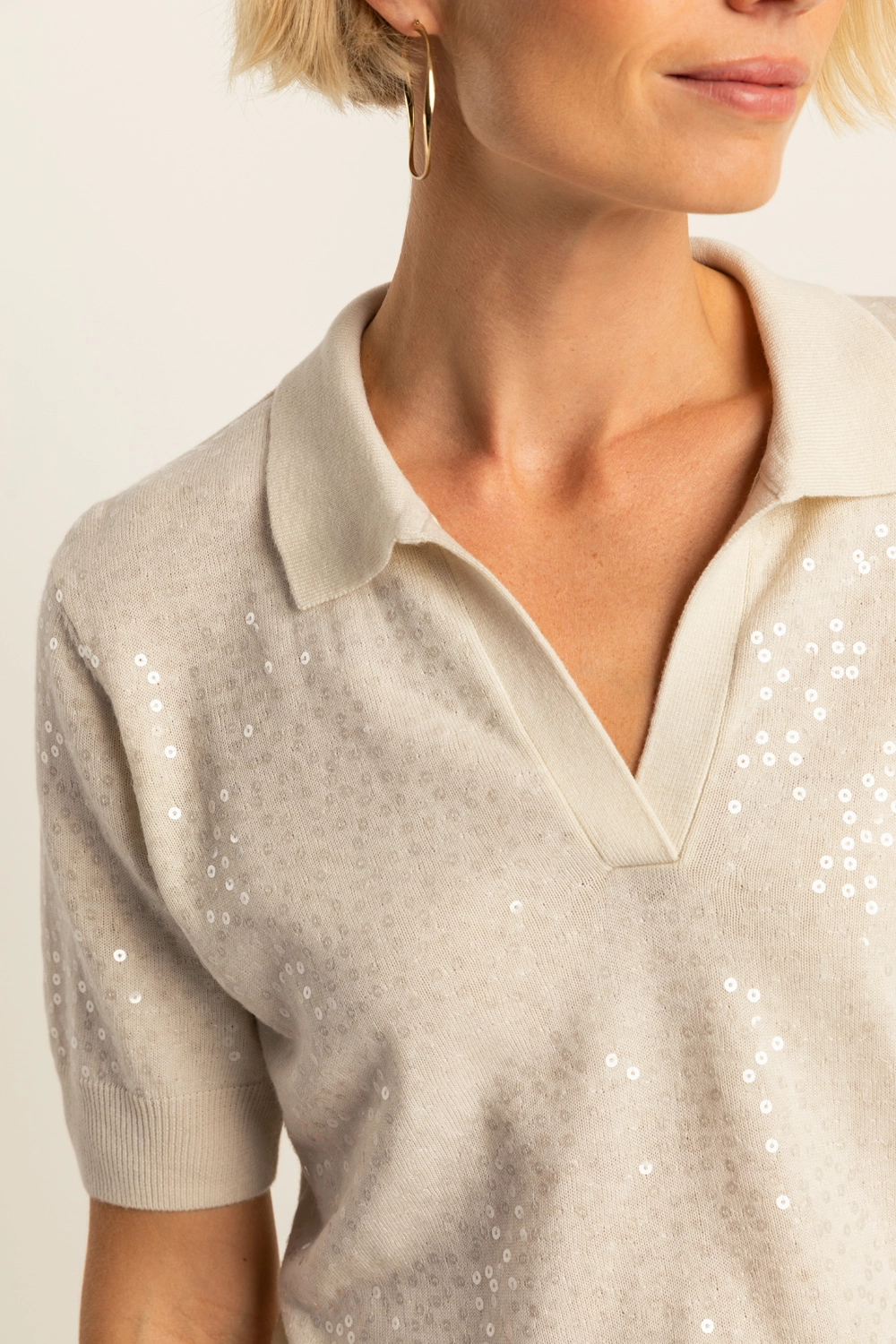 Fijngebreide polo met pailletten – luxe knit met een subtiele sparkle. Vrouwelijk en verfijnd, uitgevoerd met een elegante polo-kraag en korte mouwen. De all-over pailletten zorgen voor een zachte glans, waardoor deze trui moeiteloos balanceert tussen casual chic en gekleed. Perfect voor dagen waarop je comfortabel wilt zijn, maar wel met een expressieve twist. Draag ‘m met een lichte pantalon of denim voor een frisse, stijlvolle look.