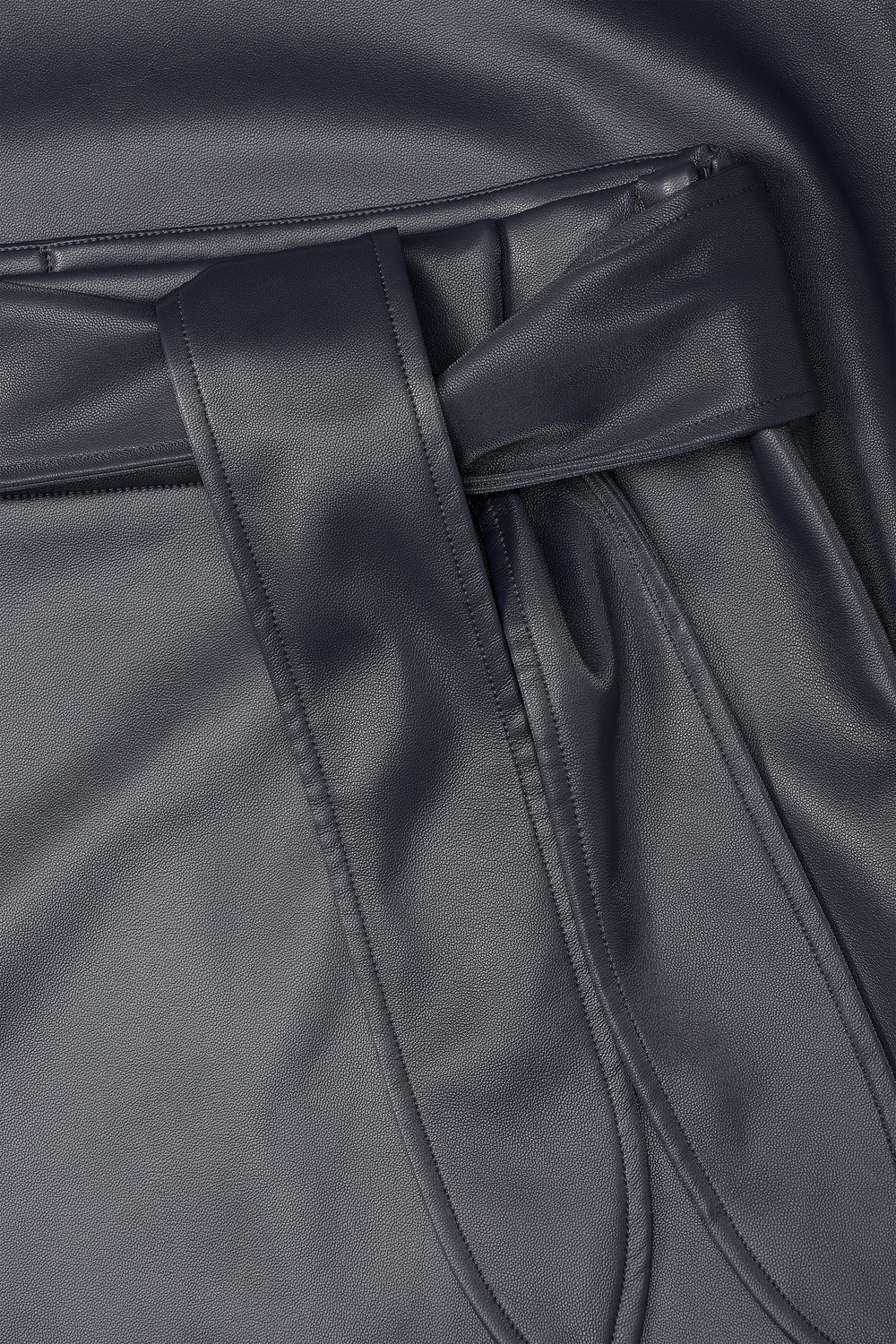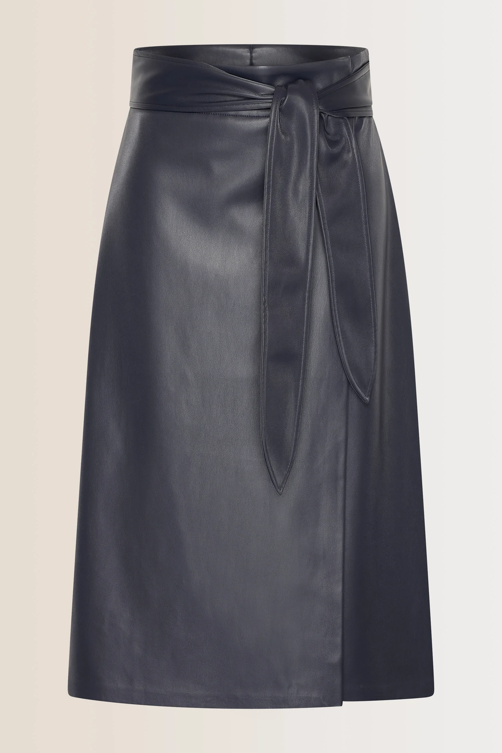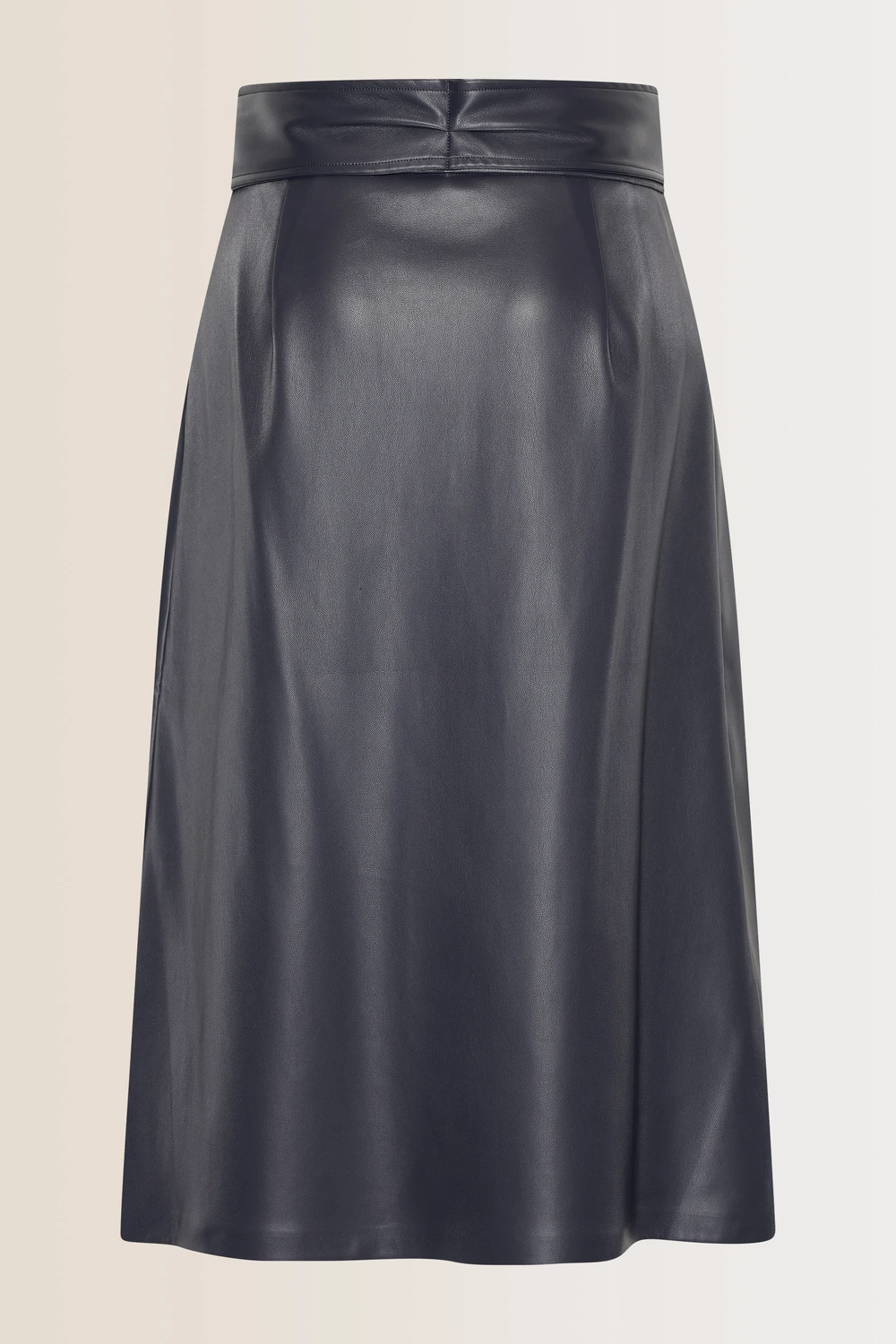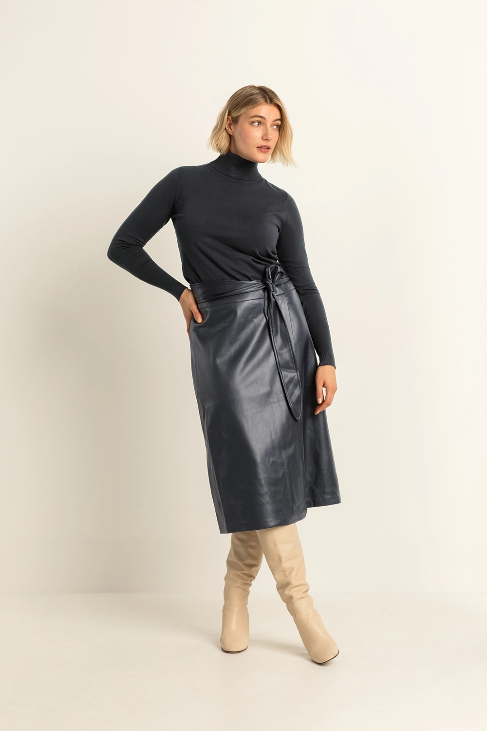 Donkerblauwe rok – imitatieleer. Hoge taille, knielengte, met een subtiele A-lijn. Deze rok heeft een stijlvolle strikceintuur in de taille, wat een vrouwelijke en elegante touch geeft aan dit edgy ontwerp. Het gladde imitatieleer zorgt voor een moderne, minimalistische look die gemakkelijk te combineren is met zowel casual als chique outfits.
