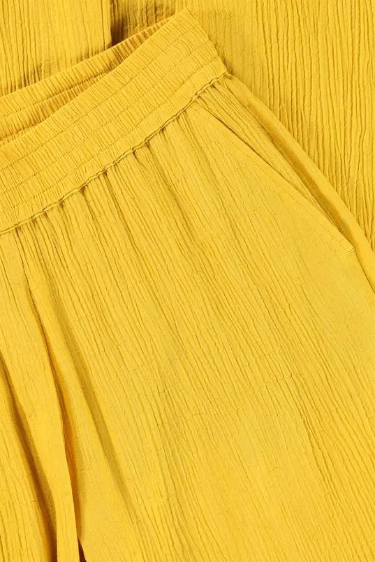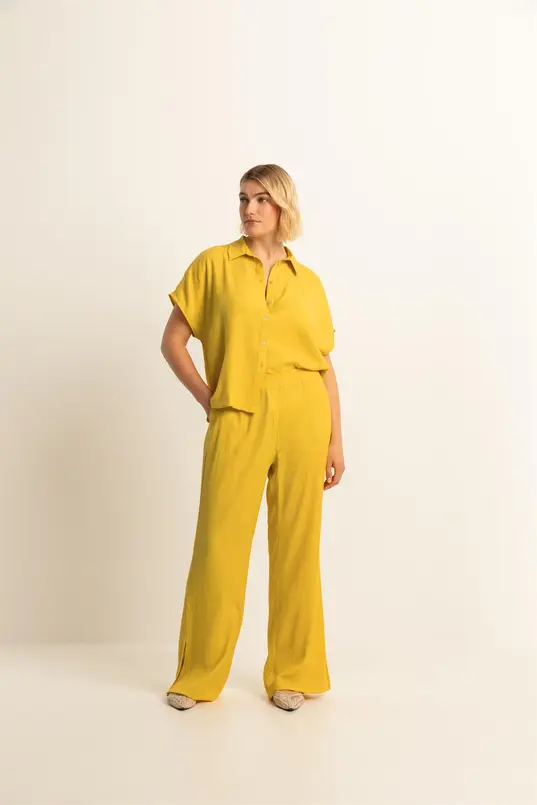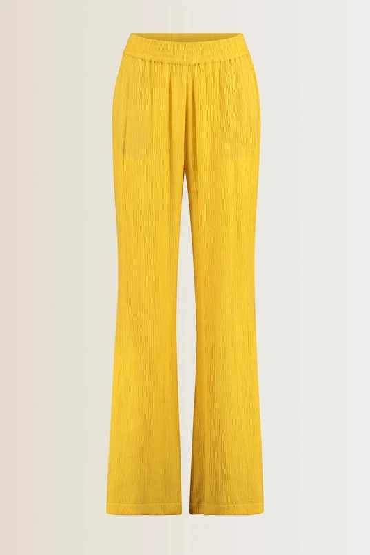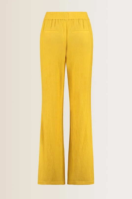 Okergele pull-on broek – viscosemix. Relaxte pasvorm, elastische tailleband, rechte wijde pijpen. Lichtgewicht crinkle-stof. Draagt heerlijk luchtig op warme zomerdagen, makkelijk combineerbaar met de (print-) tops en summer knits van het thema Golden Horizon. Tip: style een faux jumpsuit-look met de bijpassende blousetop.