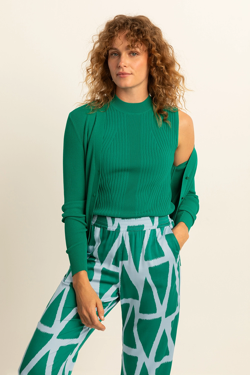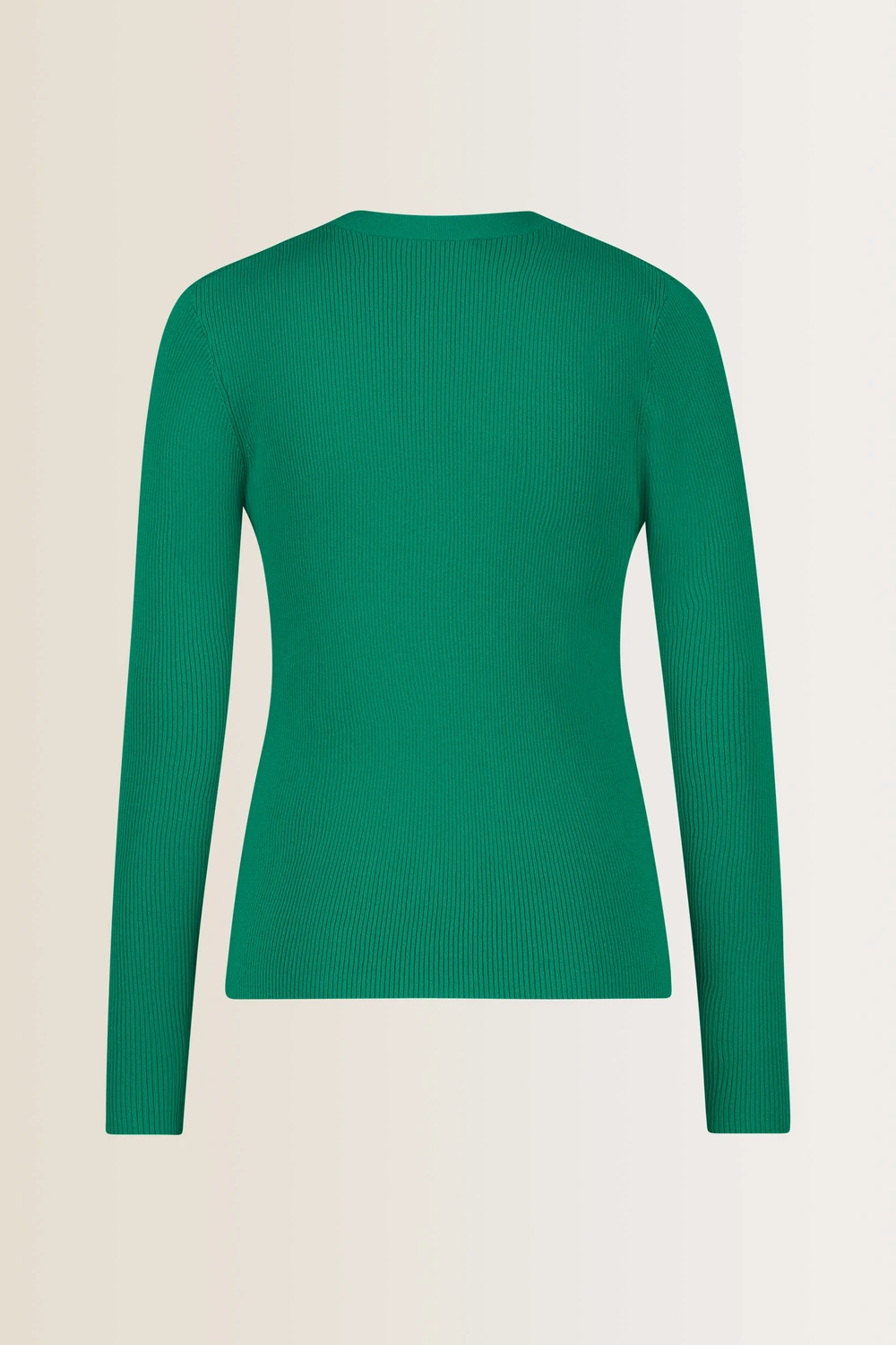 Ribgebreid vest in flessengroen – viscosemix. Semi-fitted, V-hals, lange mouwen. Stretchy ribbreisel, sluit mooi aan en ‘tekent’ niet. Een fijne basic voor al je gelaagde outfits, nóg veelzijdiger met de bijpassende mouwloze top.