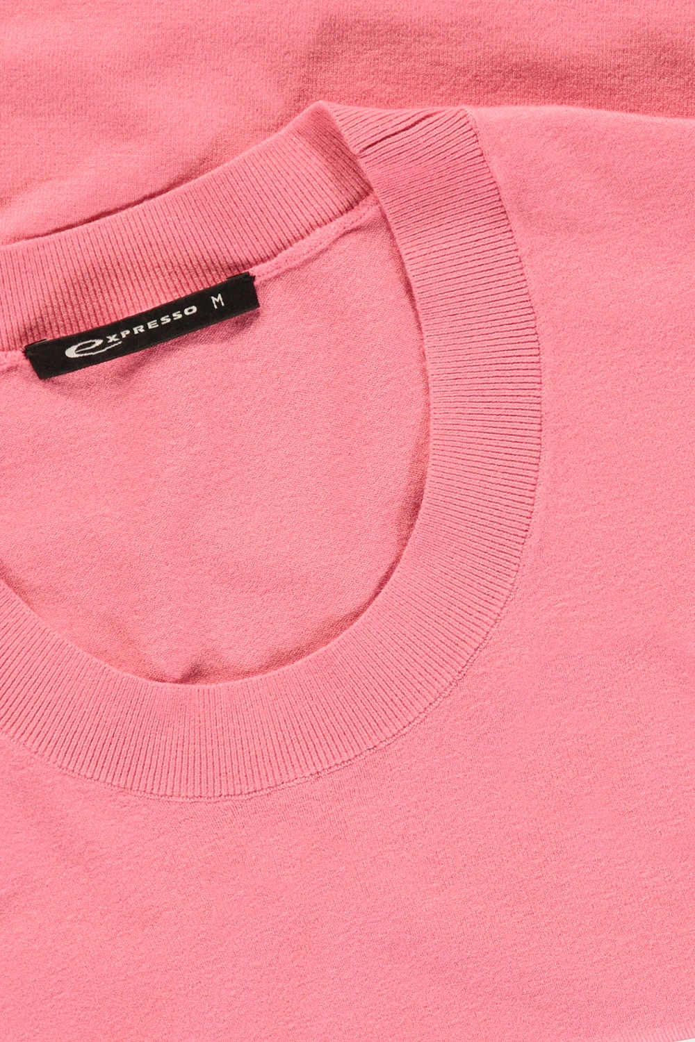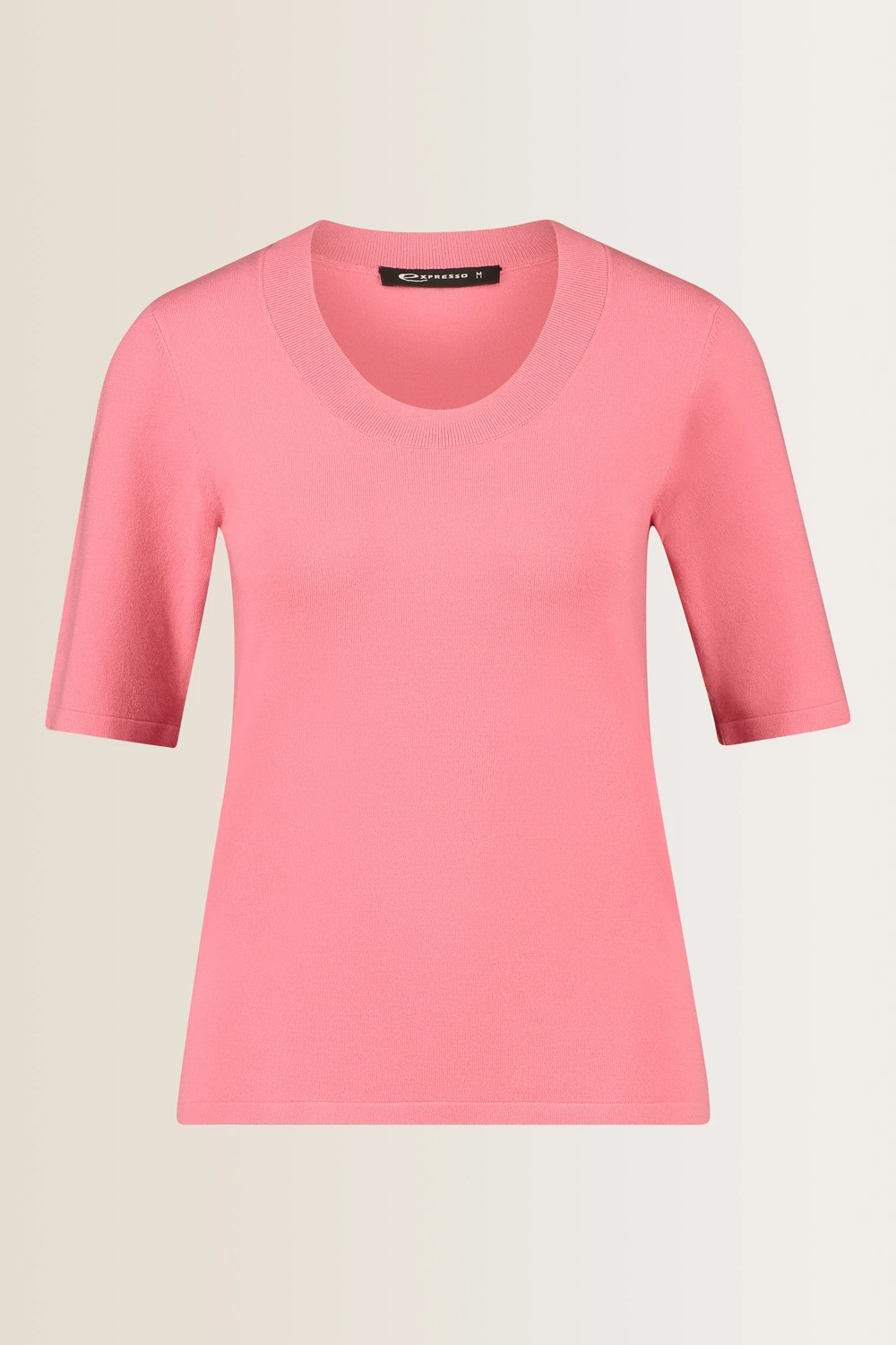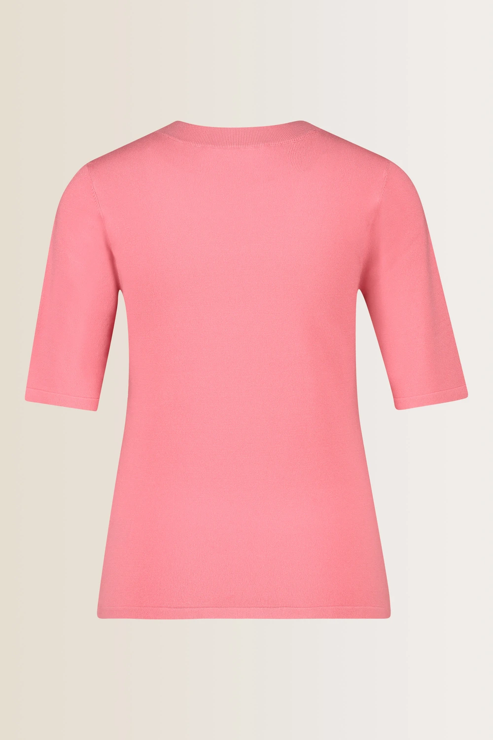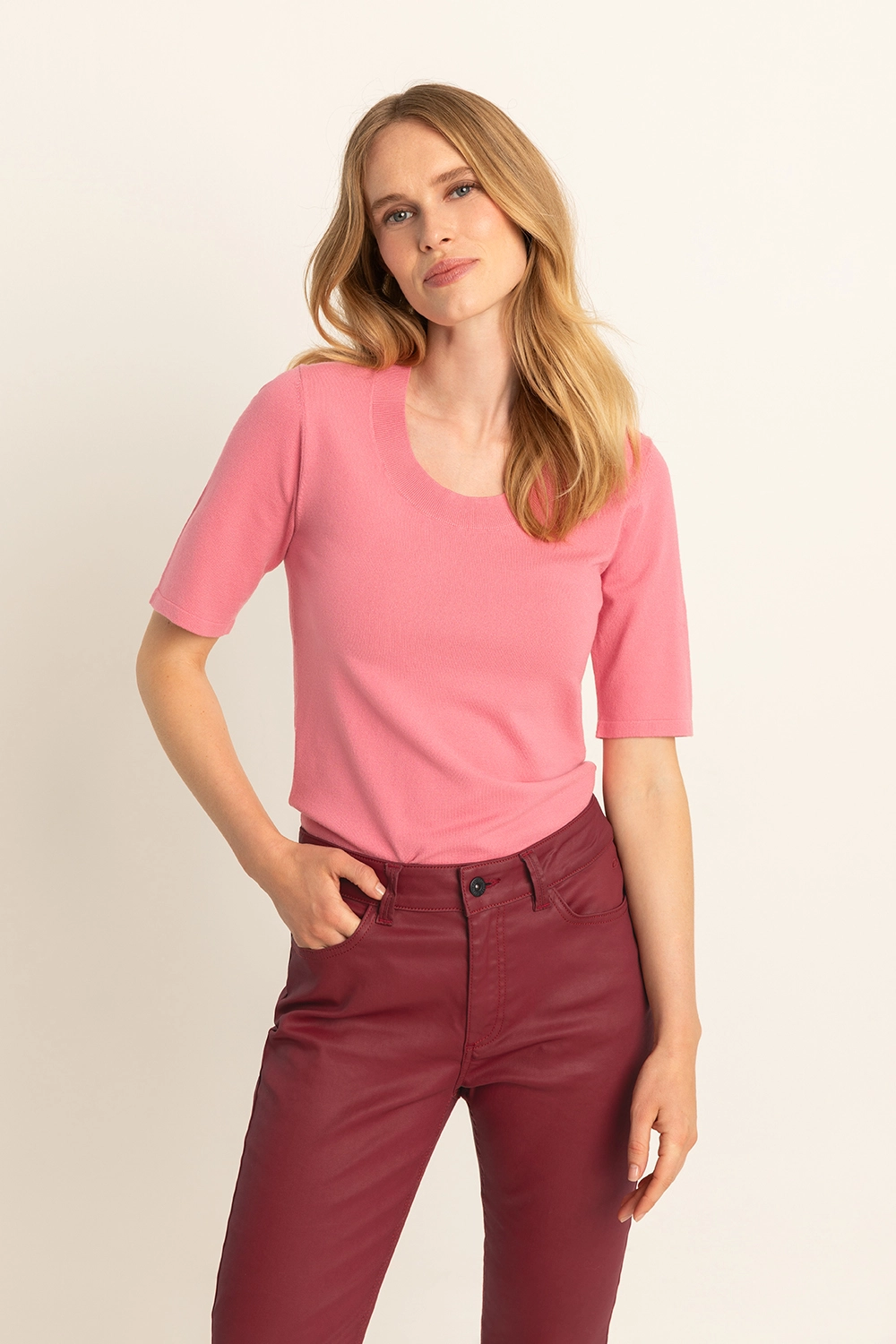 Roze ribgebreide trui – blend met viscose EcoVero. Semi-fitted, lage ronde hals, korte mouwen. Stretchy ribbreisel, sluit mooi aan. Luxe basistrui met flatterende halflange mouwen, past bij vrijwel alles uit de Ruby Romance-collectie.