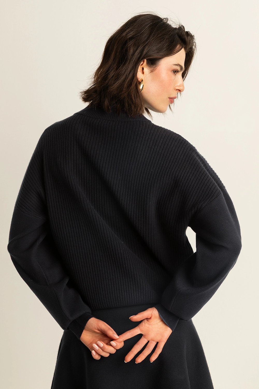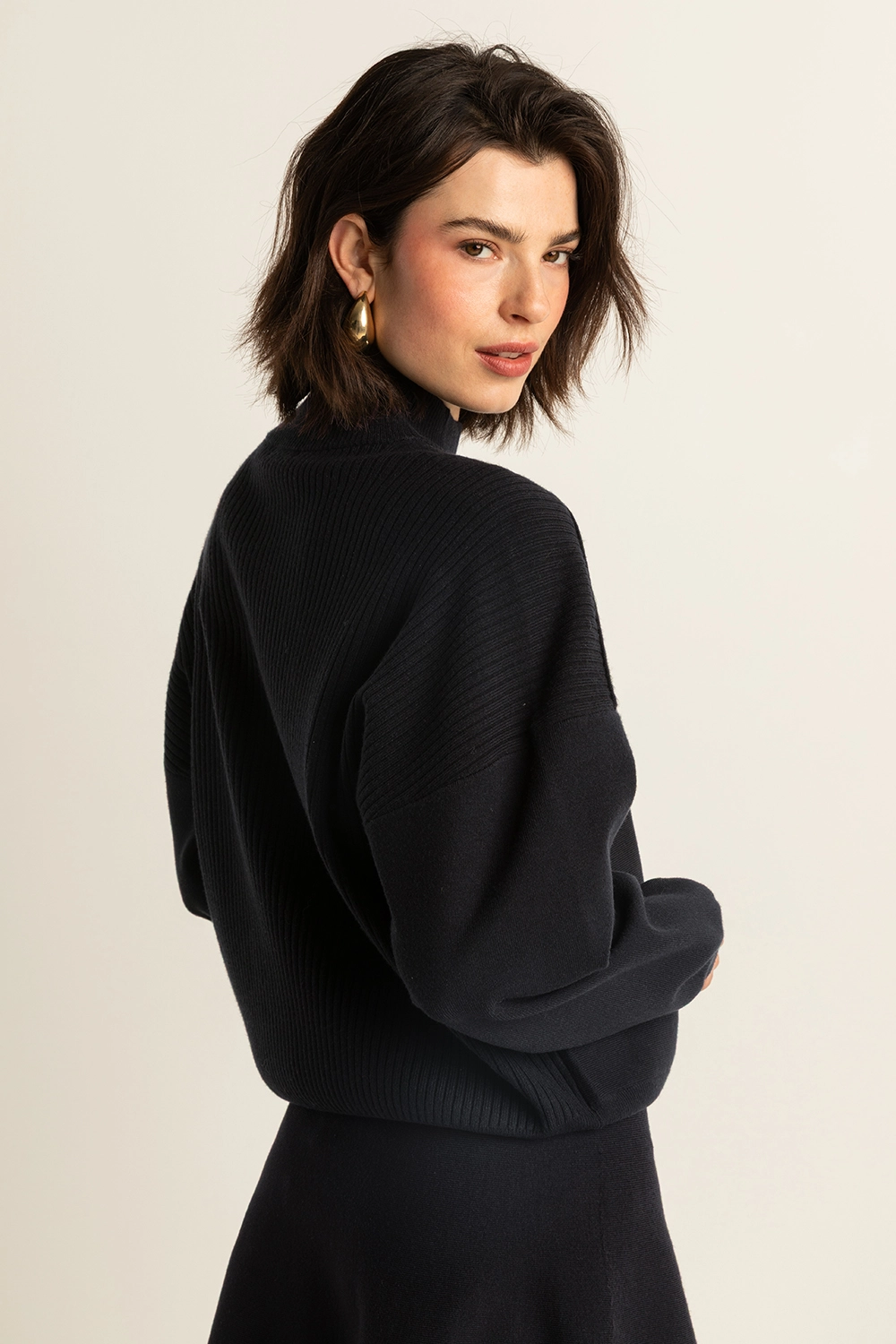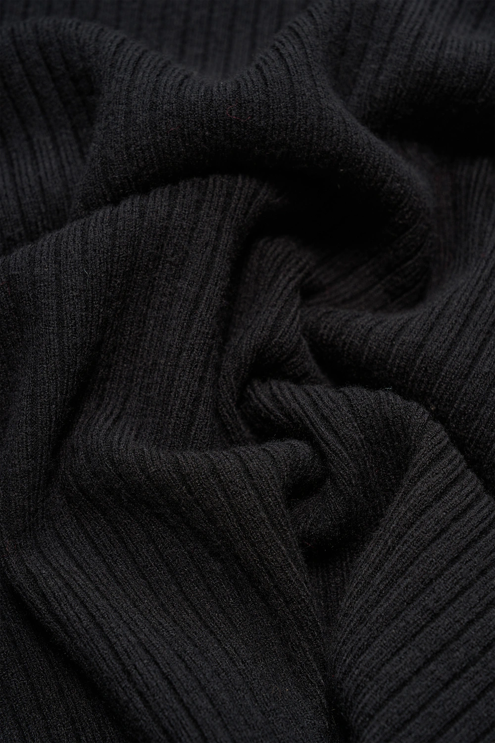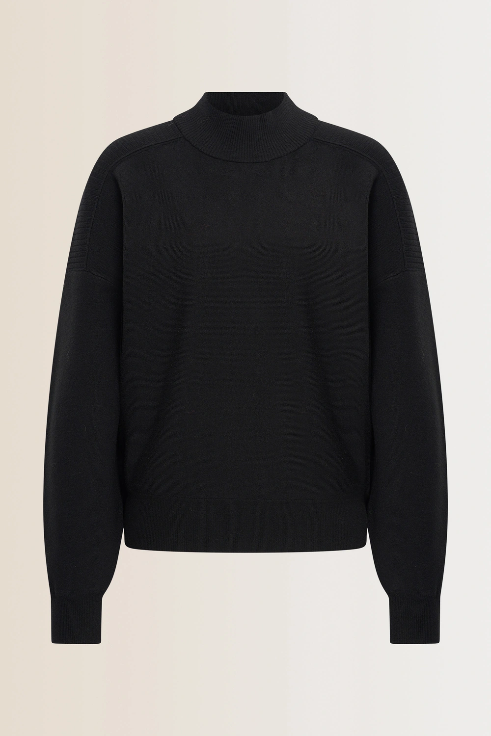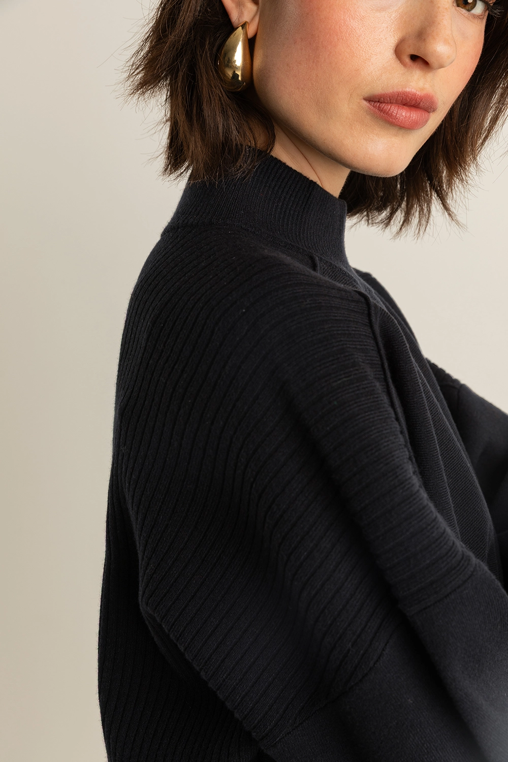 Zwarte trui – horizontale ribstructuur. Relaxed fit met mockneck en lange mouwen. De brede ribboorden en de subtiele textuur geven deze knit een moderne en minimalistische uitstraling. Comfortabel stretchy en ideaal als stijlvolle basis voor elke dag.