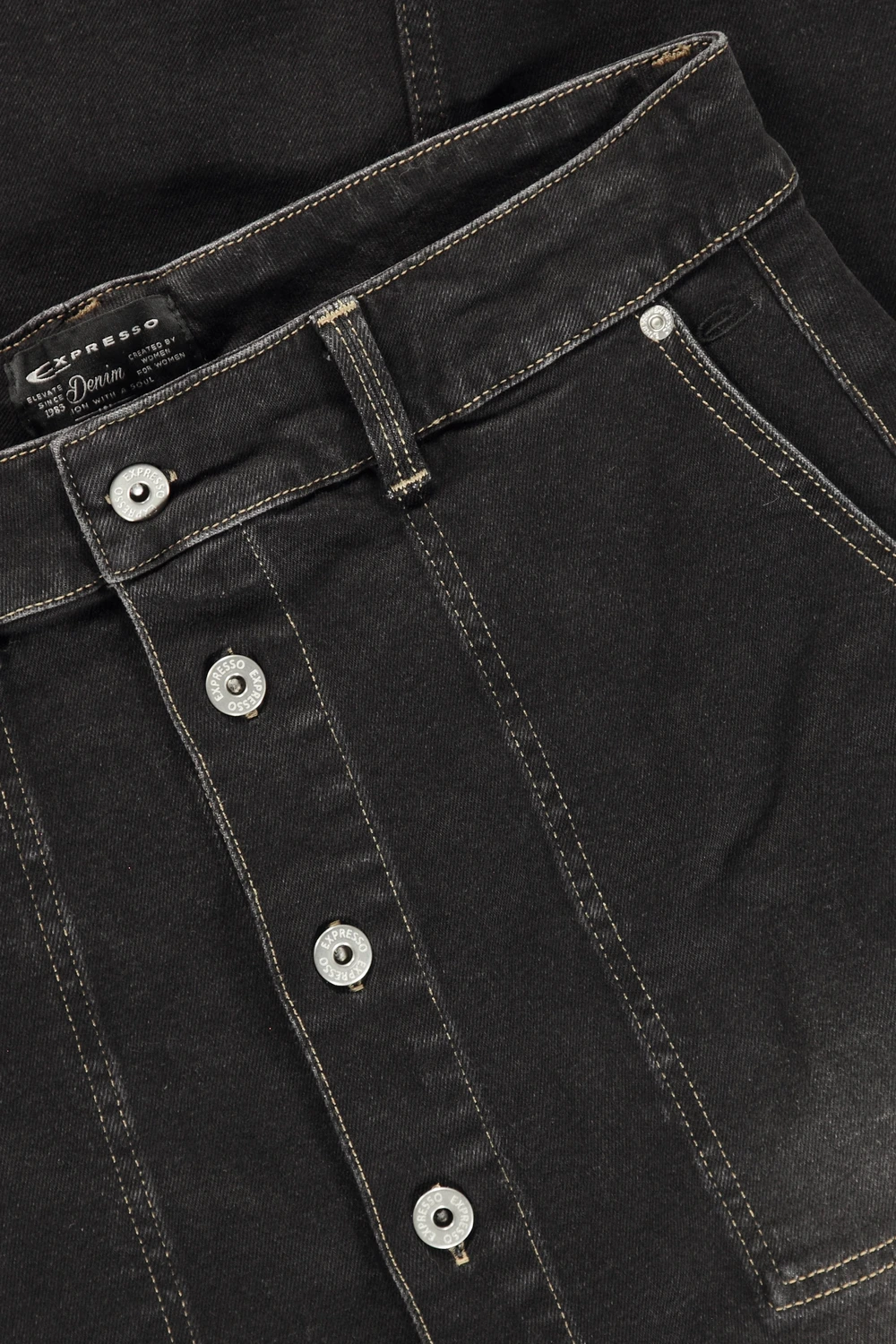 Zwarte jeansrok - stretchkatoen. Valt glad rond taille en heupen, optisch recht silhouet, doorknoopsluiting. Comfortabele stretchdenim, subtiele wassing. Vrouwelijk in denim: het kan! Style met soepelvallende blouses en/of zachte knitwear.
