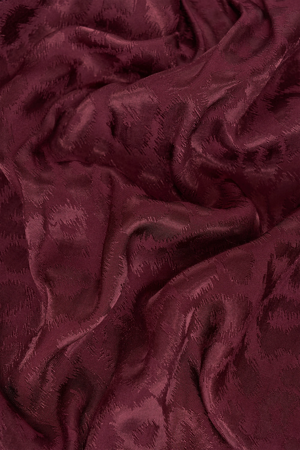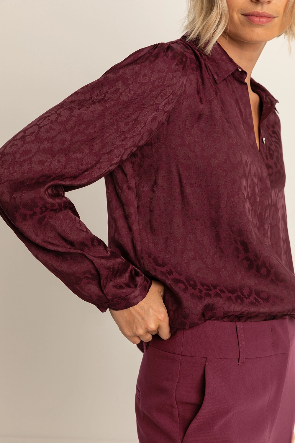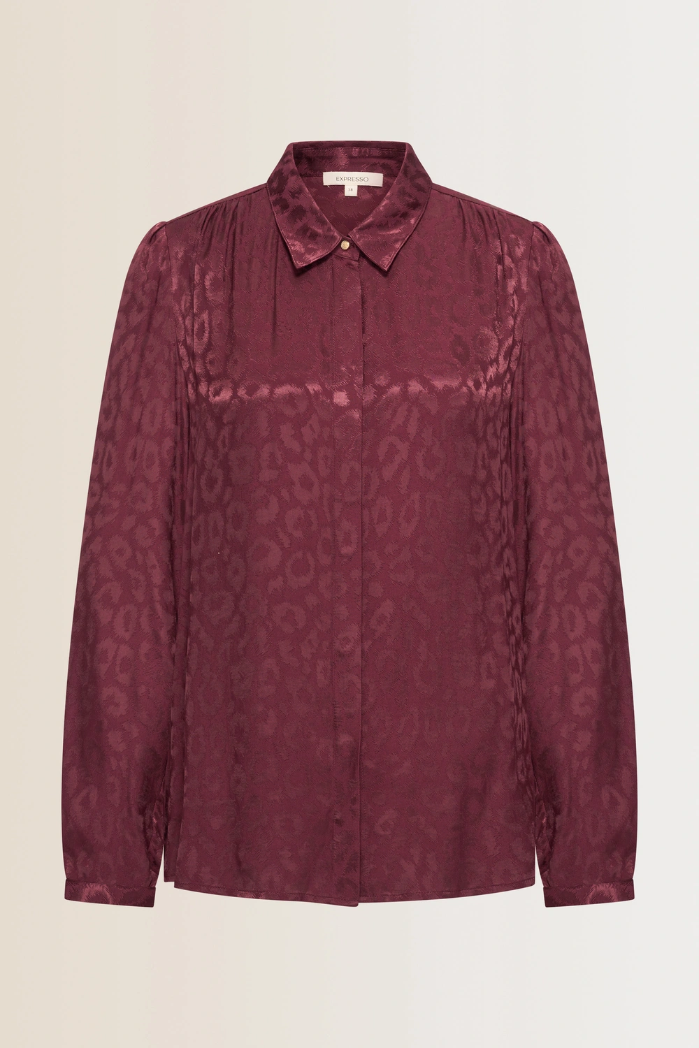 Dieprode blouse – jacquardgeweven viscosemix met subtiele animalprint. Recht model, klassieke kraag, lange mouwen. De satijnachtige glans en het ton-sur-ton patroon geven deze blouse een luxueuze uitstraling, terwijl de soepele stof mooi valt en comfortabel draagt. Perfect voor zowel zakelijke looks als avondgelegenheden.