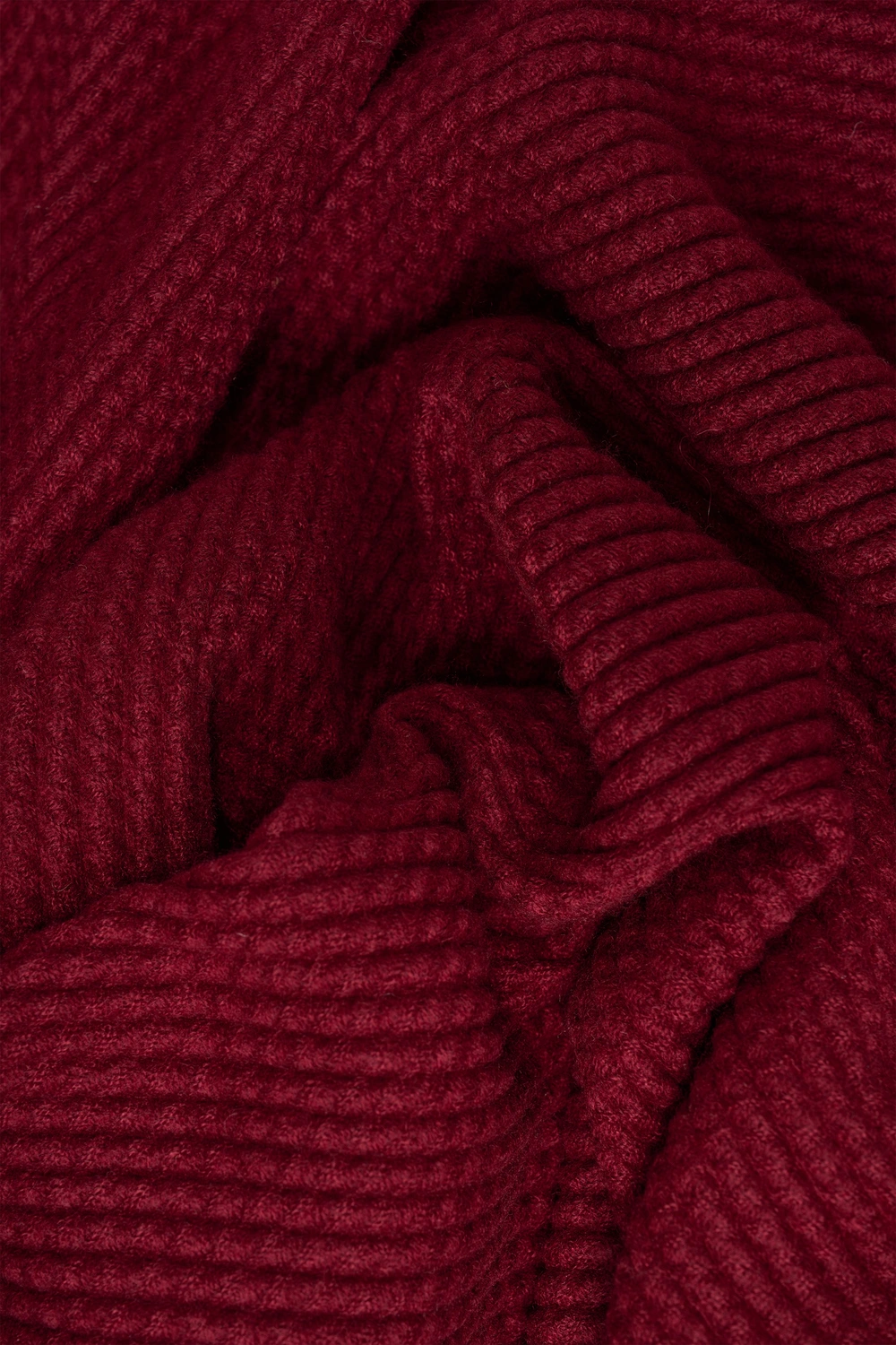 Bordeauxrode shawl – zachte geweven kwaliteit met subtiele diagonale structuur. Deze royale shawl voelt heerlijk warm en behaaglijk aan, ideaal voor frisse dagen. De korte franjes aan de uiteinden geven een speelse finishing touch. Draag losjes over een jas of nonchalant omgeslagen voor een cozy, stijlvolle look.