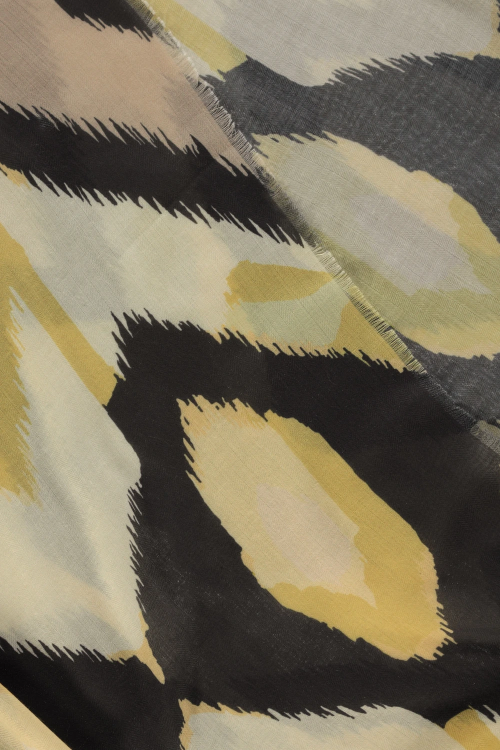 Shawl met multicolour ikatprint in zwart, kit en okergeel. Soepel en licht, visgraatweefsel. Alle kleuren uit het thema ‘Autumn Blaze’ in één accessoire. Styling made easy!