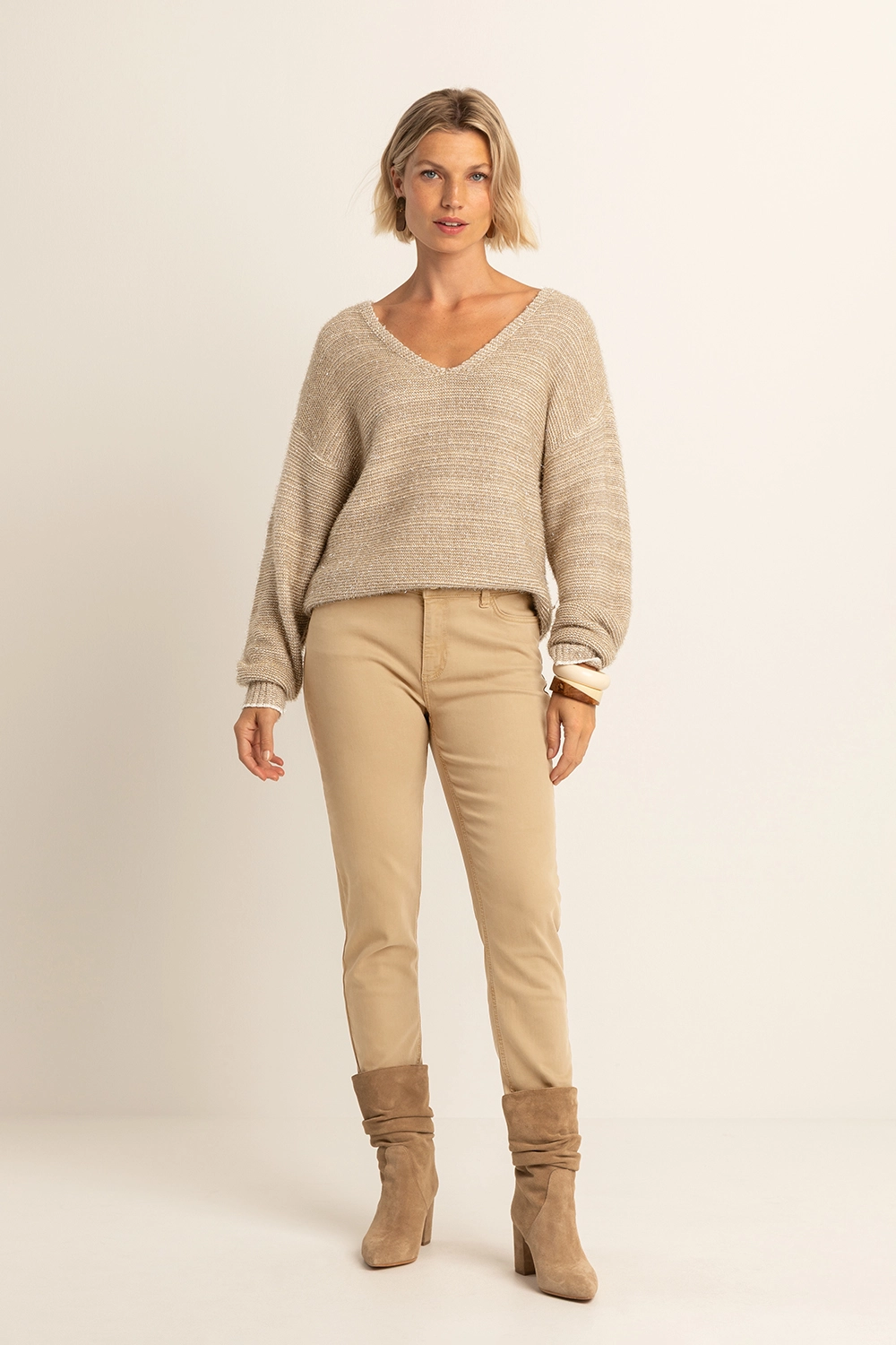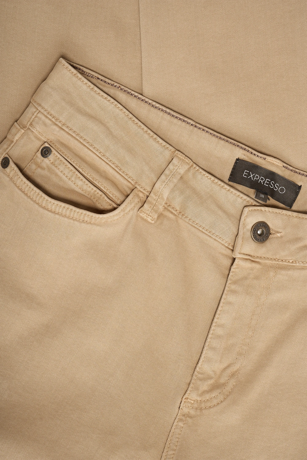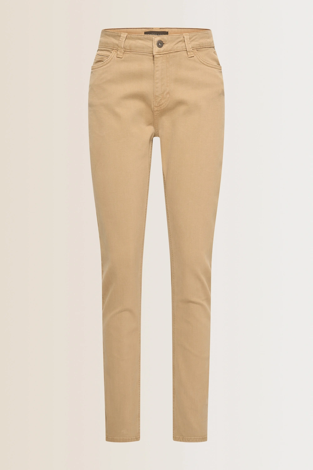 Camelkleurige slim fit broek – katoenmix met comfortabele stretch. Aansluitend model met klassieke 5-pocketstijl en een middelhoge taille. Het zachte materiaal voelt prettig aan op de huid en biedt de hele dag bewegingsvrijheid. Een veelzijdige basis die moeiteloos combineert met zowel knitwear als blouses.