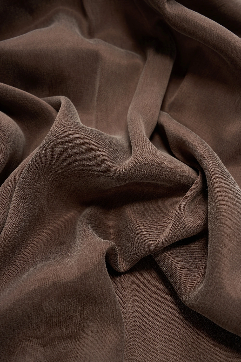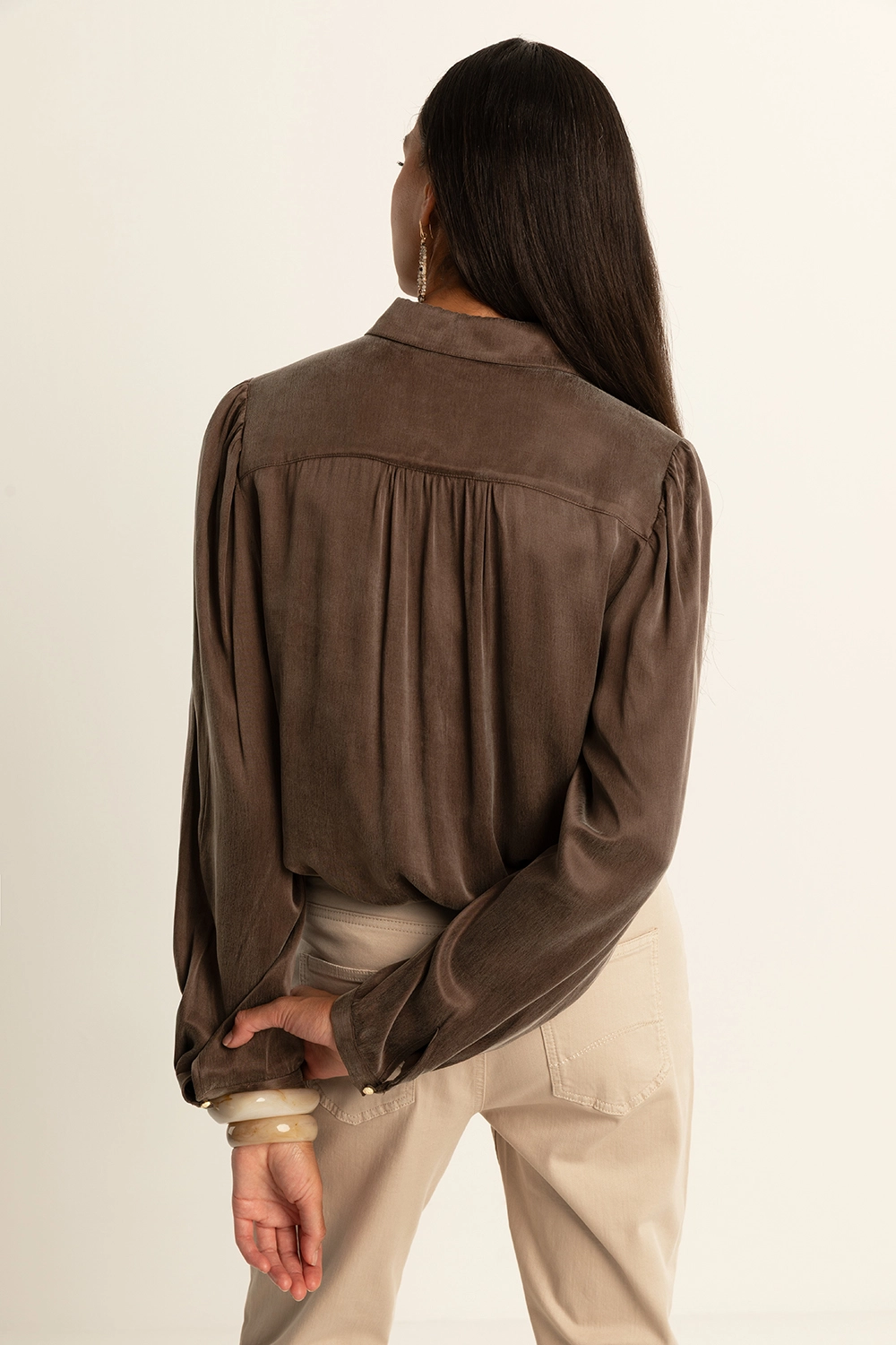 Donkerbruine blouse – zachte viscosemix kwaliteit met subtiele glans. Losvallend model met lange mouwen, klassieke kraag en verborgen knoopsluiting. De soepele stof en verfijnde afwerking geven deze blouse een tijdloze uitstraling, ideaal voor zowel zakelijke als elegante gelegenheden.