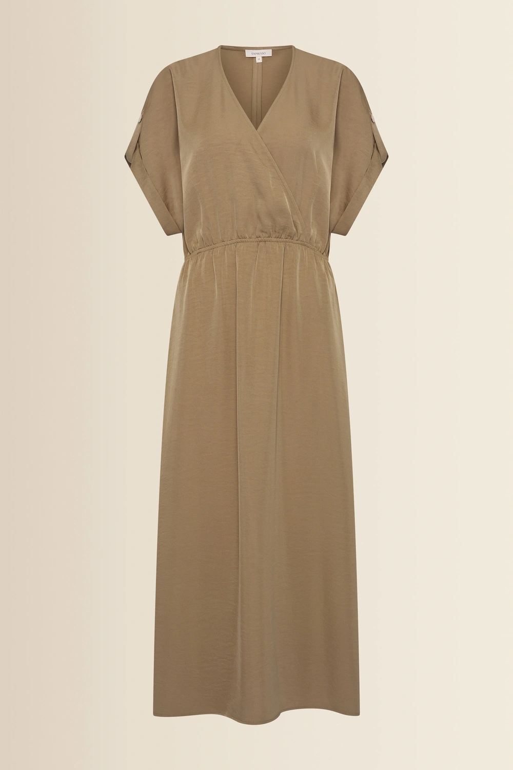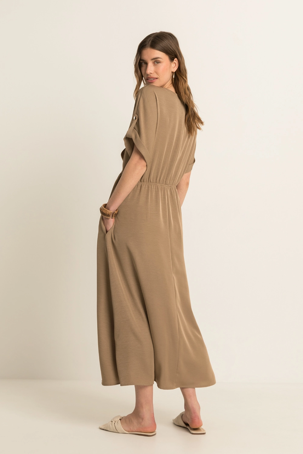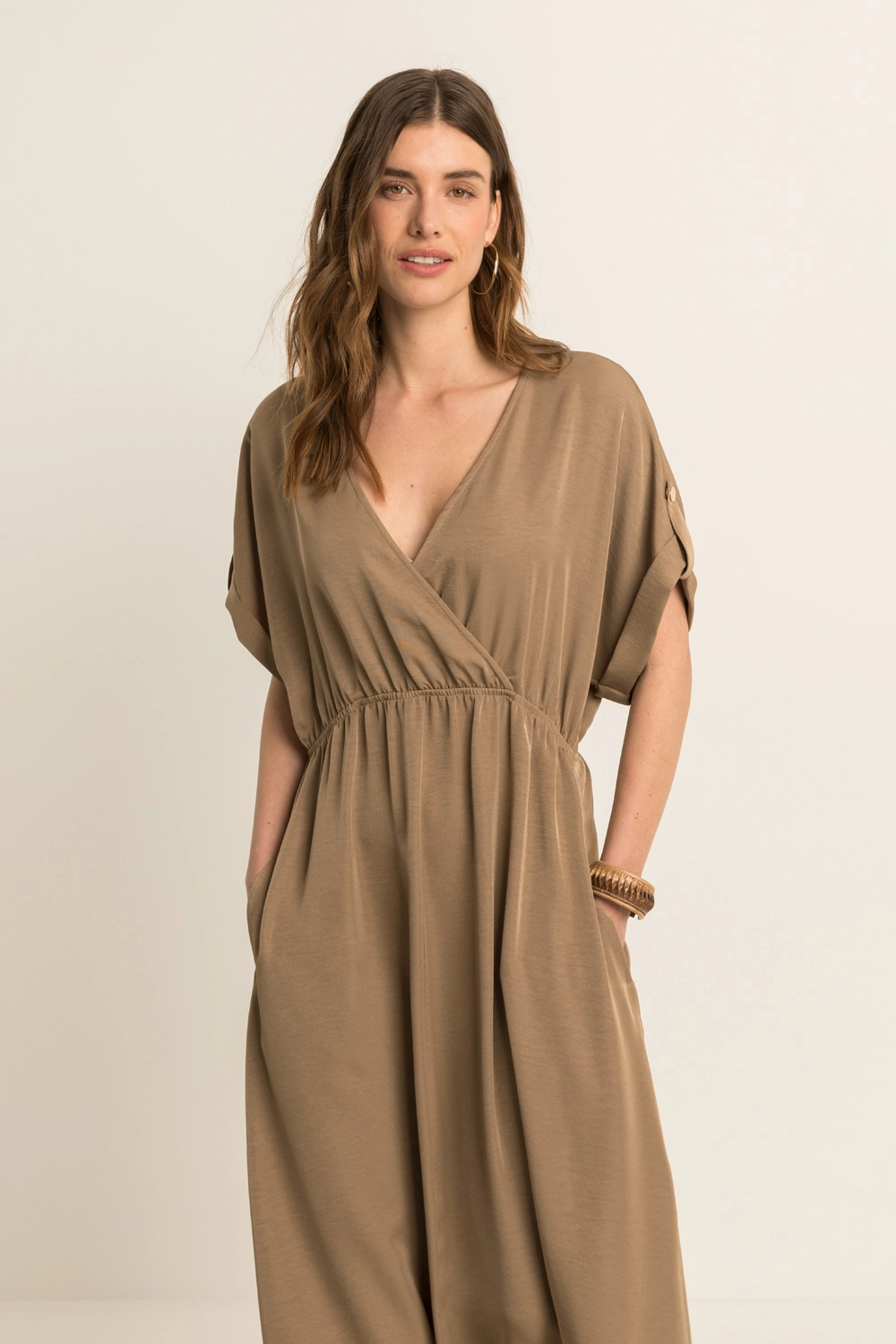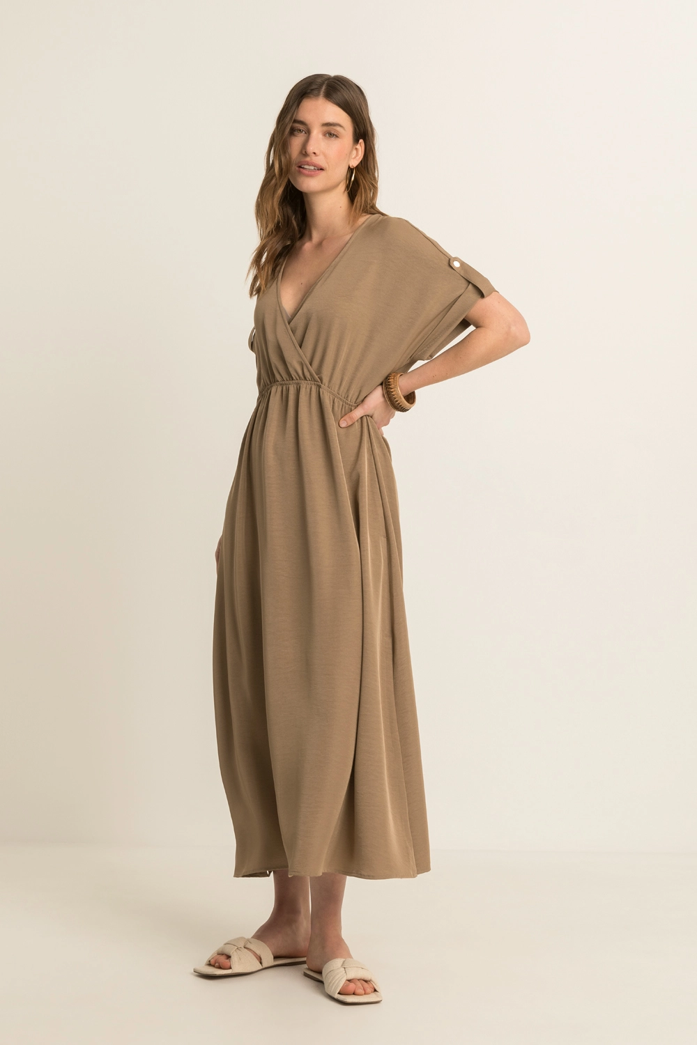 Bruine jurk – soepelvallende kwaliteit met een subtiele glans en een elegante, luchtige uitstraling. Lang en vrouwelijk vallend, met een overslag V-hals, korte aangeknipte mouwen en een elastische taille die het silhouet mooi accentueert. De soepele stof beweegt verfijnd mee en zorgt voor een comfortabele fit, terwijl de cleane belijning deze jurk een moderne, stijlvolle uitstraling geeft.