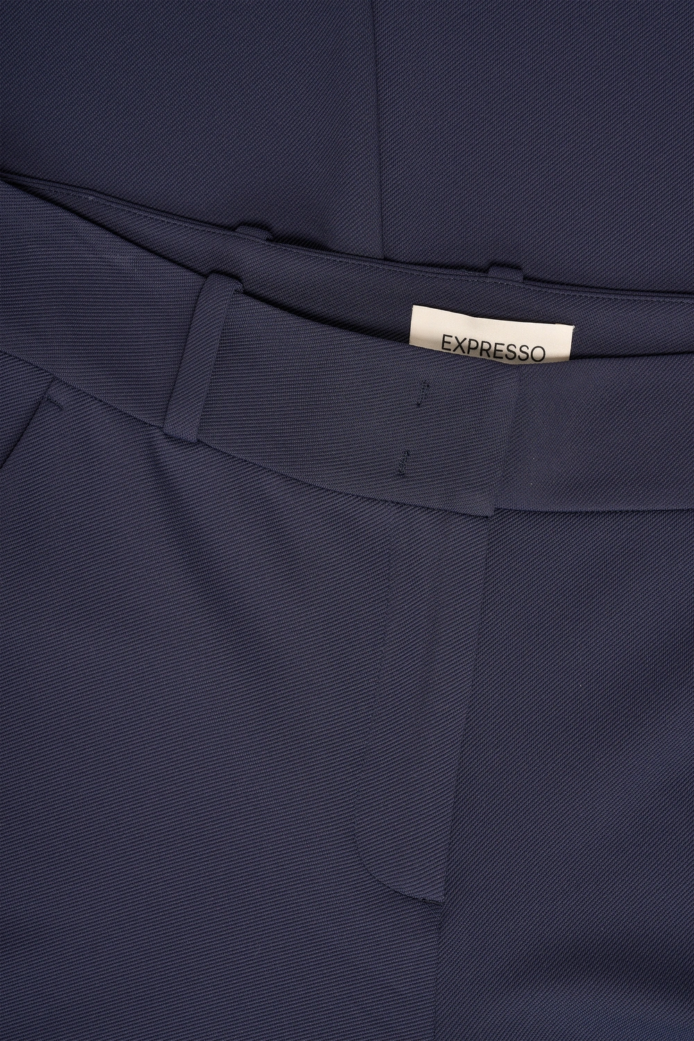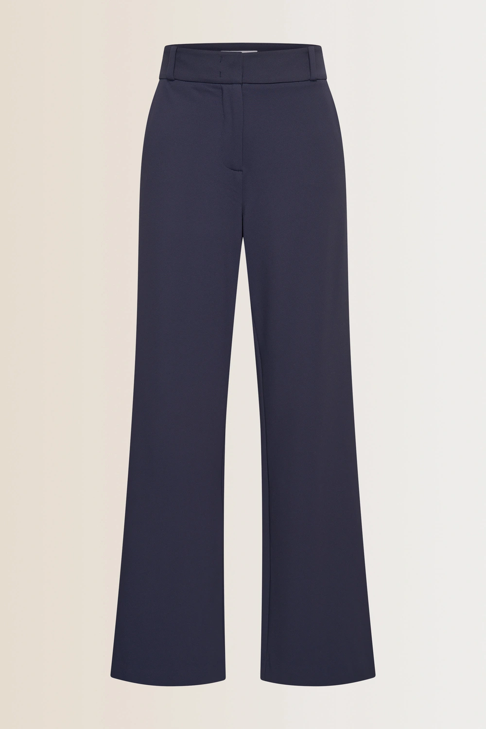 Donkerblauwe pantalon – gladde stretchstof met elegante valling. De flatterende, rechte pijp en clean afwerking geven een moderne twist aan je garderobe. Dankzij de comfortabele stretch en stevige tailleband zit hij de hele dag perfect. Draag met een witte blouse en sneakers voor een casual chic look.