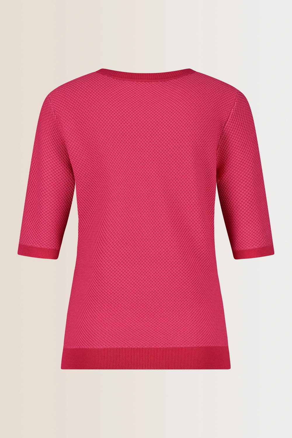 Magentaroze trui – viscosemix. Semi-fitted, ronde hals, mouwlengte tot de elleboog. Jacquardbreisel met honingraatstructuur, ton sur ton gemêleerd, effen boorden. Voelt zwaar en glad aan, kleedt mooi af. Past bij elk type broek of rok, van relaxed-fit tot flared.