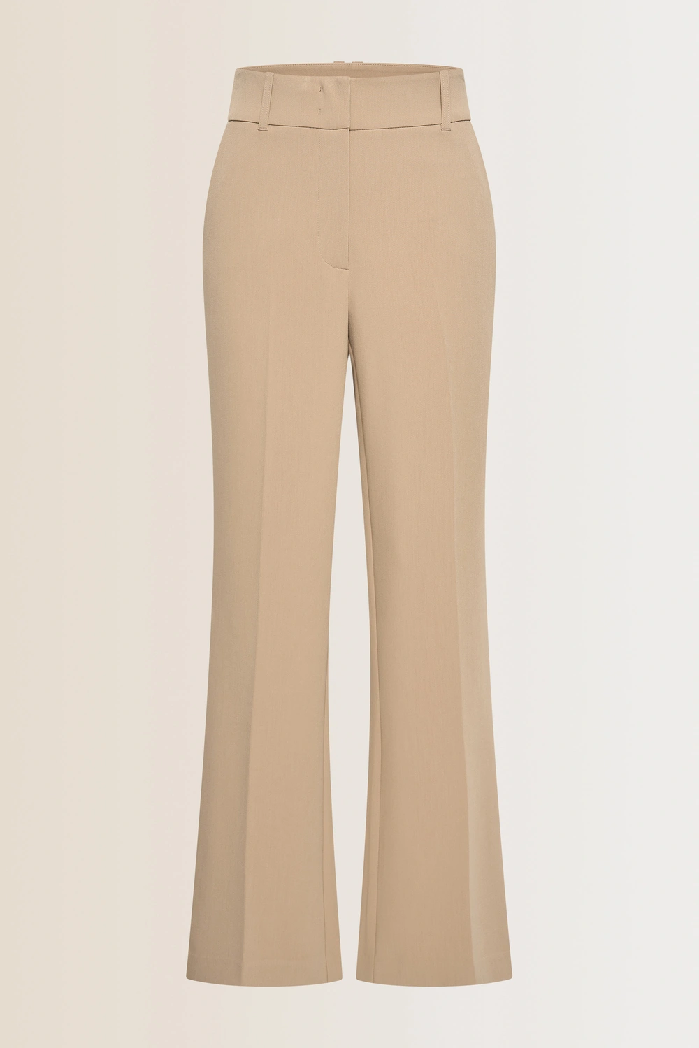 Camelkleurige pantalon – luxe stretchkwaliteit met een elegante valling. Deze pantalon heeft een tijdloos recht model met subtiele flare, wat zorgt voor een flatterend silhouet. De hoge taille en persvouwen benadrukken de lange, slanke lijn, terwijl de zachte stretchstof ultiem draagcomfort biedt. Perfect voor zakelijke looks met een blazer, of casual chic met een gebreide trui en loafers.