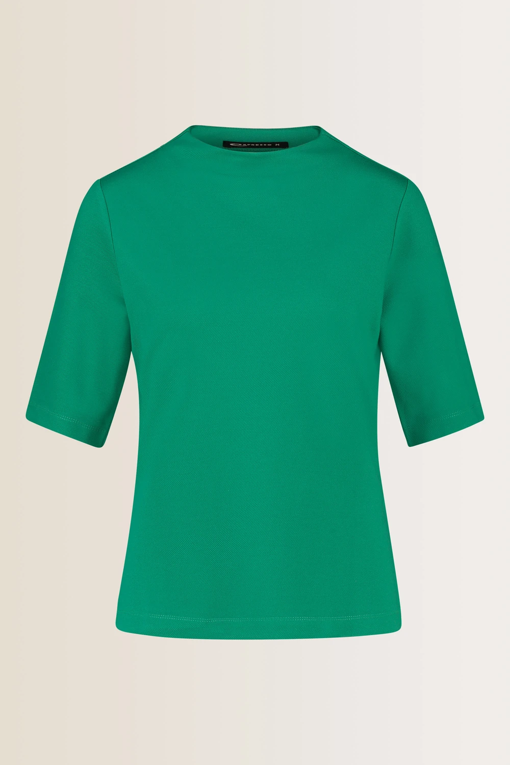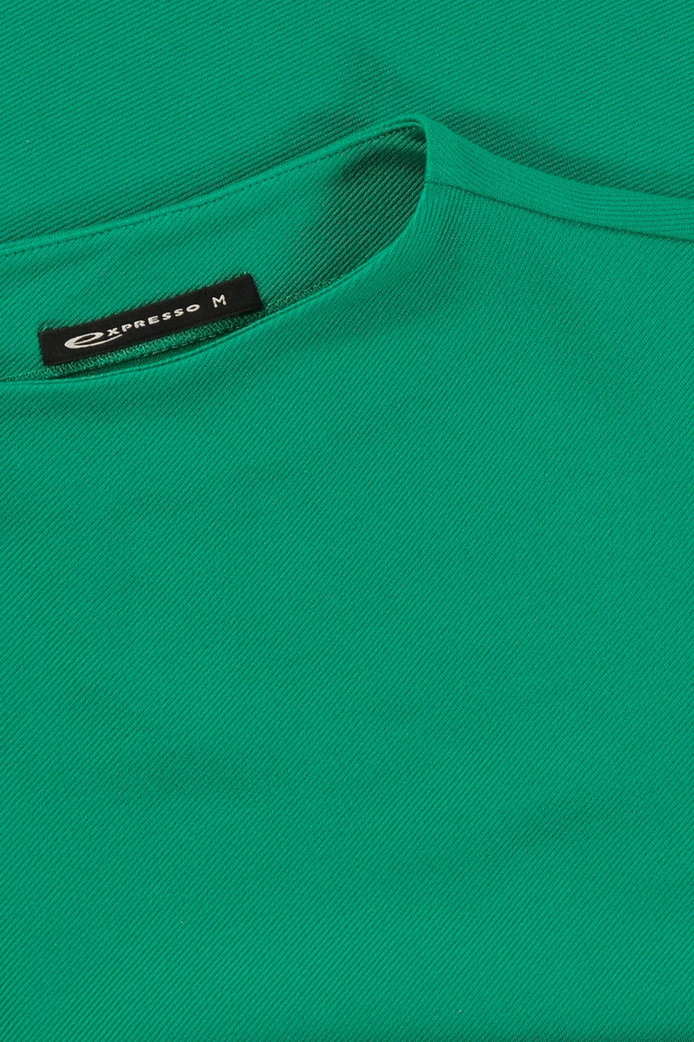 Flessengroene sweatertop – stretch viscosemix. Zeer licht getailleerd, hooggesloten ‘mock neck’, halflange mouwen. Zwaarvallende jersey met twill-structuur. Vormt een minimal-chique all-in-one set met de bijpassende broek.
