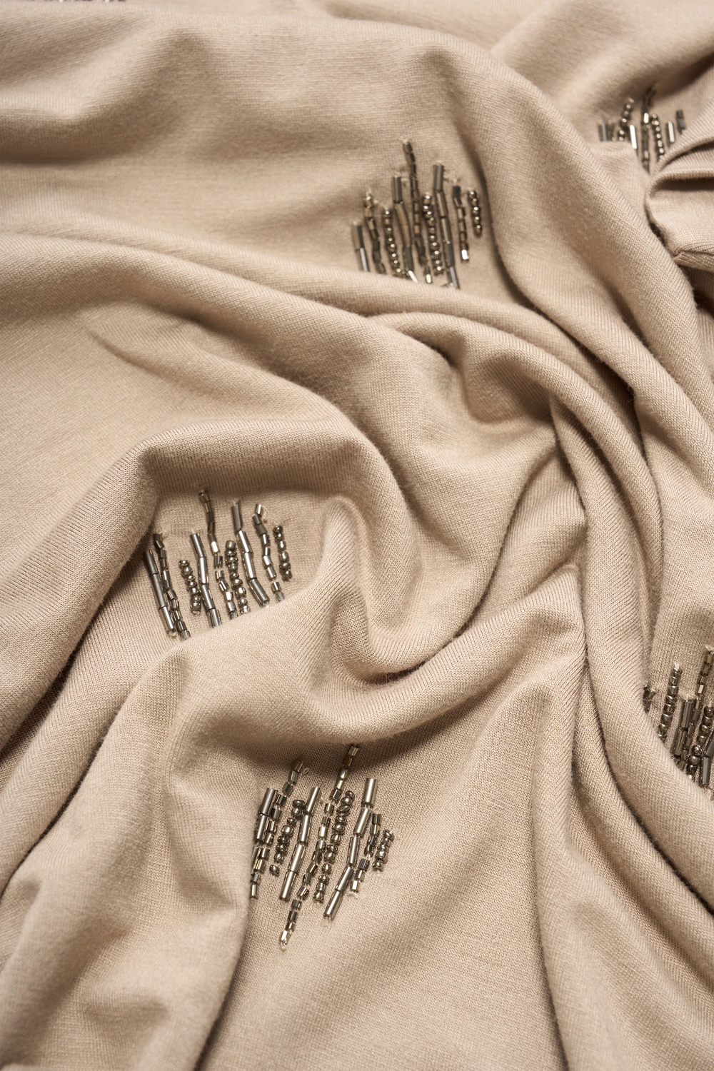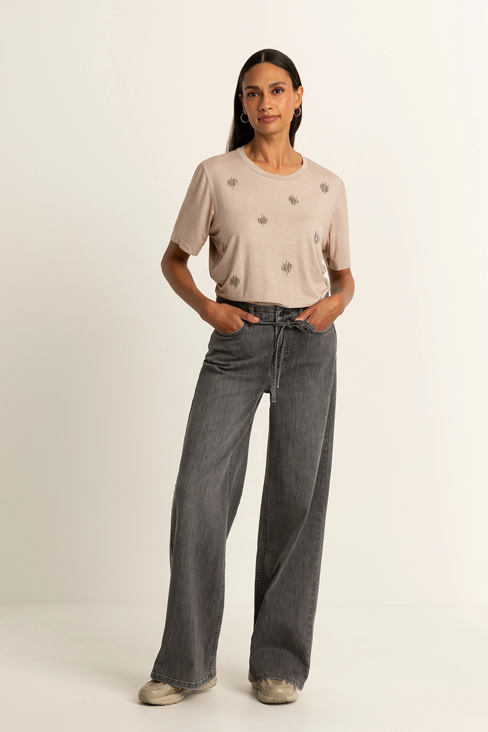 Ecru T-shirt – Comfortabel en zacht met een rechte pasvorm en ronde hals. De subtiele steentjesversiering aan de voorkant zorgt voor een vrouwelijke, feestelijke touch. Mooi op een coated broek of rok voor een elegante look met een vleugje glamour.