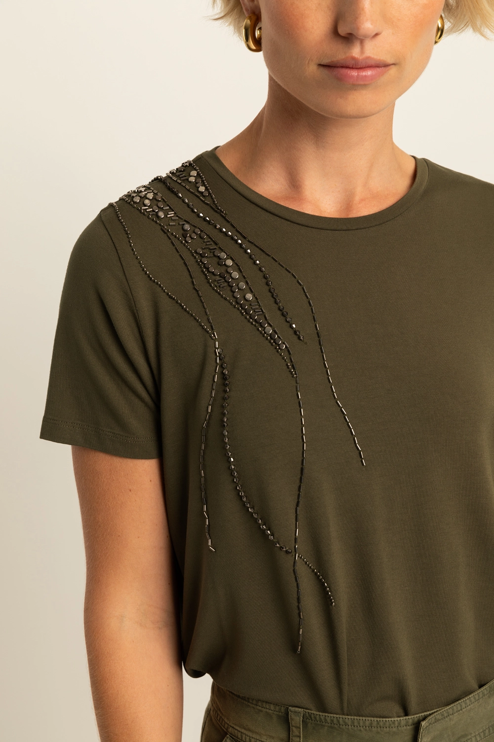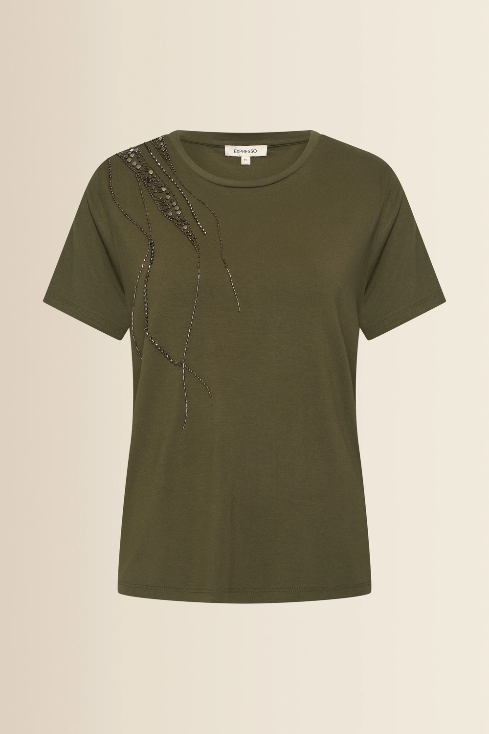 Olijfgroen T-shirt – comfortabele jersey met een verfijnd kraal- en paillettenborduursel op de schouder voor een subtiel statement. Recht en licht aangesloten, met een ronde hals en korte mouwen. De zachte, soepele kwaliteit draagt prettig en maakt dit shirt perfect voor elke dag, terwijl het detail zorgt voor een elegante, vrouwelijke twist.