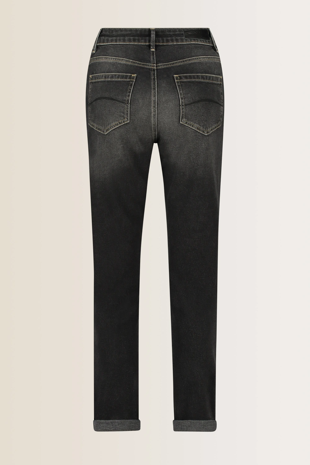 Zwarte 5-pocket jeans – stretchkatoen. ‘Skinny boyfriend’ fit, hogere taille, tapse pijpen. Comfortabele stretchdenim, subtiele wassing. Een fijne basis voor dagelijkse looks. Onze favoriet: black jeans, witte blouse, mouwloze zwarte bouclé blazer met lurex.
