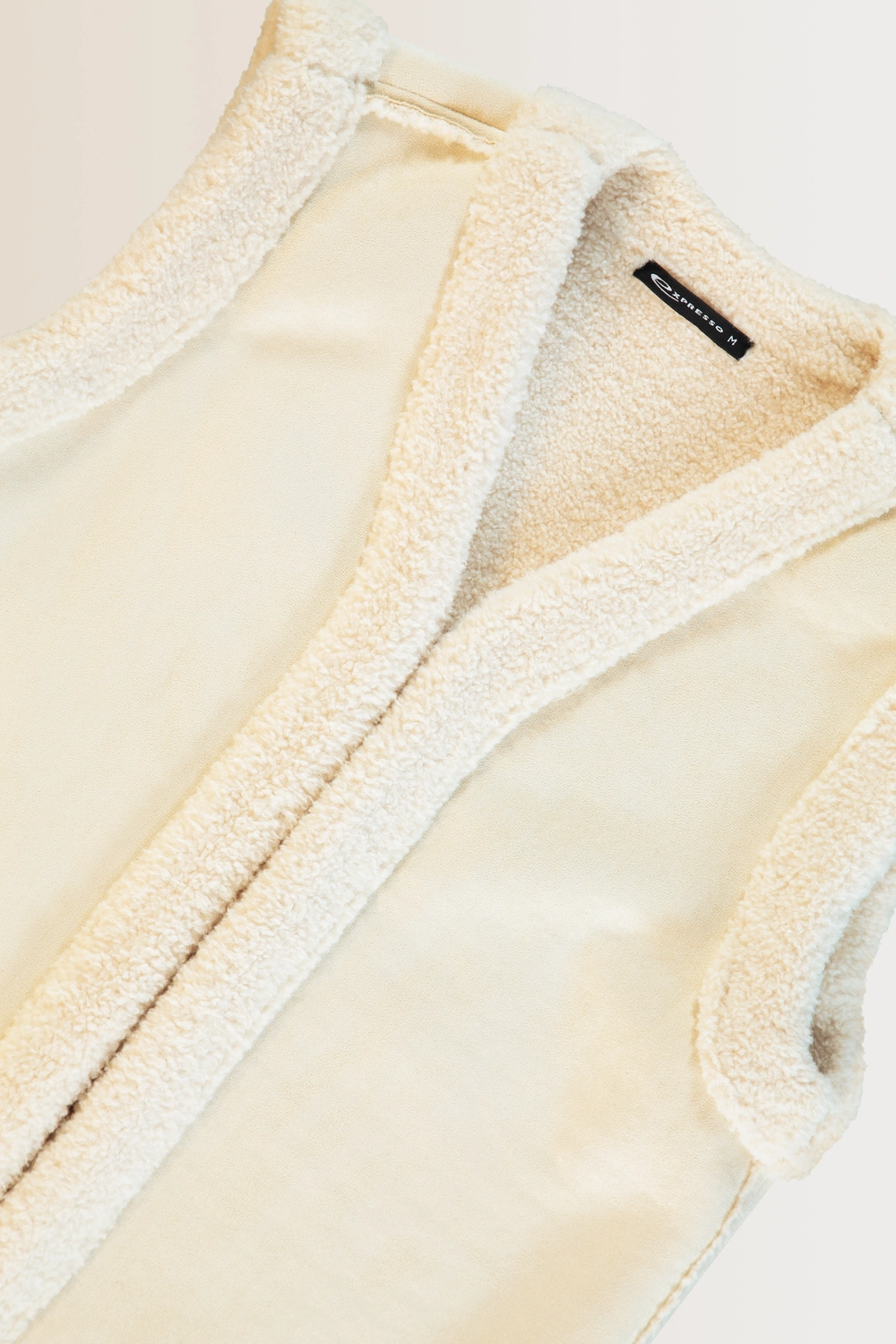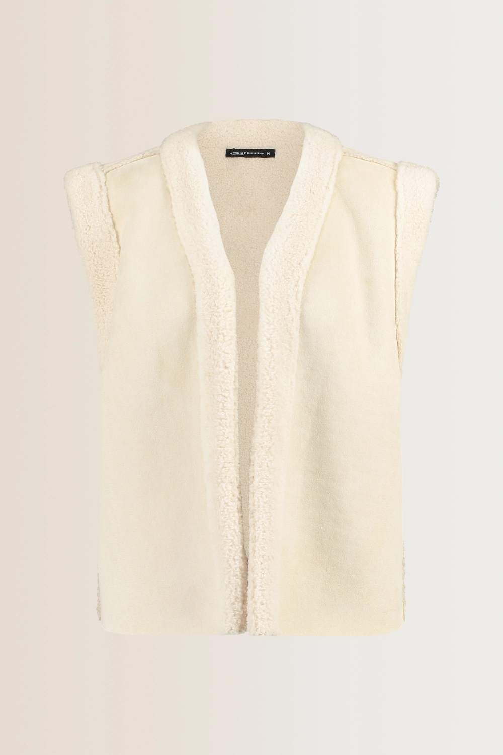 Crèmekleurig teddy gilet– zachte faux-suède buitenkant met een wollige voering. Openvallend model zonder sluiting, recht gesneden en heerlijk comfortabel. De rijke textuur en warme uitstraling maken dit gilet tot een stijlvol laagje voor het najaar, perfect over truien, blouses of jurken.