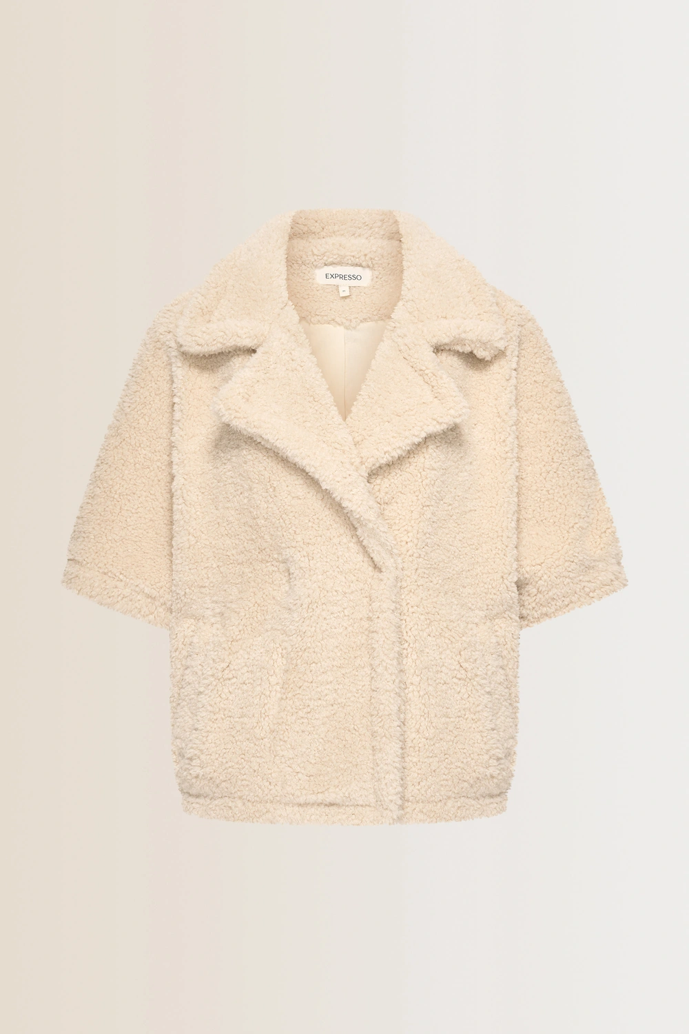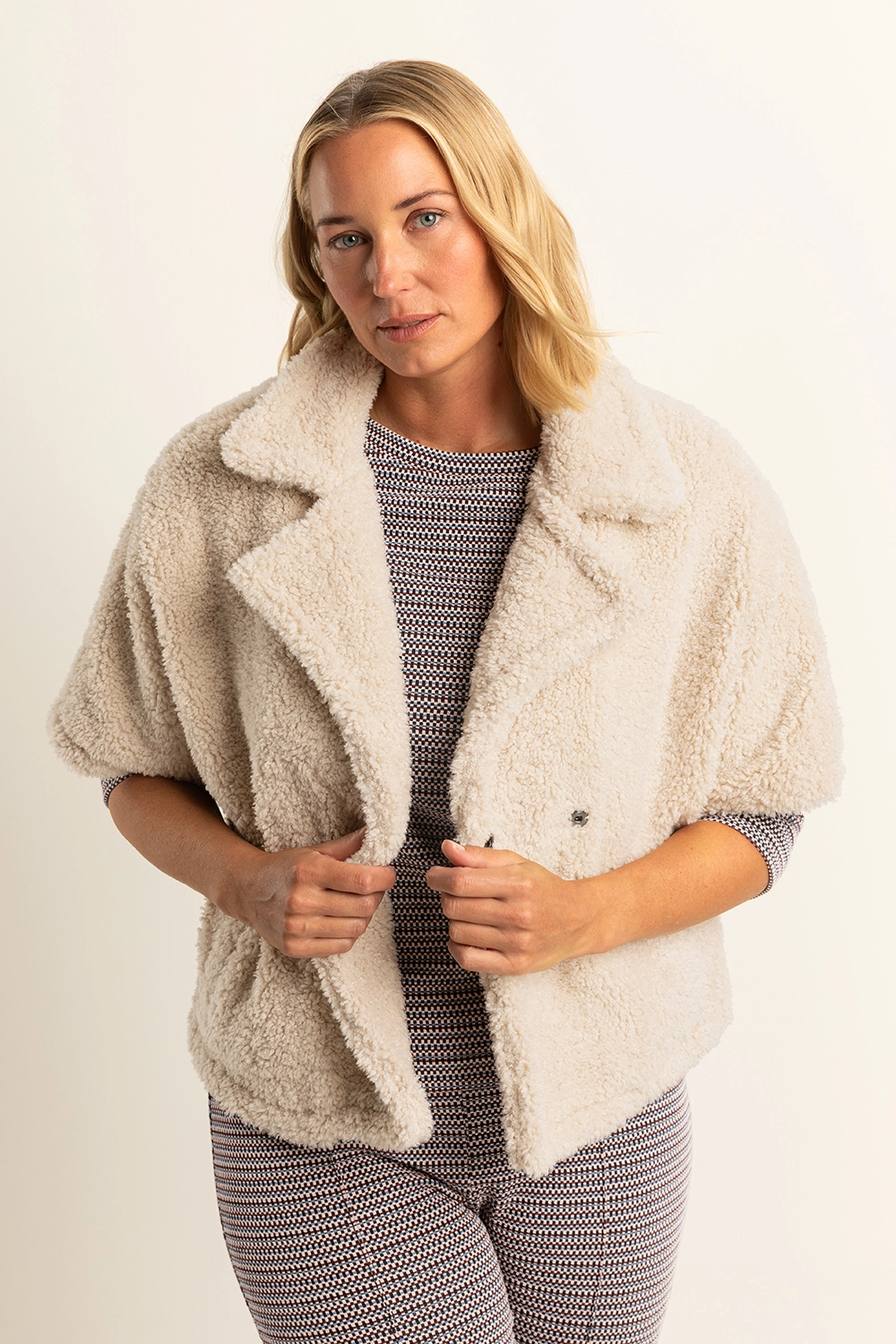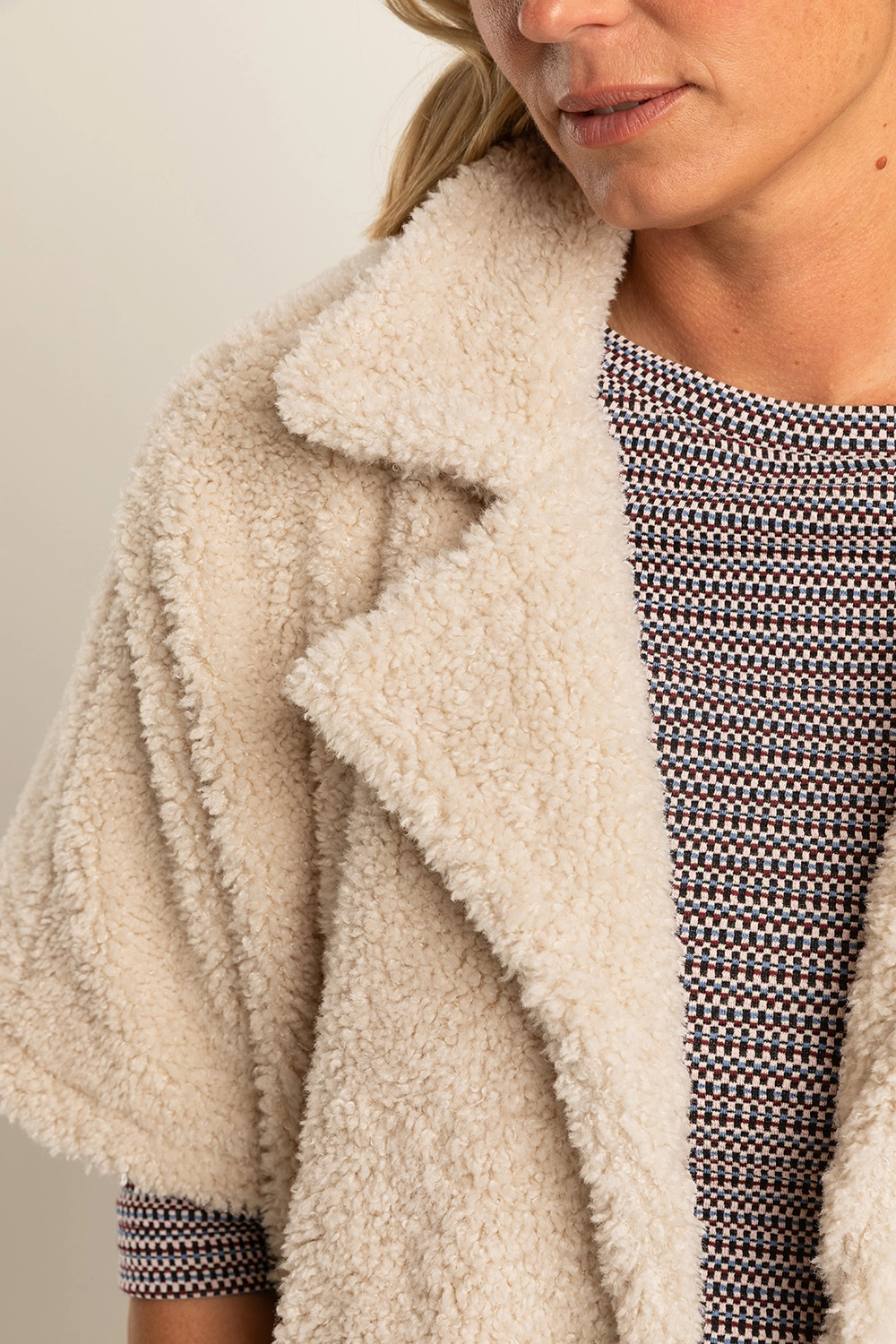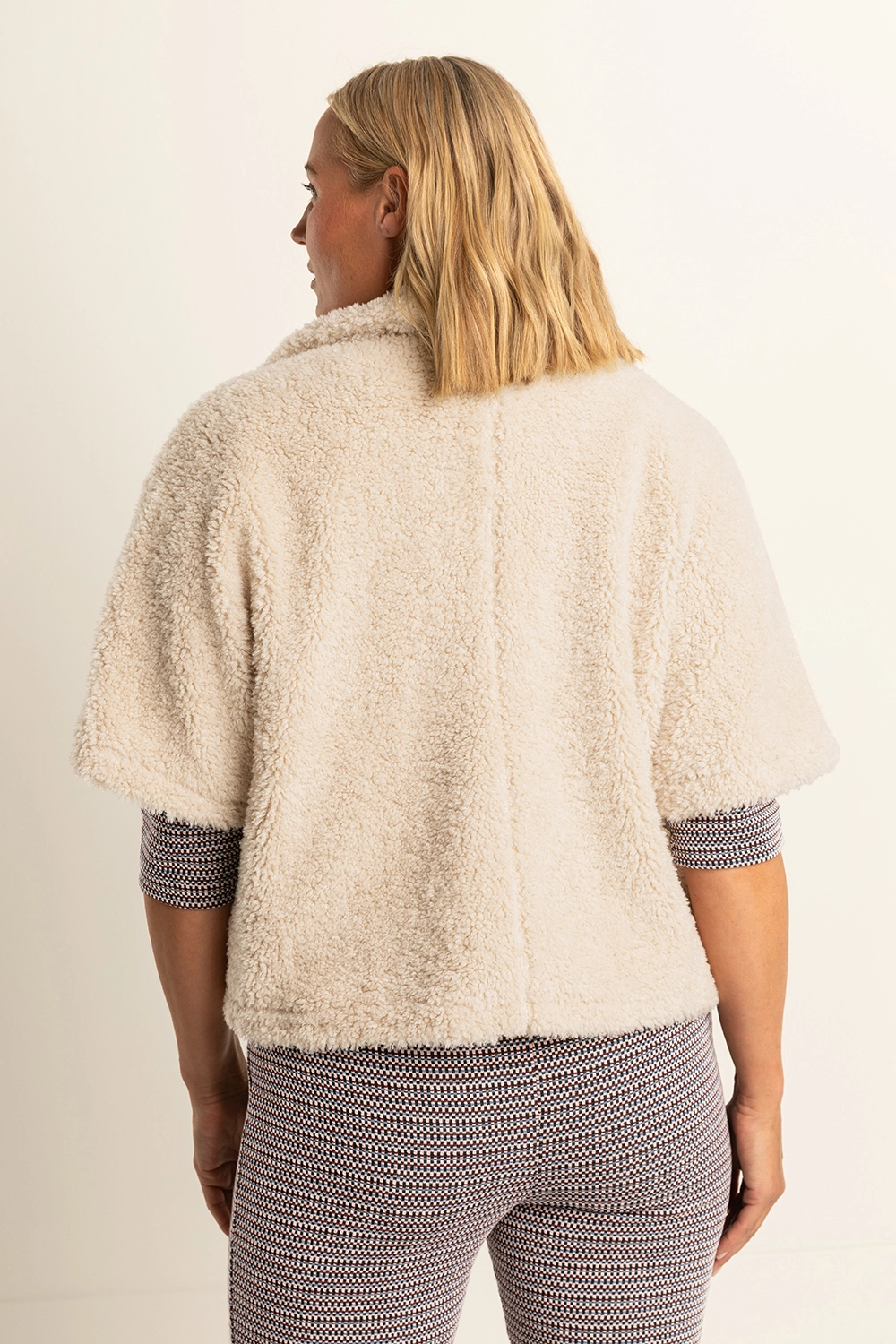 Crèmekleurig jasje – faux shearling. Losvallend, met grote reverskraag en halflange mouwen. Heerlijk zacht en warm, met een teddystructuur die direct een knusse én stijlvolle uitstraling geeft. Draag ‘m nonchalant open over een coltrui en pantalon, of juist als opvallende bovenlaag bij een jurk. Ideaal voor frisse dagen waarop je comfort en mode moeiteloos wilt combineren.