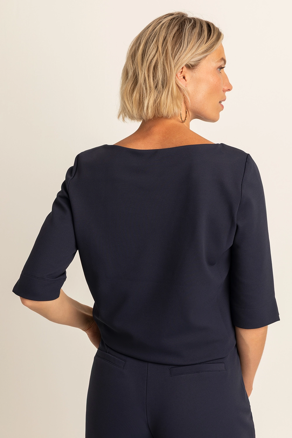 Donkerblauwe top – met een zachte, gladde finish. Semi-aangesloten fit met elegante boothals en driekwart mouwen die lichtjes aansluiten. Deze tijdloze top combineert moeiteloos comfort met een verfijnde uitstraling, perfect voor zowel op kantoor als in het weekend.