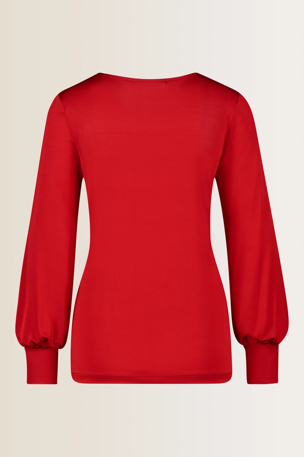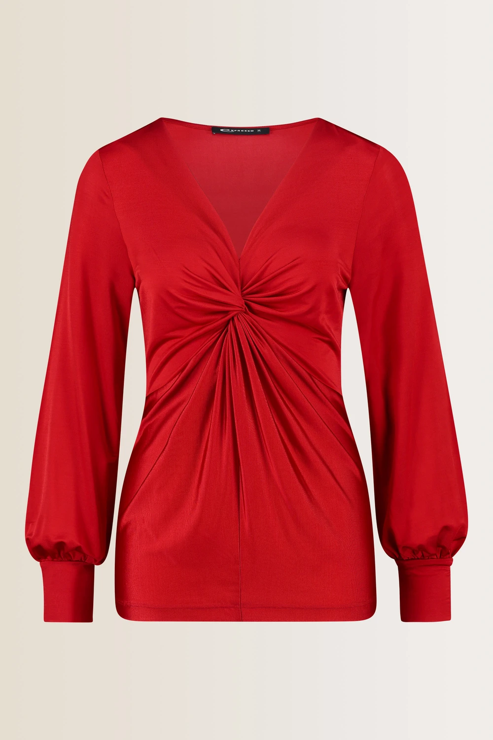 Helderrode top – stretchviscose. Semi-fitted, lage V-hals met draperieplooien, lange mouwen. Gladde, licht glanzende jersey. Chic en vrouwelijk, de gladde stof draagt ook prettig onder een blazer.